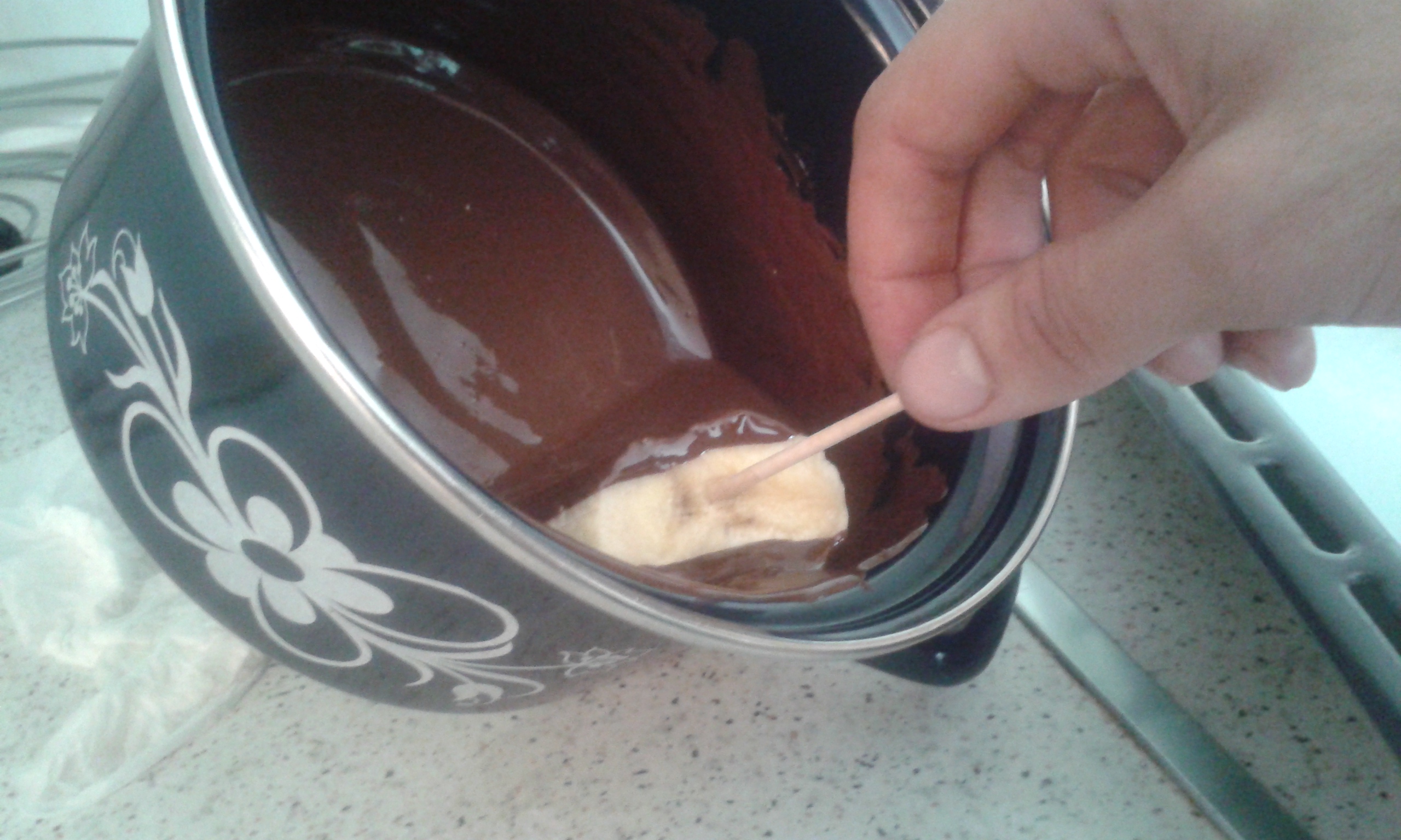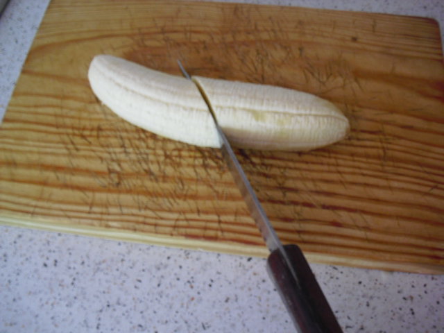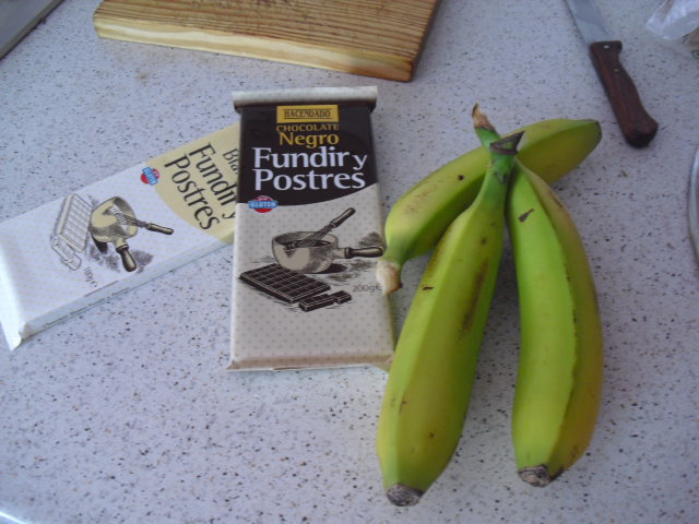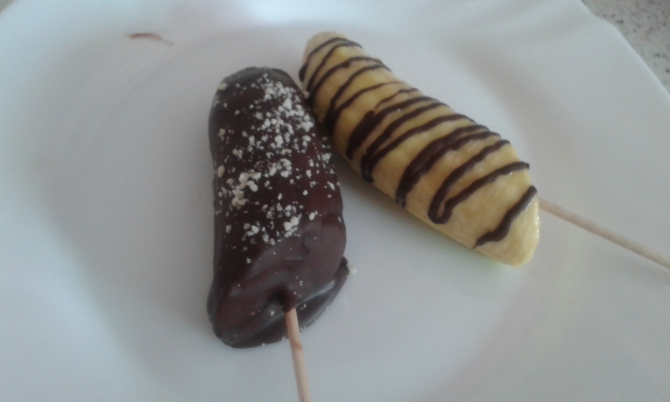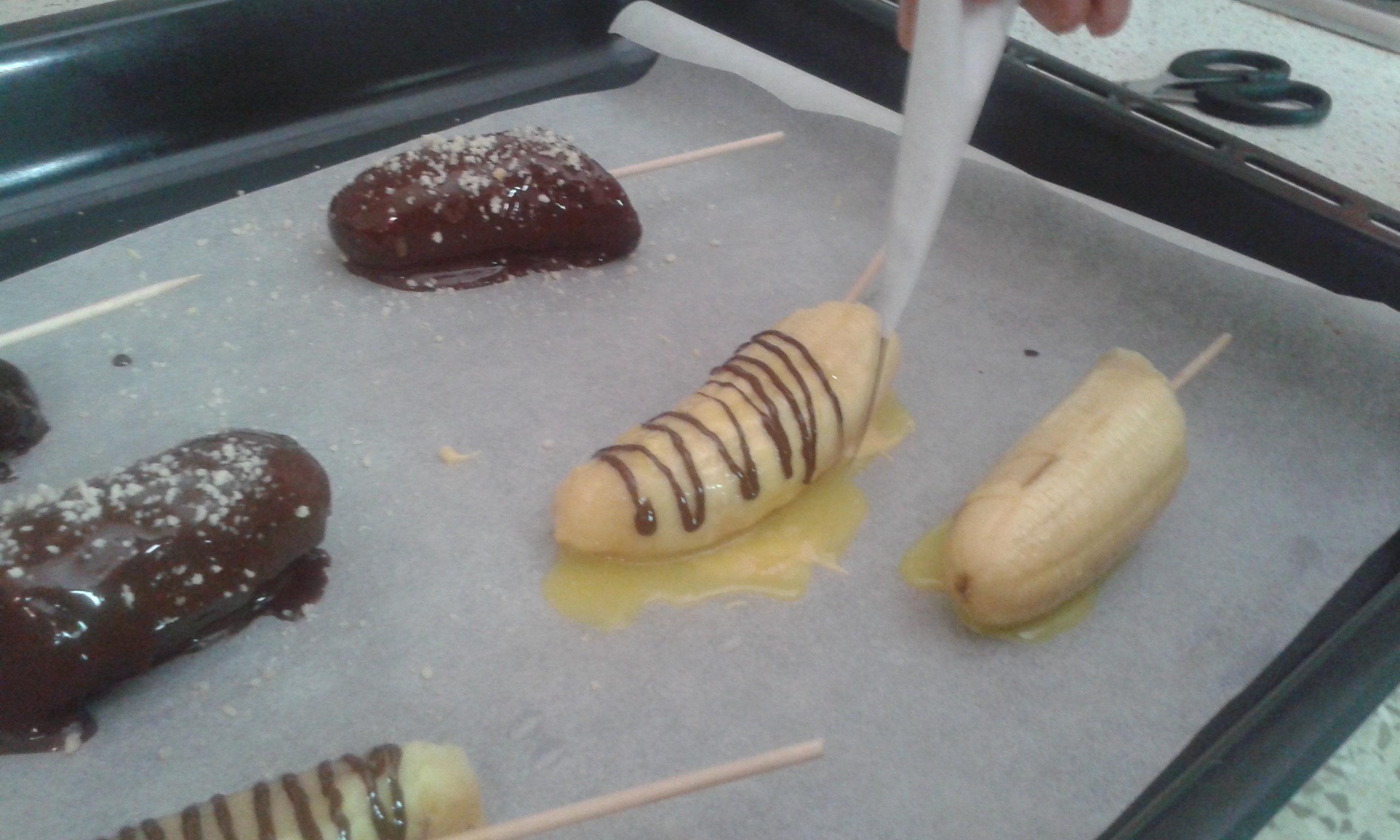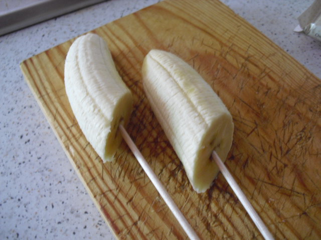 Lo primero que vamos a hacer es pelar los plátanos (cosa más que obvia a no ser que os gusten con cáscara, que para gustos los colores), seguidamente los vamos a cortar a la mitad de forma transversal y a continuación les insertamos en brochetas de madera o de cualquier otro material que tengáis a mano siempre cuando sean de una longitud mediana.