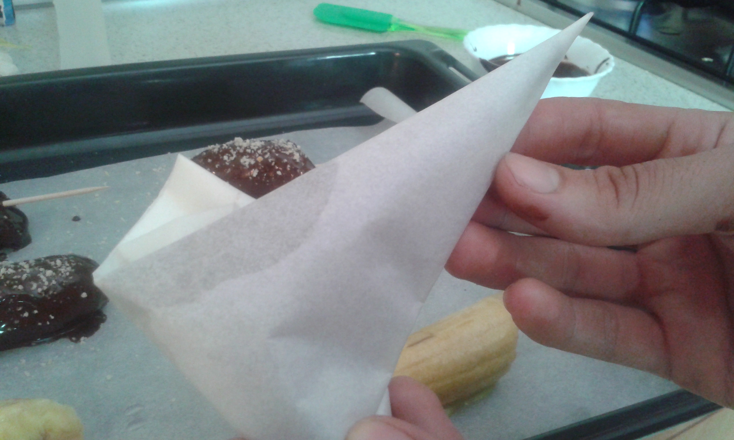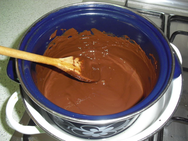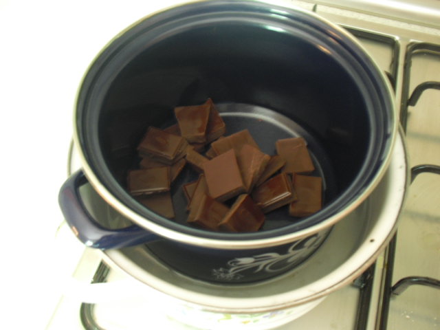 Durante este tiempo iremos deshaciendo los chocolates al baño maría, el orden da igual si el blanco o el negro, eso sí al chocolate negro le añadiremos un chorrito de aceite de oliva para que nos dé más brillo y al blanco un poquito de leche para que no nos quede tan espeso y a su vez unas gotas de colorante alimentario amarillo para darle un poco de color.
