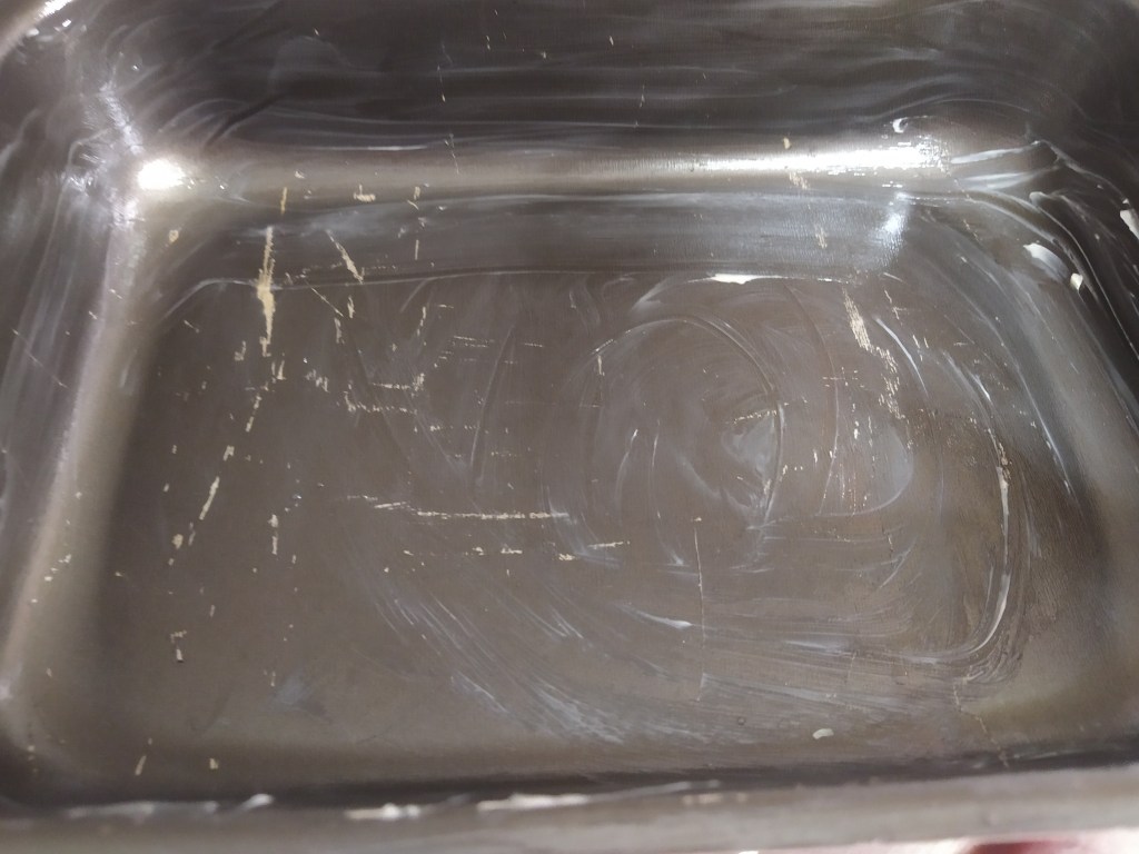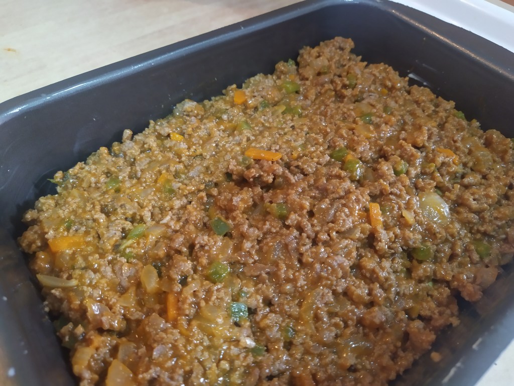 ¡Ya queda menos! Seguidamente vamos a montar la Moussaka, para ello, vamos a engrasar un molde, de la forma que más os guste, con un poquito de mantequilla y añadiremos parte del tomate frito que no pusimos en la carne (unos 50 grs más o menos). A continuación, añadiremos una primera capa de berenjenas, una base de carne, otra de berenjenas, otra de carne y naparemos con la bechamel en caliente ¡Cuidadito con las quemaduras!