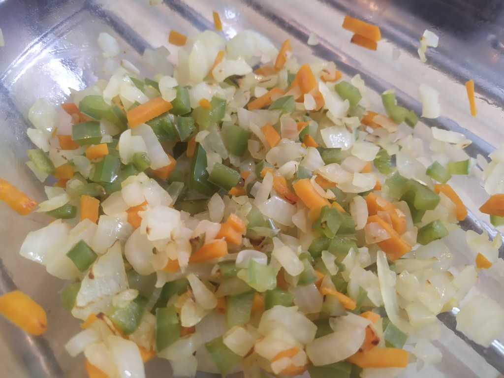 Mientras dejamos a remojo las berenjenas vamos a ir elaborando el relleno. Para ello primero vamos a picar la verdura en brunoise (trozos pequeñitos) y las vamos a rehogar con un poquito de aceite de oliva en este orden: zanahoria, pimiento y cebolla, hasta que estén un poquito blandas (unos 5 minutos), retiramos del fuego y reservamos.