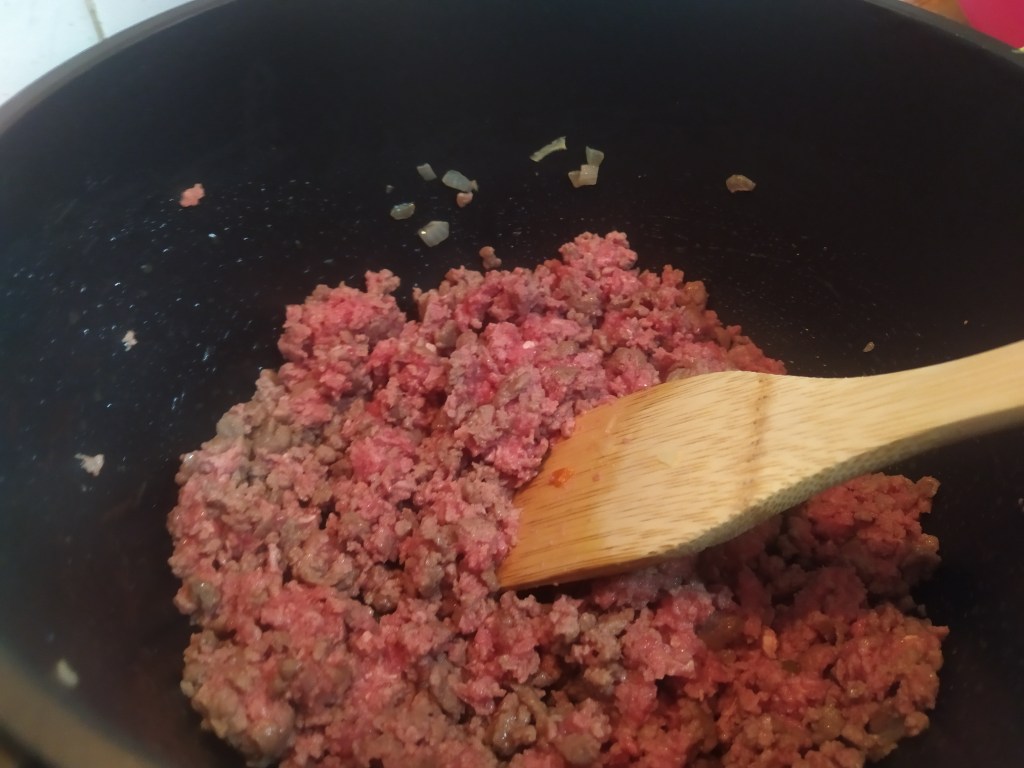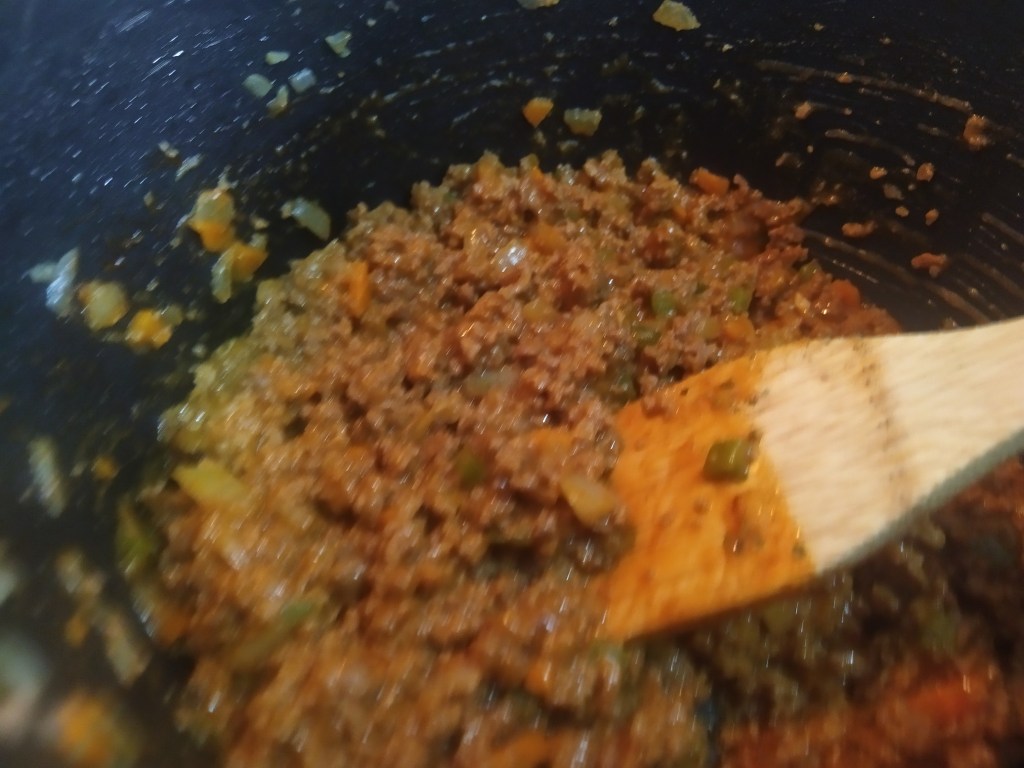 Ahora añadiremos la carne en la misma sartén/olla donde hemos rehogados las verduras. Removemos y cuando empiece a dorarse añadiremos la verdura. Volvemos a remover y aderezamos con las especias (salvo la nuez moscada) a nuestro gusto. Acto seguido añadiremos el chorrito de vino blanco y dejaremos cocer a fuego medio durante unos 5 minutos para que se evapore el alcohol.