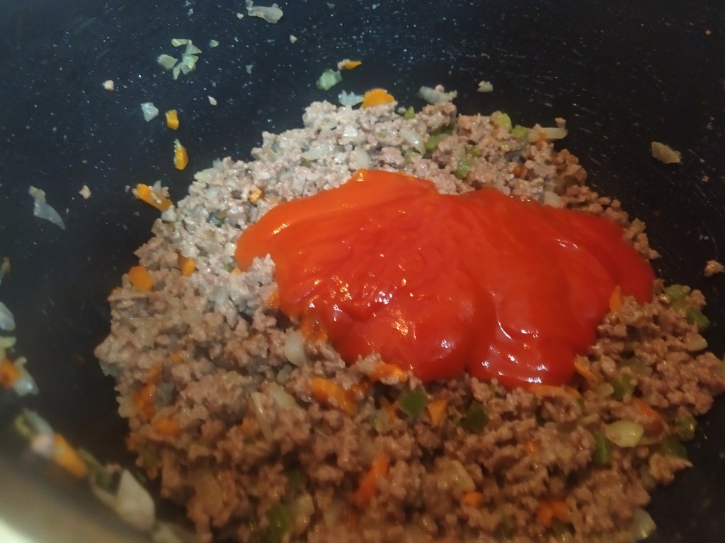 Ya evaporado añadiremos el tomate frito, pero dejando algo reservado para el montaje, removemos y dejaremos cocer durante unos 15 minutos a fuego bajo, sin dejar de remover. Si vemos que queda un poco seco podemos añadir un chorrito de agua.