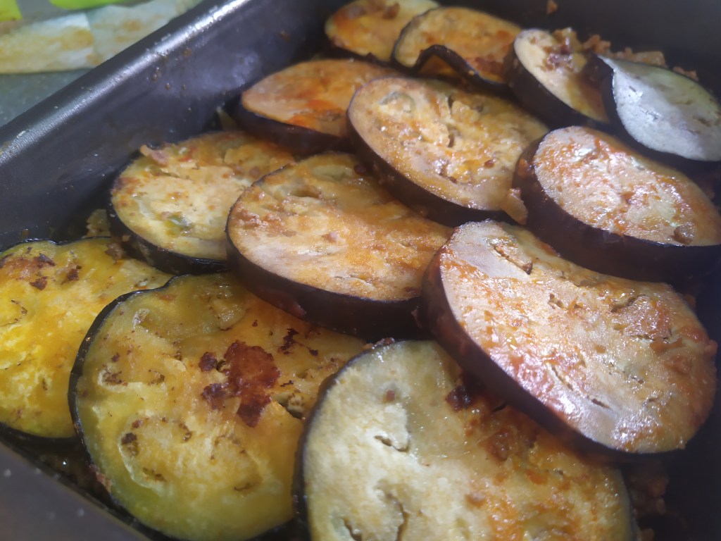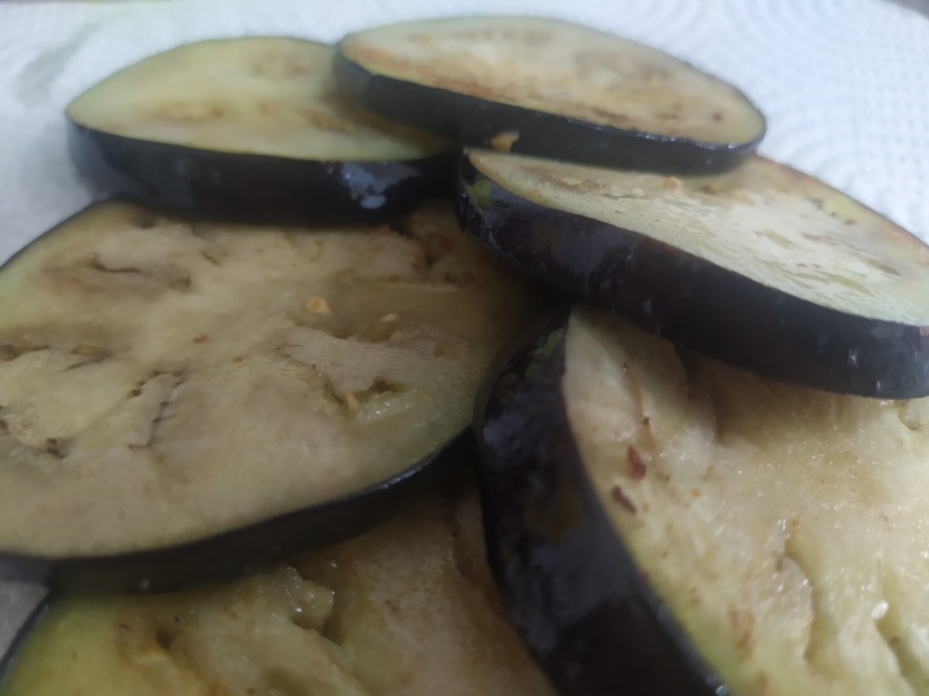 Mientras la carne se va haciendo, aprovecharemos para dorar las berenjenas con un poquito de aceite, por ambos lados, para que queden blanditas. Retiramos y reservamos.