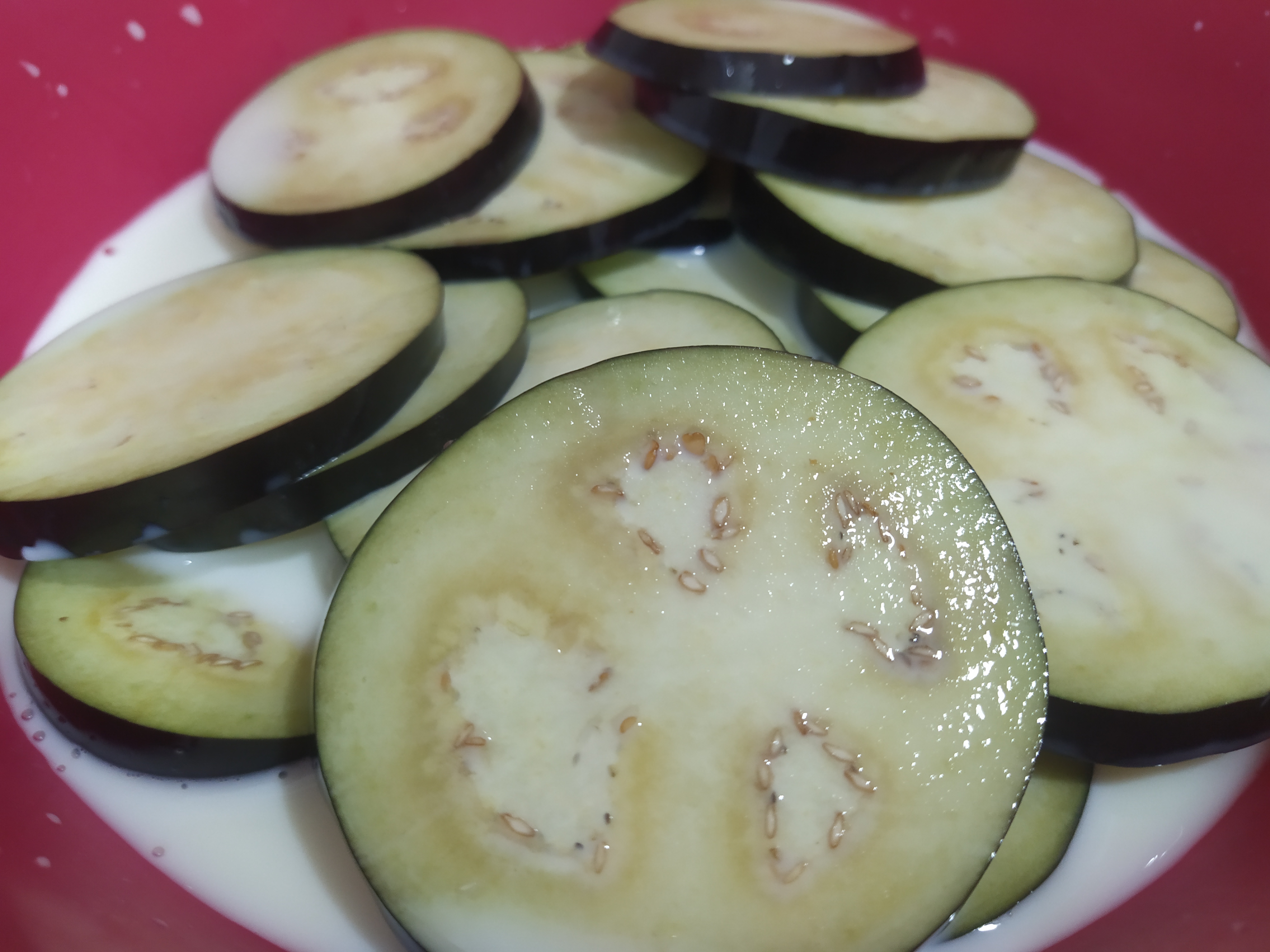 Una vez haya pasado el tiempo, vamos a escurrir las rodajas y las secaremos con papel de cocina absorbente. No vamos a tirar la leche donde se han macerado las berenjenas, si no que vamos a aprovecharla para hacer después la bechamel. Reservamos.