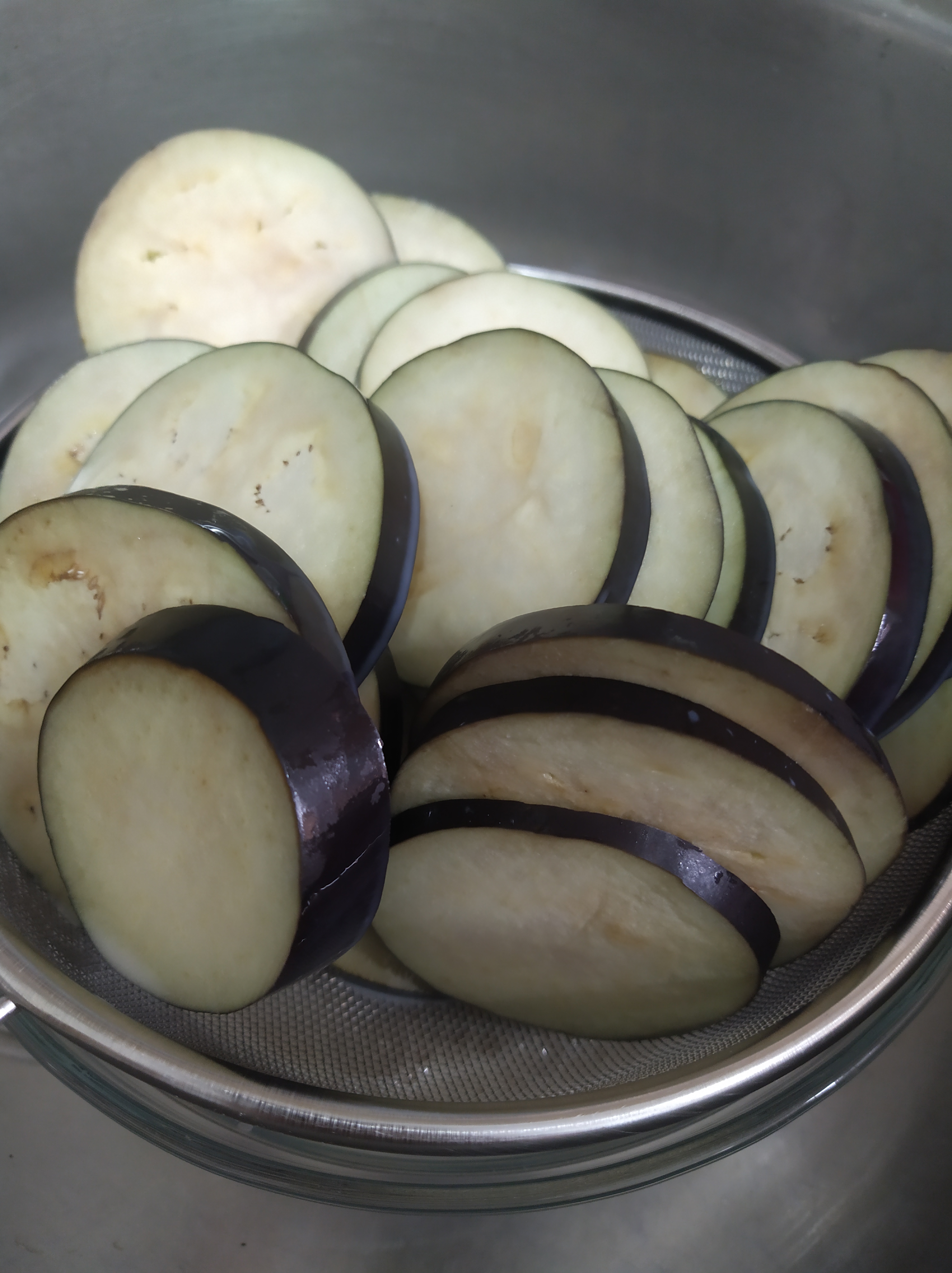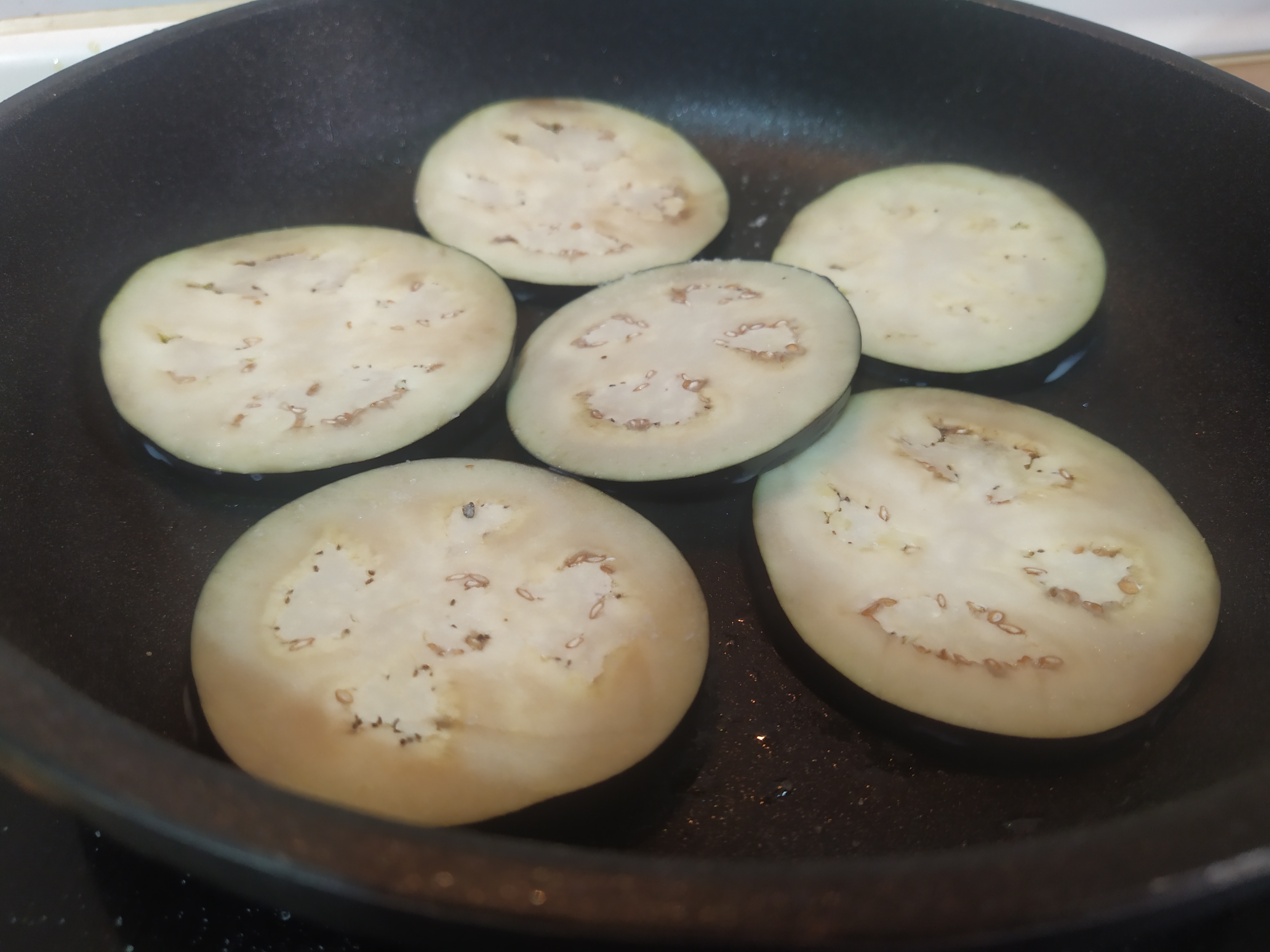 Mientras la carne se va haciendo, aprovecharemos para dorar las berenjenas con un poquito de aceite, por ambos lados, para que queden blanditas. Retiramos y reservamos.