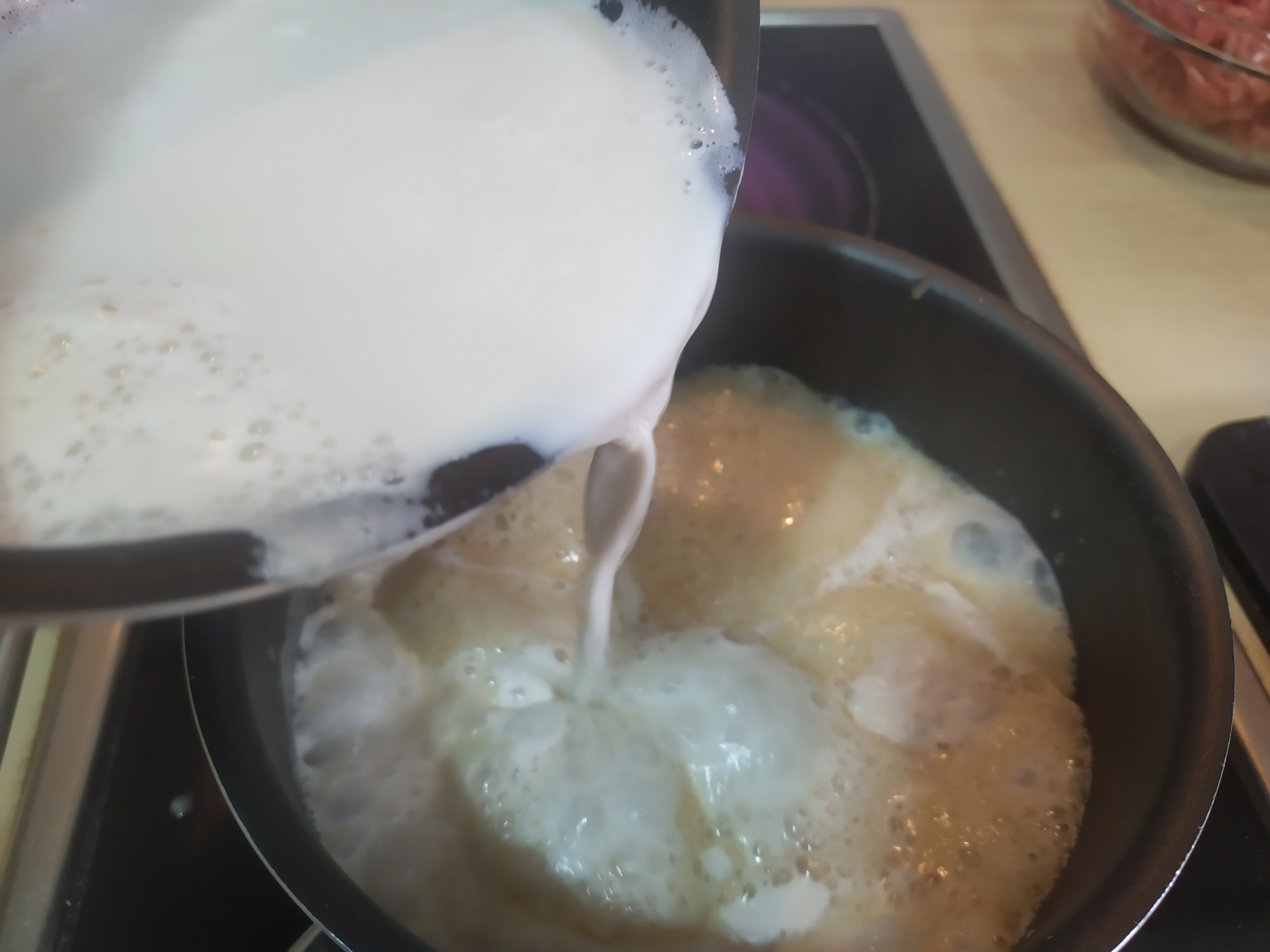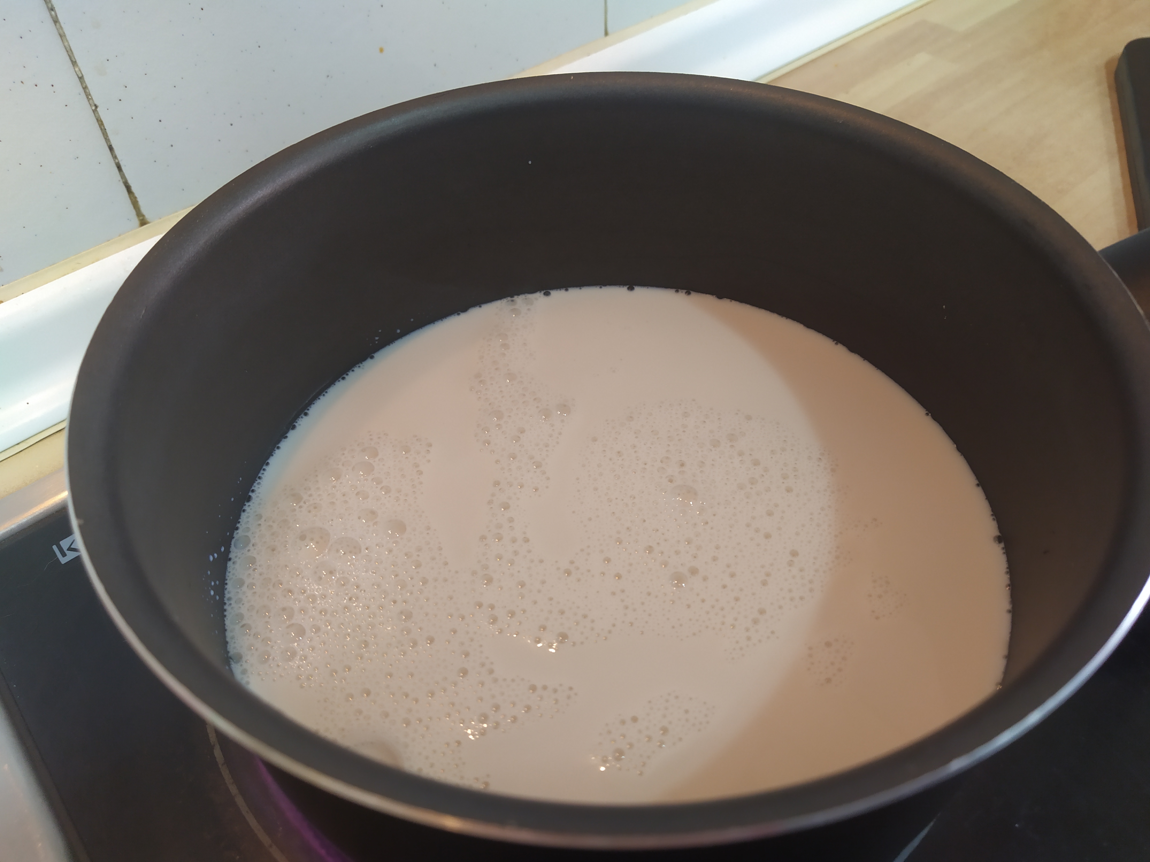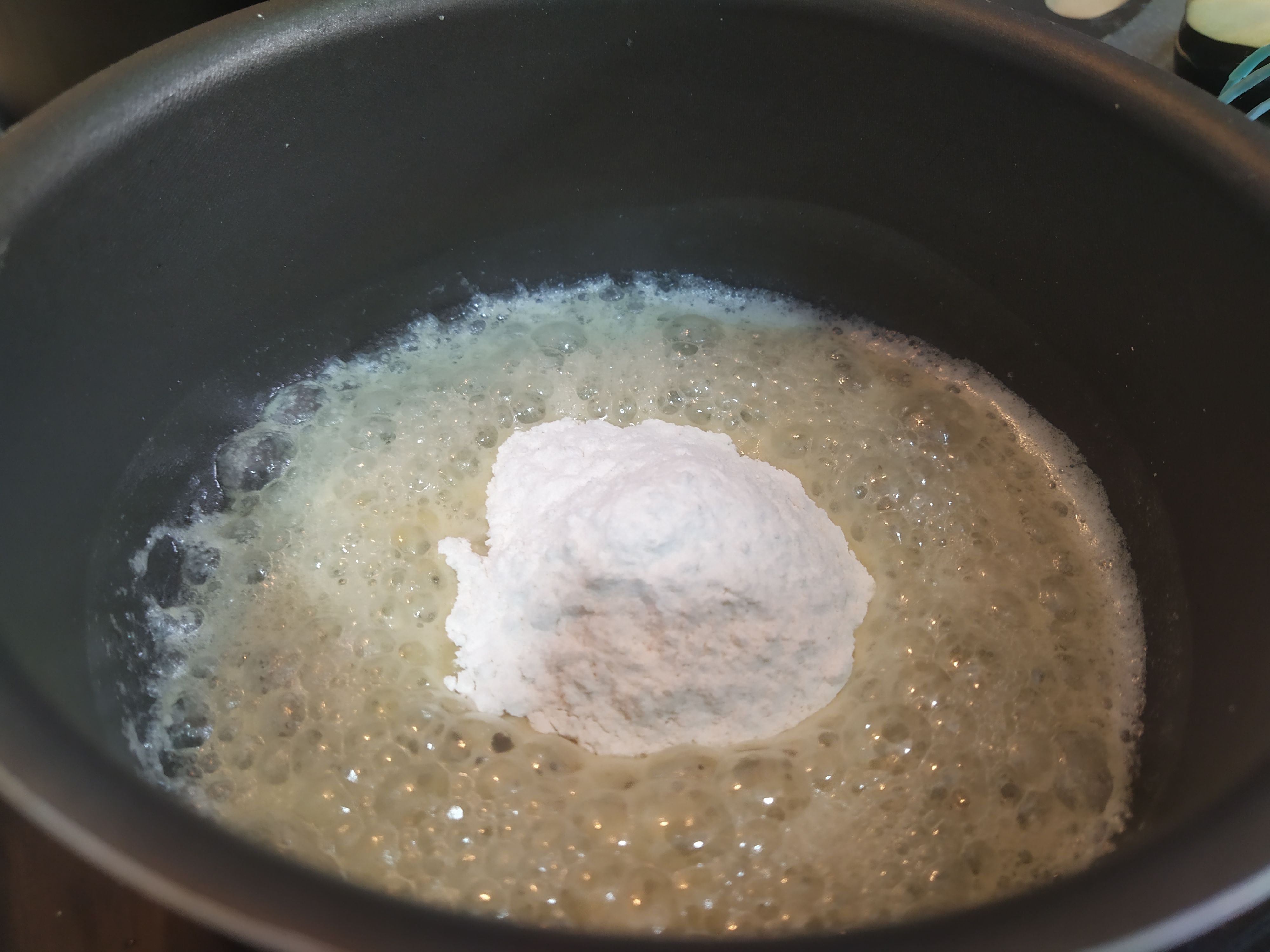 Ahora nos toca hacer la bechamel en lo que los demás ingredientes reposan y se hacen. Para ello vamos a poner a cocer la leche donde dejamos desangrar las berenjenas anteriormente (¡que aquí no se tira nada!) hasta que empiece a hervir.