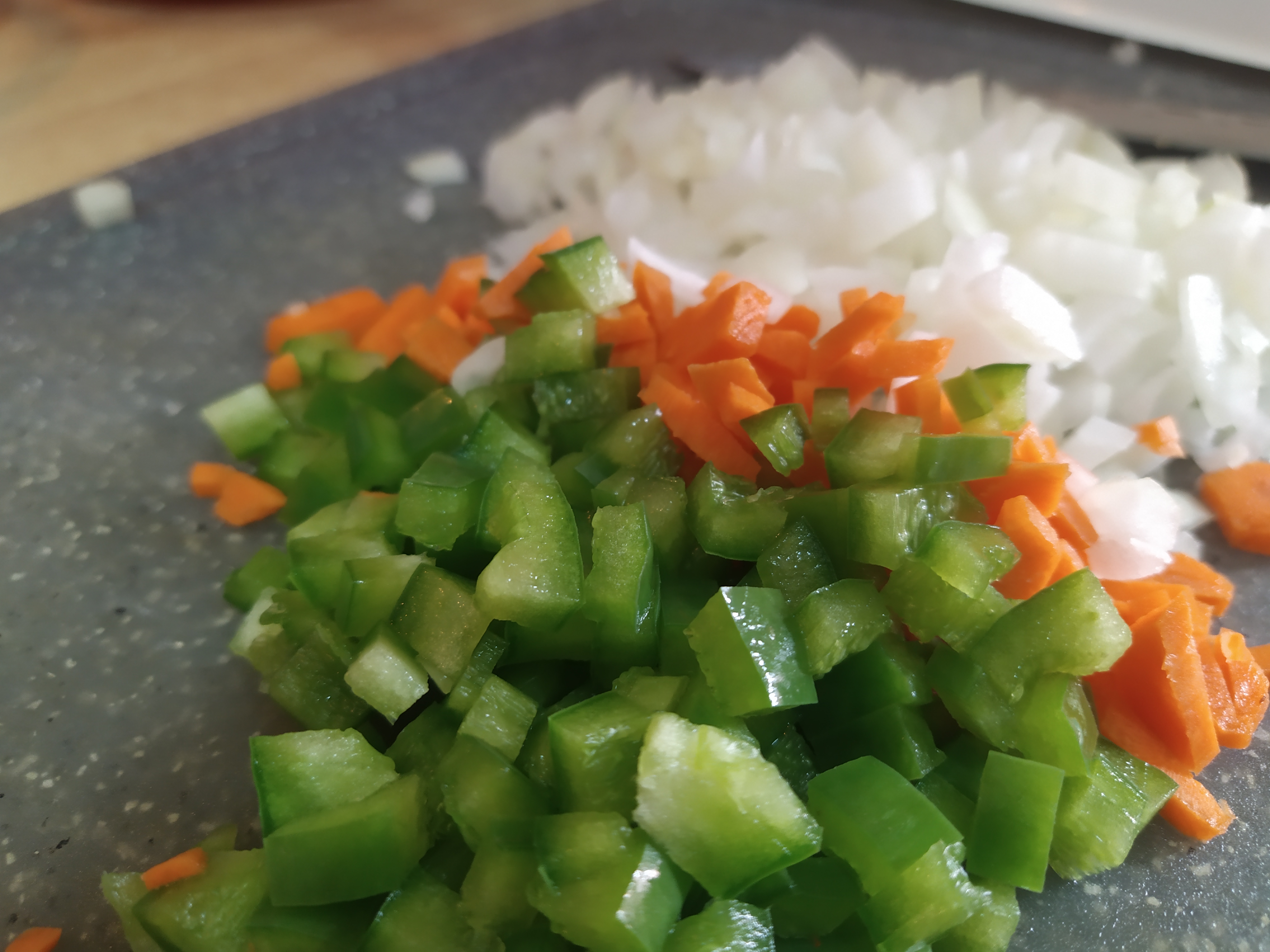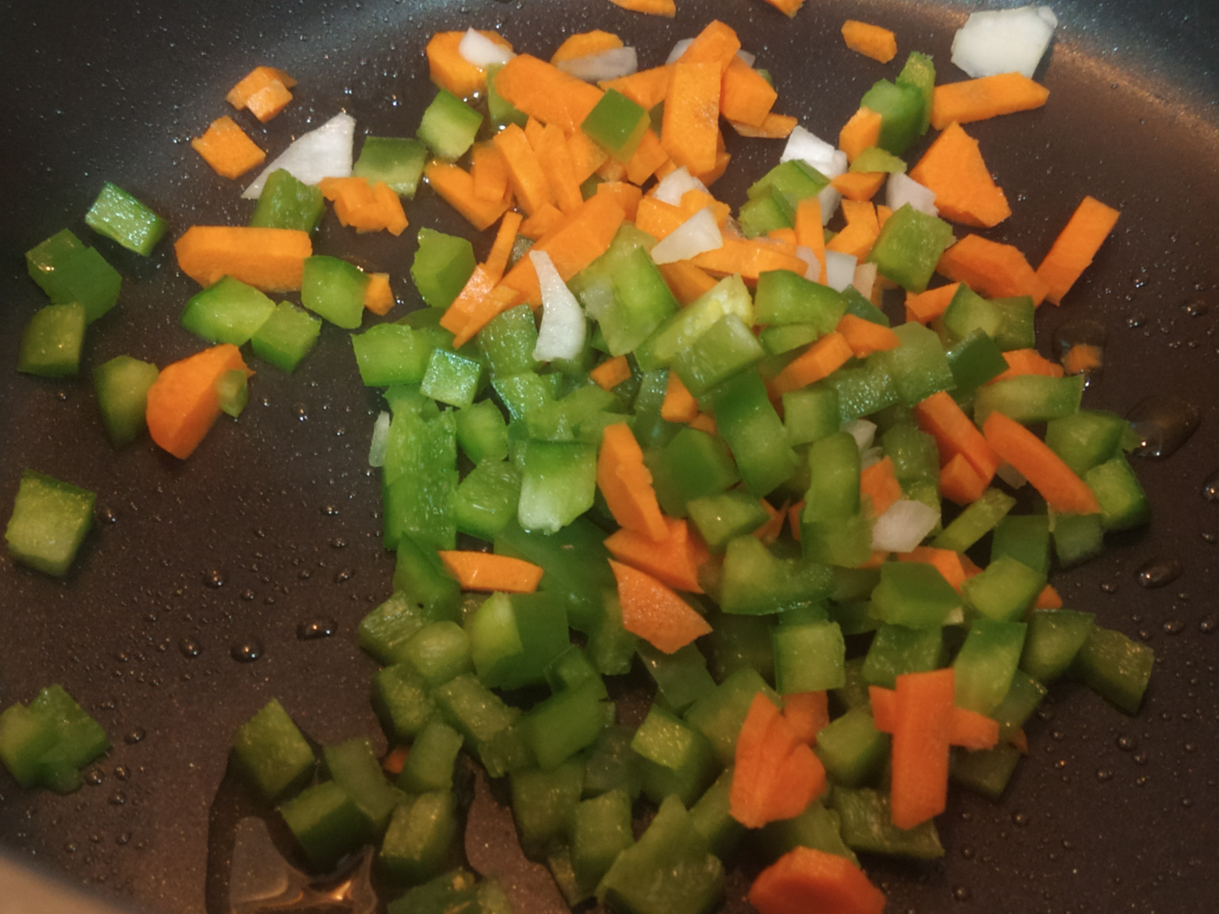 Mientras dejamos a remojo las berenjenas vamos a ir elaborando el relleno. Para ello primero vamos a picar la verdura en brunoise (trozos pequeñitos) y las vamos a rehogar con un poquito de aceite de oliva en este orden: zanahoria, pimiento y cebolla, hasta que estén un poquito blandas (unos 5 minutos), retiramos del fuego y reservamos.