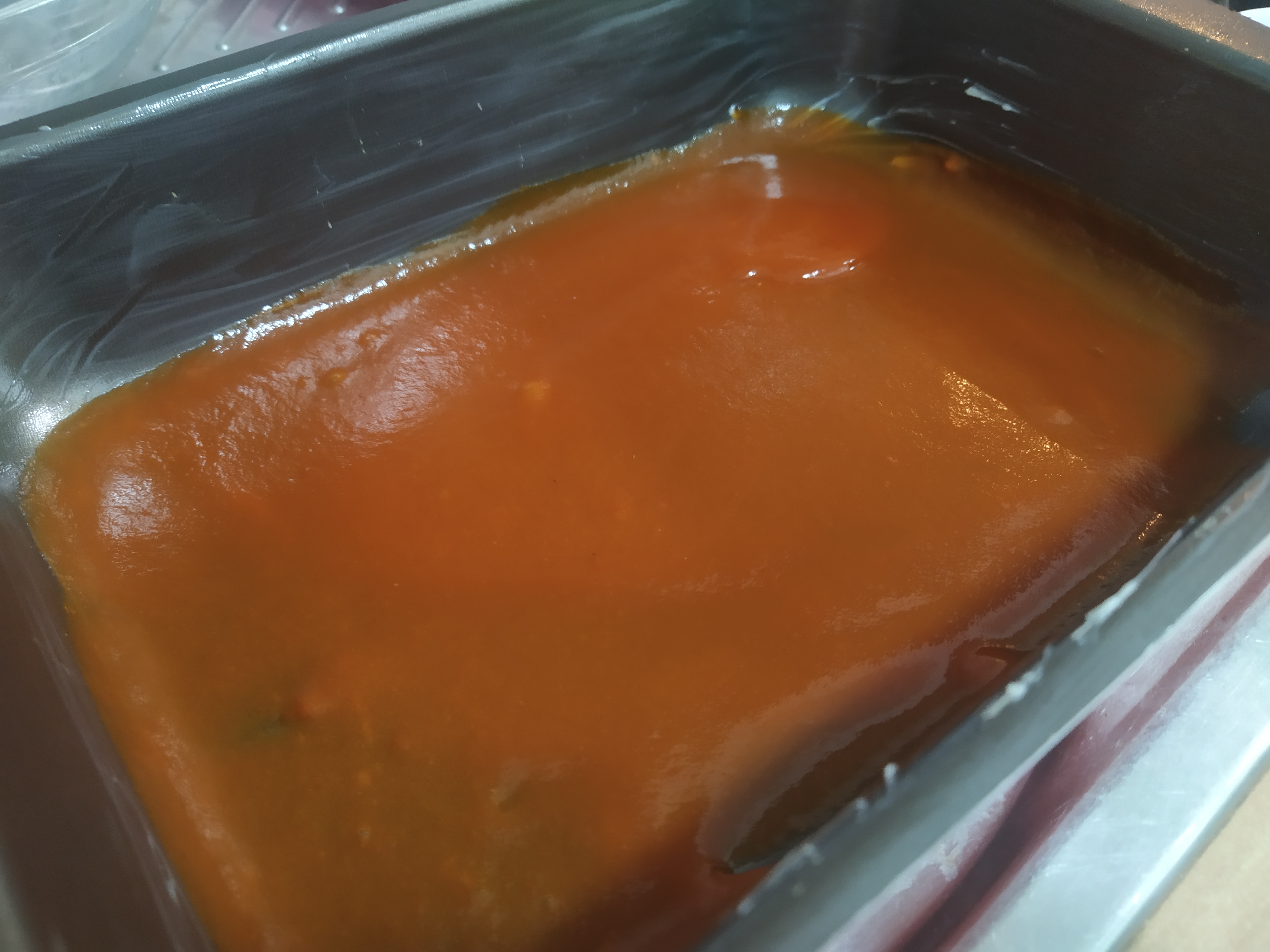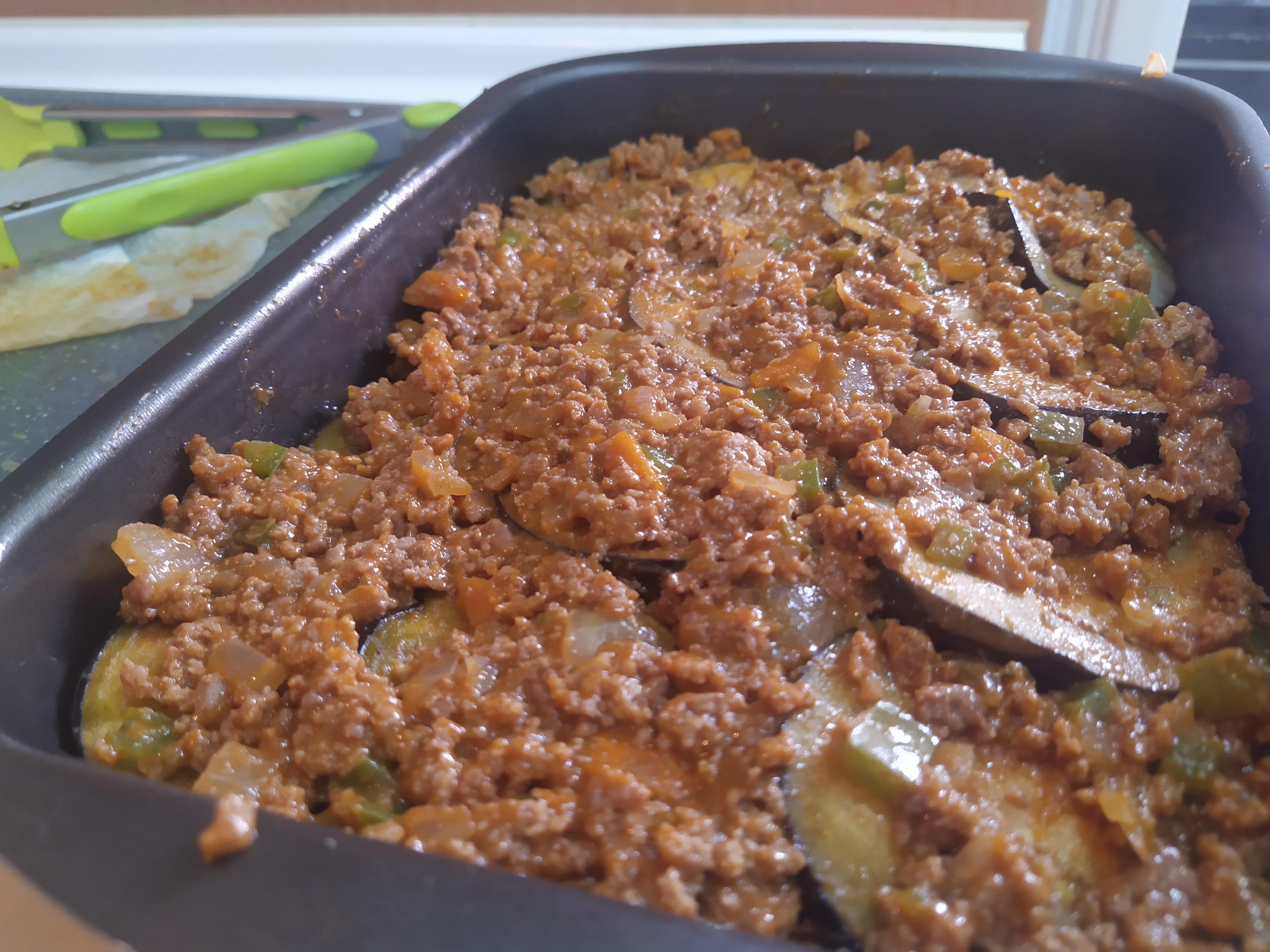 ¡Ya queda menos! Seguidamente vamos a montar la Moussaka, para ello, vamos a engrasar un molde, de la forma que más os guste, con un poquito de mantequilla y añadiremos parte del tomate frito que no pusimos en la carne (unos 50 grs más o menos). A continuación, añadiremos una primera capa de berenjenas, una base de carne, otra de berenjenas, otra de carne y naparemos con la bechamel en caliente ¡Cuidadito con las quemaduras!