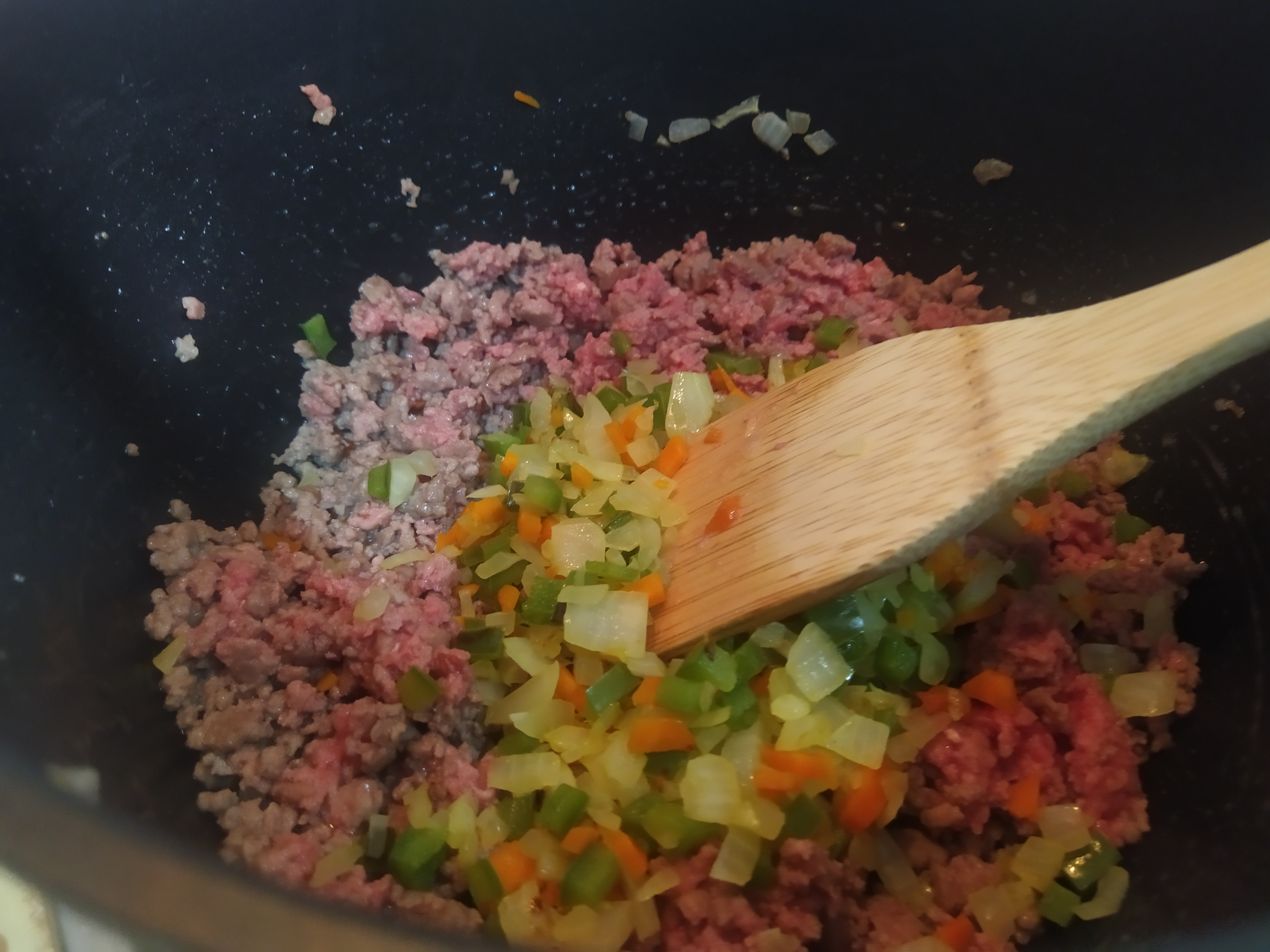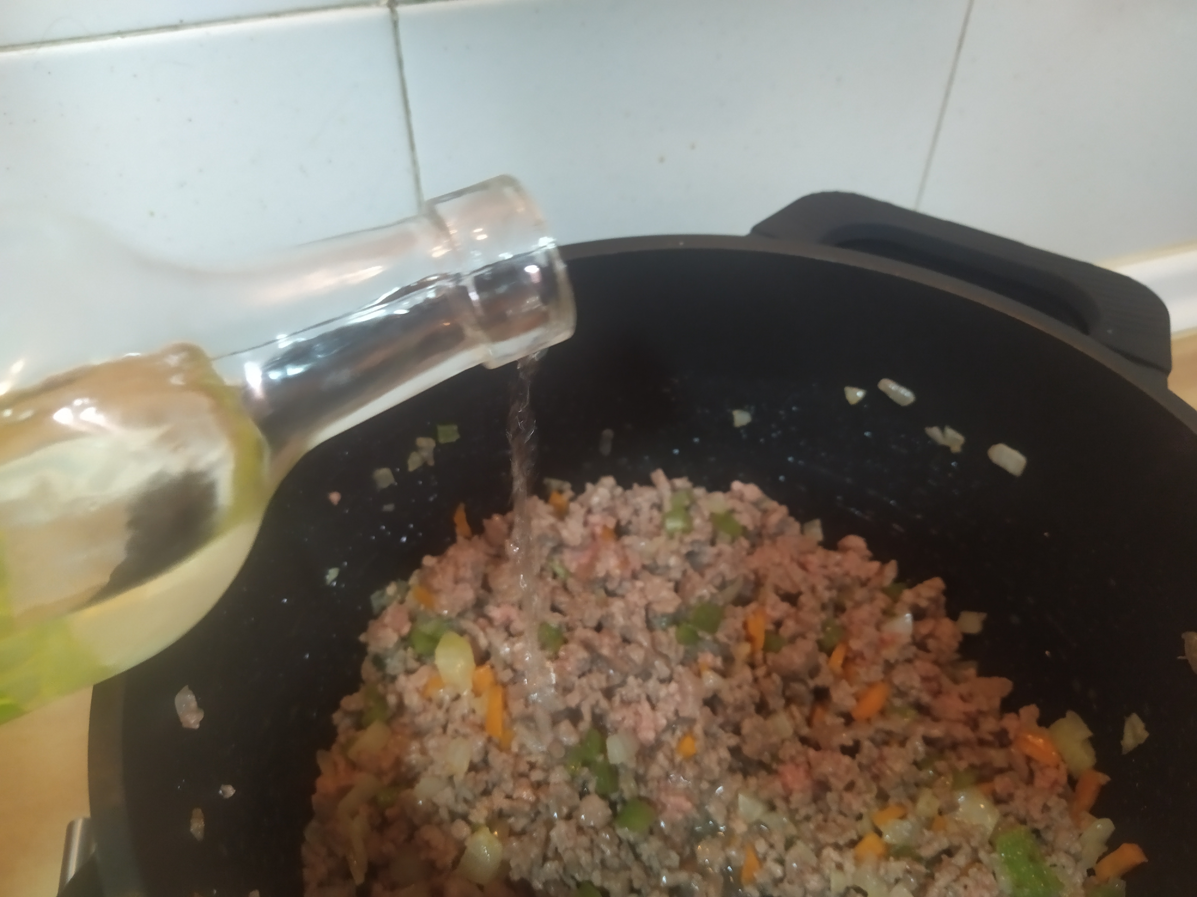 Ahora añadiremos la carne en la misma sartén/olla donde hemos rehogados las verduras. Removemos y cuando empiece a dorarse añadiremos la verdura. Volvemos a remover y aderezamos con las especias (salvo la nuez moscada) a nuestro gusto. Acto seguido añadiremos el chorrito de vino blanco y dejaremos cocer a fuego medio durante unos 5 minutos para que se evapore el alcohol.