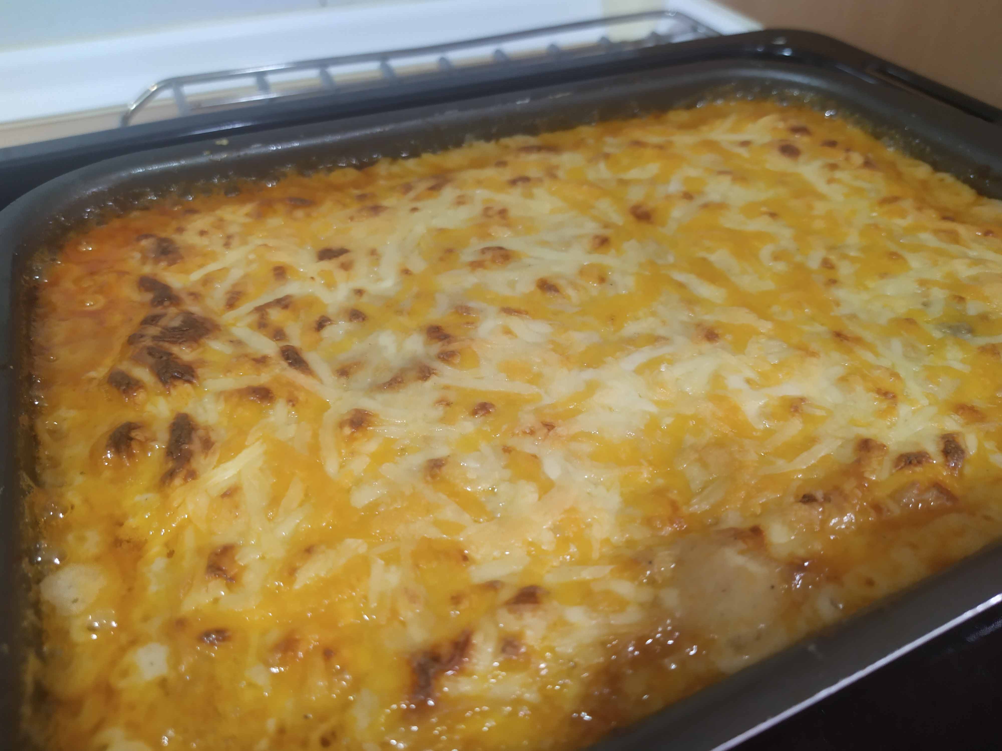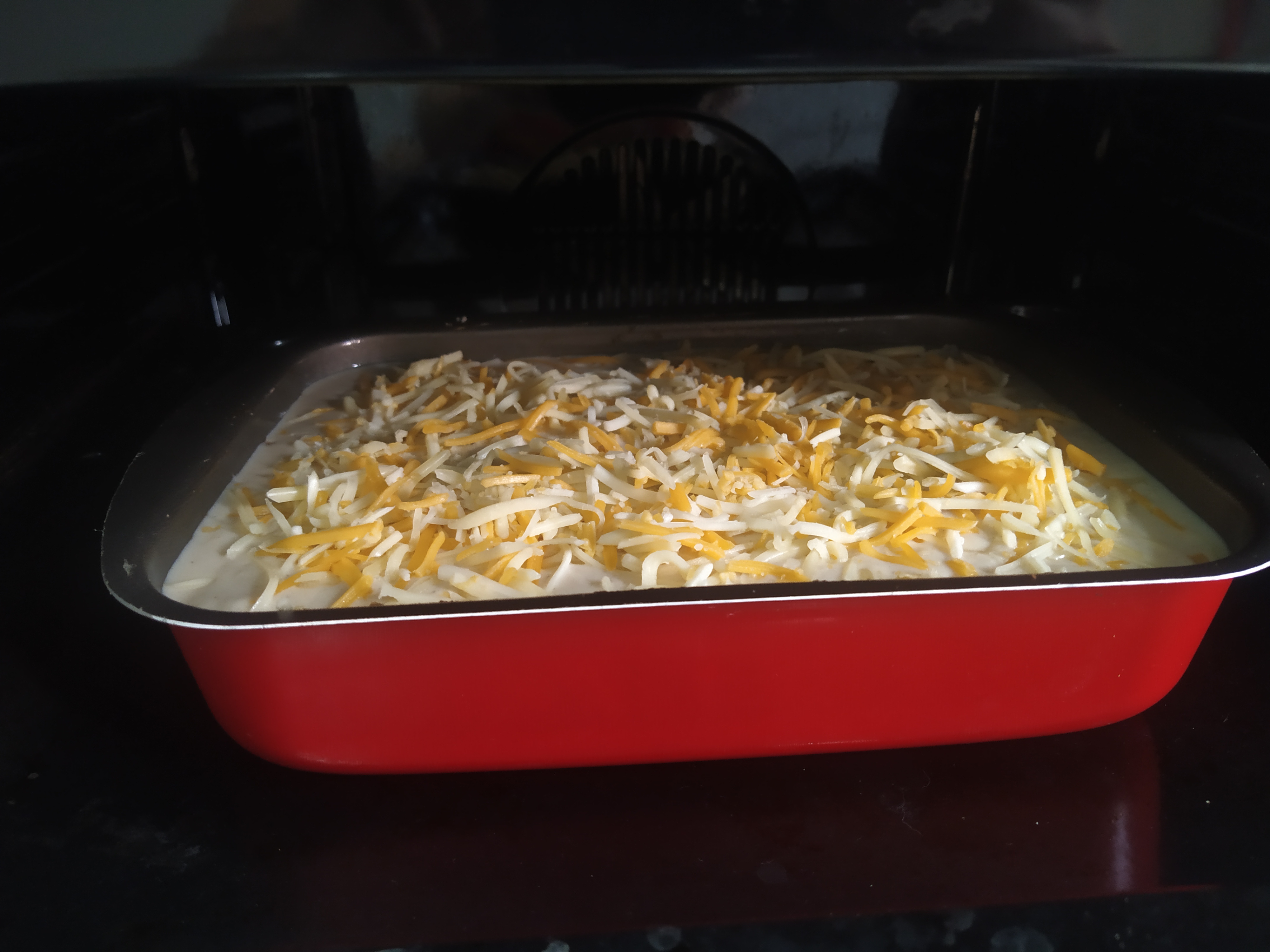 Nos toca ahora precalentar el horno a 200 grados durante 5 minutos para bajarlo después a 180. Ponemos queso rallado al gusto por encima de la bechamel y dejamos cocinar durante 37 minutos. Luego pondremos el horno en modo para gratinar y lo dejaremos 3 minutos más, vigilando que no se queme.
