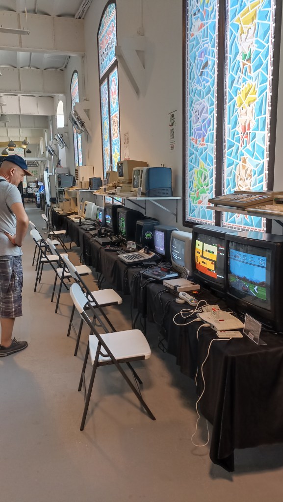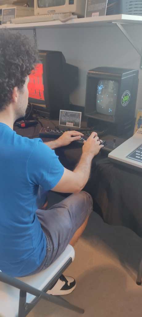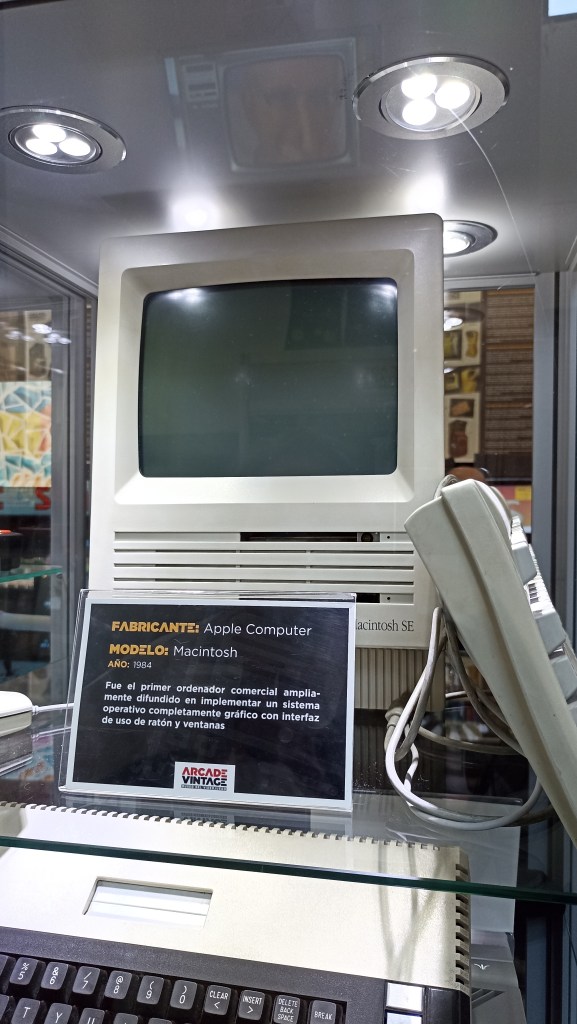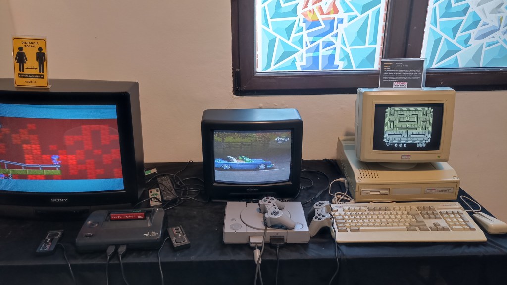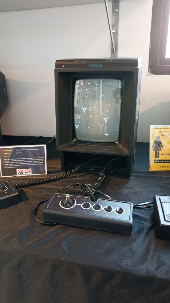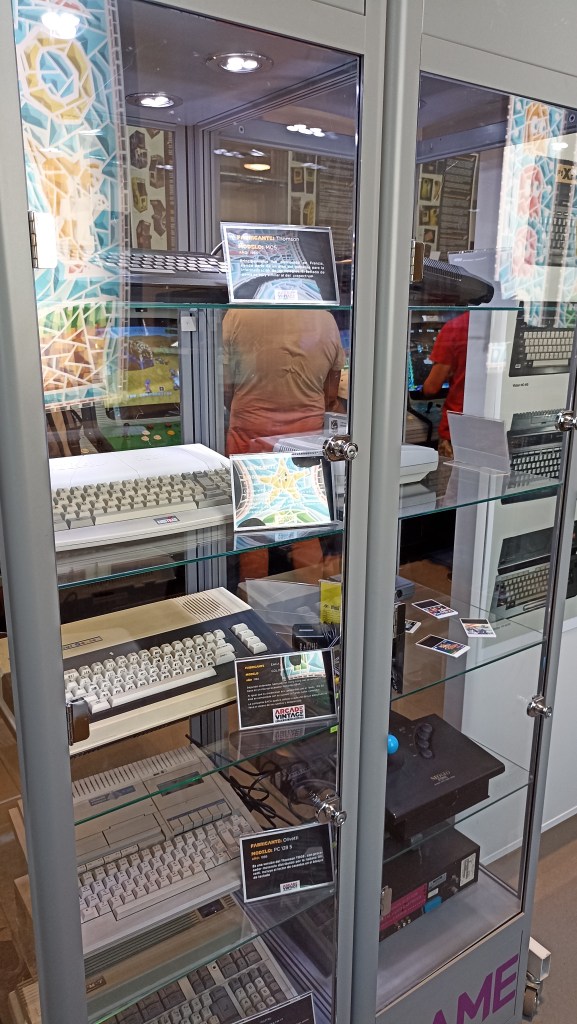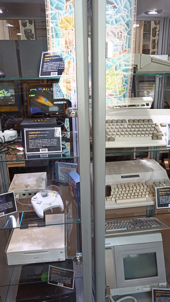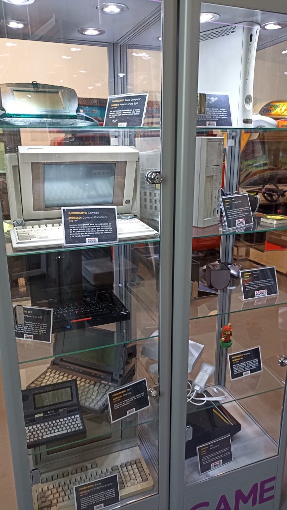 Pero como no solo os van a dejar observarlas, vais a tener la suerte de poder probar muchas de ellas, ya que hay varias conectadas con diferentes juegos para poder haceros una idea de cómo funcionaba cada una si no las conocías o no tuvisteis la oportunidad de hacerlo en la época, como nos pasó a nosotros con la mítica Vectrex, una consola que desde hace muchísimos años ansiábamos de conocer y probar, por lo que pudimos sacarnos una espinita y disfrutar de varias partidas. Esta sección, además, hará las delicias de todos aquellos de vosotros que seáis amantes de la retroinformática pues cuentan con piezas (algunas de ellas exclusivas) que son una verdadera maravilla. Aparte, no todo van a ser máquinas y/o consolas clásicas, pues el espacio también cuenta con una zona con videoconsolas actuales o algo más recientes, que al fin y al cabo también entran en la historia de este hobby que tanto nos gusta y con el paso del tiempo irán incluyéndose en esas estanterías de piezas clásicas.