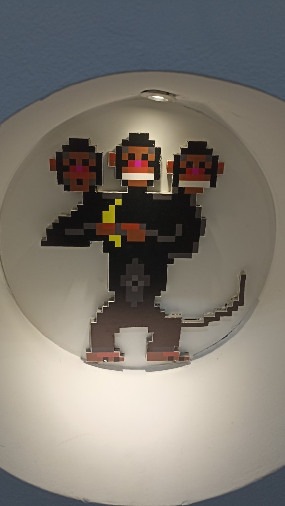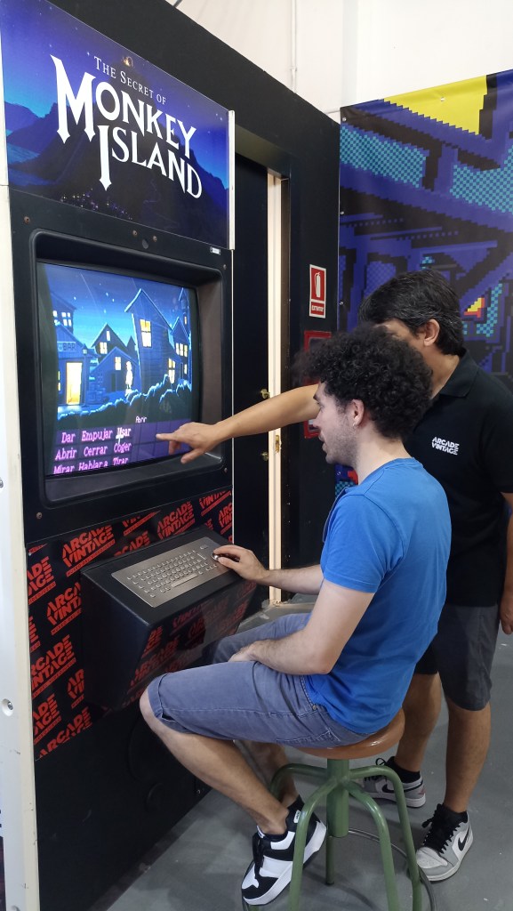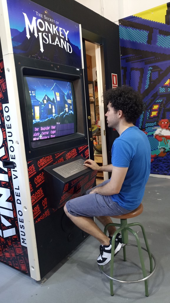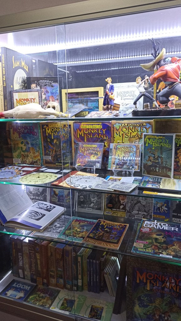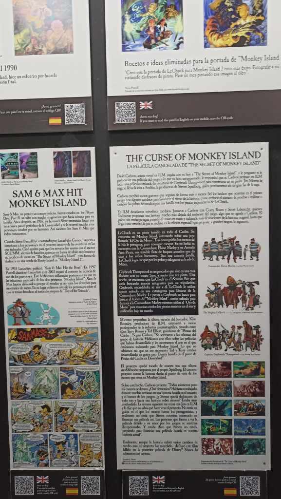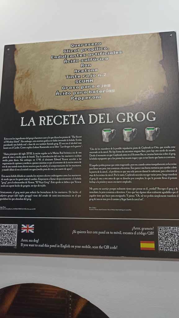 Ya vista la primera fase de las exposiciones, avanzamos en nuestra visita para seguir aprendiendo sobre una saga de videojuegos point&click que a muchos de nosotros nos trajo de cabeza hace ya unos añitos, tanto por su historia como por sus enrevesados puzles, disfrutando así de una presentación que hace honor a Monkey Island. En esta tuvimos la oportunidad de conocer todo lo relacionado con la historia de la saga, de todos sus juegos, de sus personajes y hasta de la receta original de esa bebida tan potente que es el Grog (y de la que nosotros tenemos nuestra propia versión, guiño, guiño) disfrutar de alguna sección interactiva para ver qué tipo de piratas éramos, observar otra vitrina con material que vale su peso en oro y disfrutar de una breve partida ayudando al ya célebre Guybrush Threepwood a salir de algún apuro en una máquina que corría el primer juego a la perfección. Una exposición que encantará a los fans de la saga, a todos aquellos que disfrutasteis de alguno de sus títulos o los futuros jugadores que van a poder conocerla tanto en este gran lugar como en el próximo juego que llegará al mercado dentro de un tiempo.