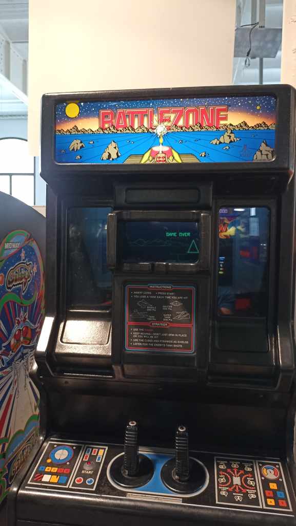 De verdad, de primeras vais a quedar impresionados ya que al igual que nosotros no sabréis por dónde empezar a jugar debido a la inmensa cantidad de títulos disponibles y con tanto género diferente para probar. Pero como nosotros siempre vamos de frente empezamos justo por donde entramos para probar una máquina bastante curiosa, no sin antes escanear el código QR que tienen las máquinas, que nos contarán la historia de cada uno de los juegos que albergan en su interior y aprender algo más de cada una de ellas. Esta primera máquina que pudimos probar recibió el nombre de Battlezone y su uso derivó, incluso, para el servicio militar de los E.E.U.U a modo de entrenamiento para que sus tropas manejasen tanques, esta se puede considerar el primer arcade de realidad virtual, ya que debemos visualizar la pantalla a través de unas gafas para poder ver un escenario conformado por gráficos vectoriales. Una verdadera pasada ya que hasta entonces habíamos leído bastante sobre esta máquina, pero poder verla y probarla ha sido toda una experiencia.