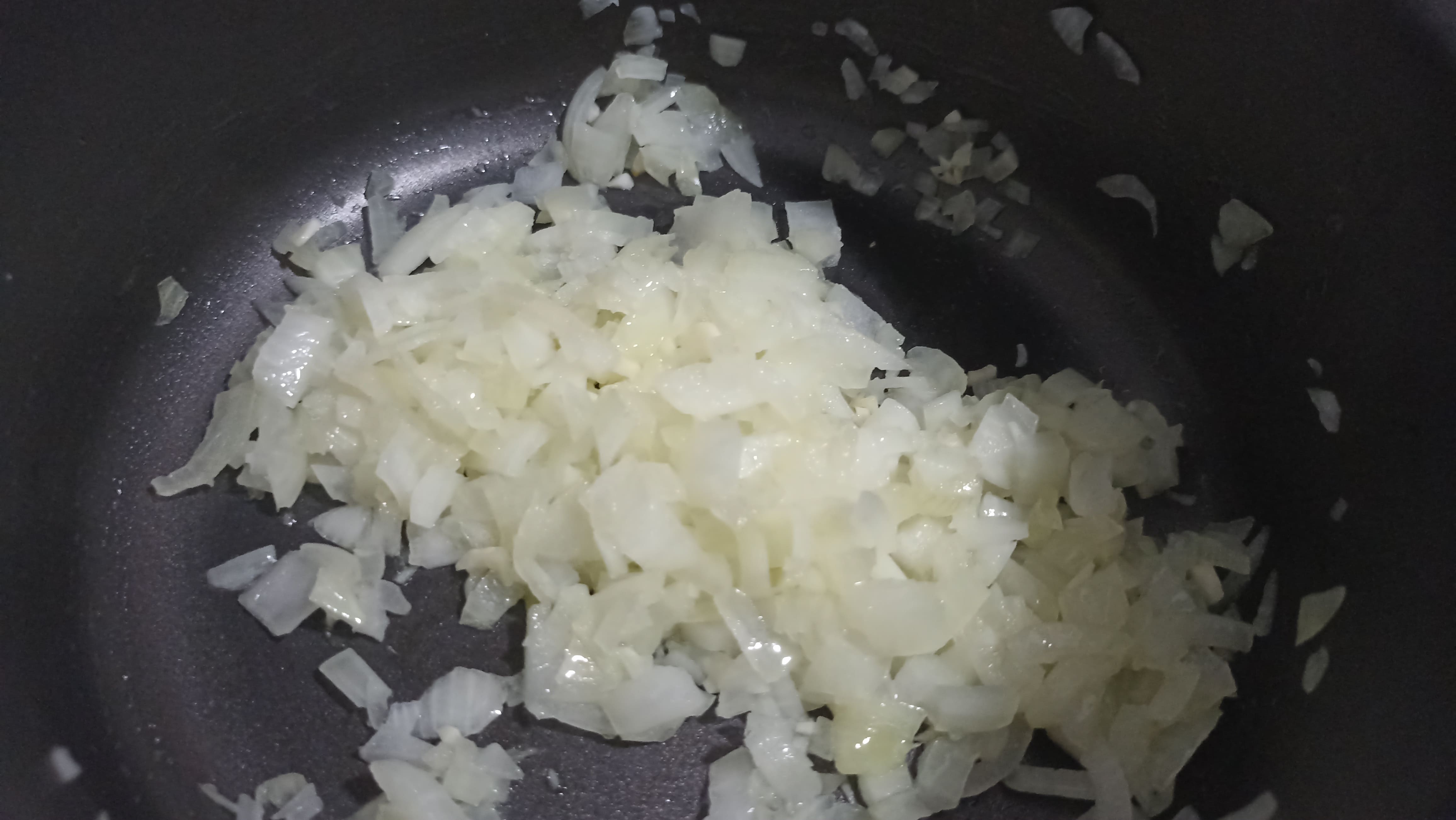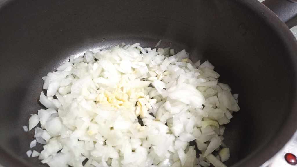 Mientras estas se van enfriando vamos a ir elaborando la salsa. Para ello debemos empezar a cortar la media cebolla y el diente de ajo en trozos muy pequeñitos (brunoise) y acto seguido las vamos a pochar en un cazo con un poquito de aceite, añadiendo además una pizquita de sal para que suden y alcancen antes este punto. Ahora y con mucho cuidado, vamos a retirar el cazo del fuego para añadir los dos tipos de pimentón, ya que no queremos que se quemen y dejen un regusto desagradable. Removemos bien para que se mezcle y devolvemos al fuego, que bajaremos al mínimo para seguir cocinando el pimentón y no nos deje sabor a crudo.