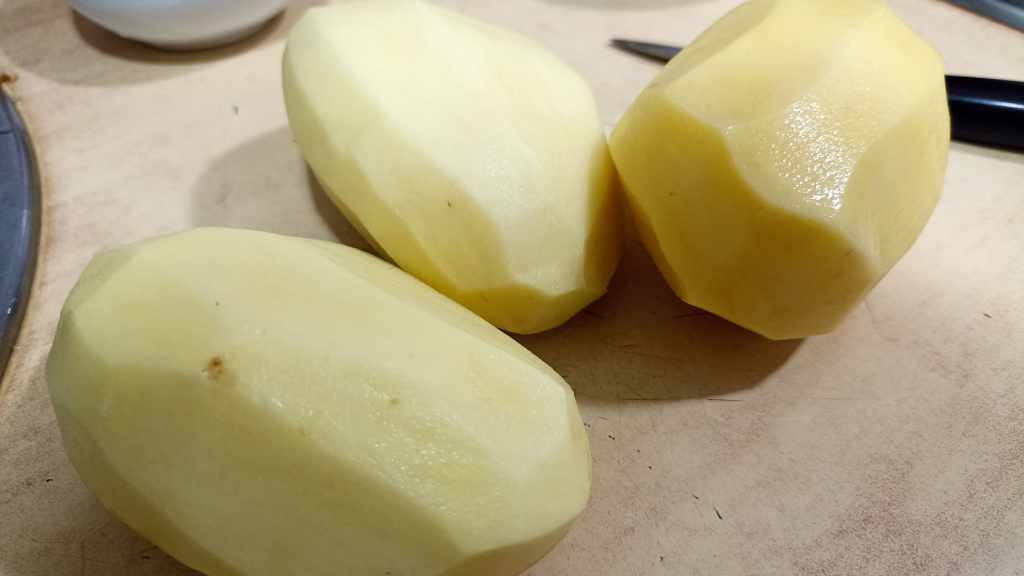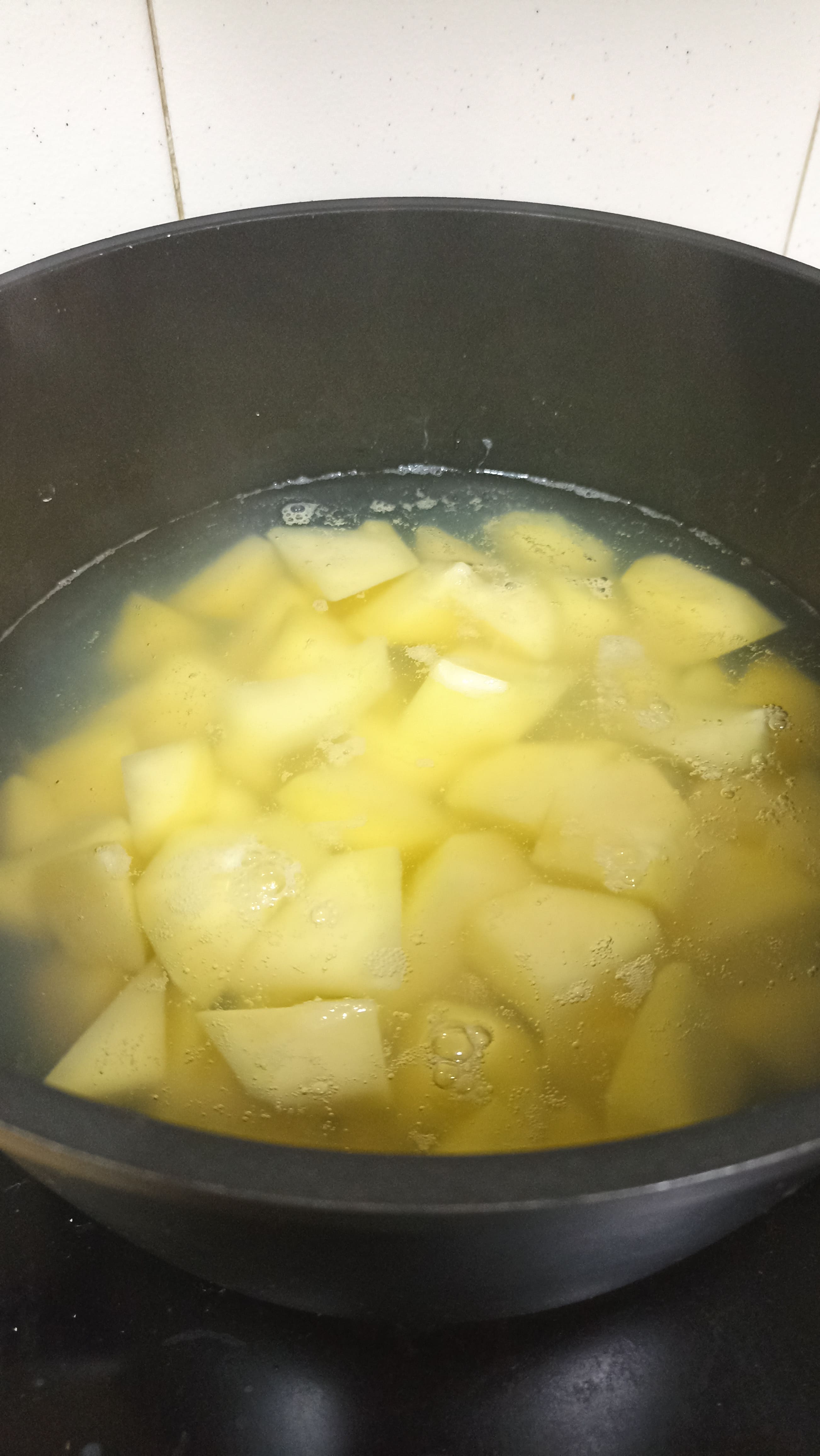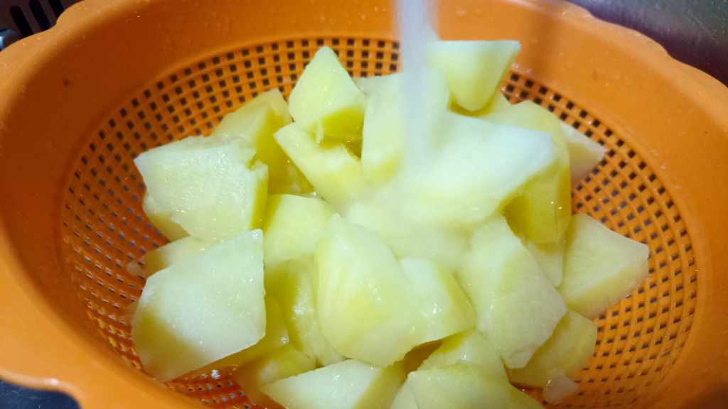 Lo primero que vamos a hacer es cocer las patatas en agua con un poco de sal. Mientras el agua va cociendo, vamos a pelar las patatas y acto seguido las cortaremos en trozos regulares de un tamaño mediano. Cuando el agua esté hirviendo agregaremos las patatas y las dejaremos cocer durante 7 minutos, bajando el fuego a nivel medio.