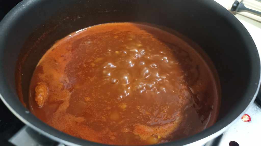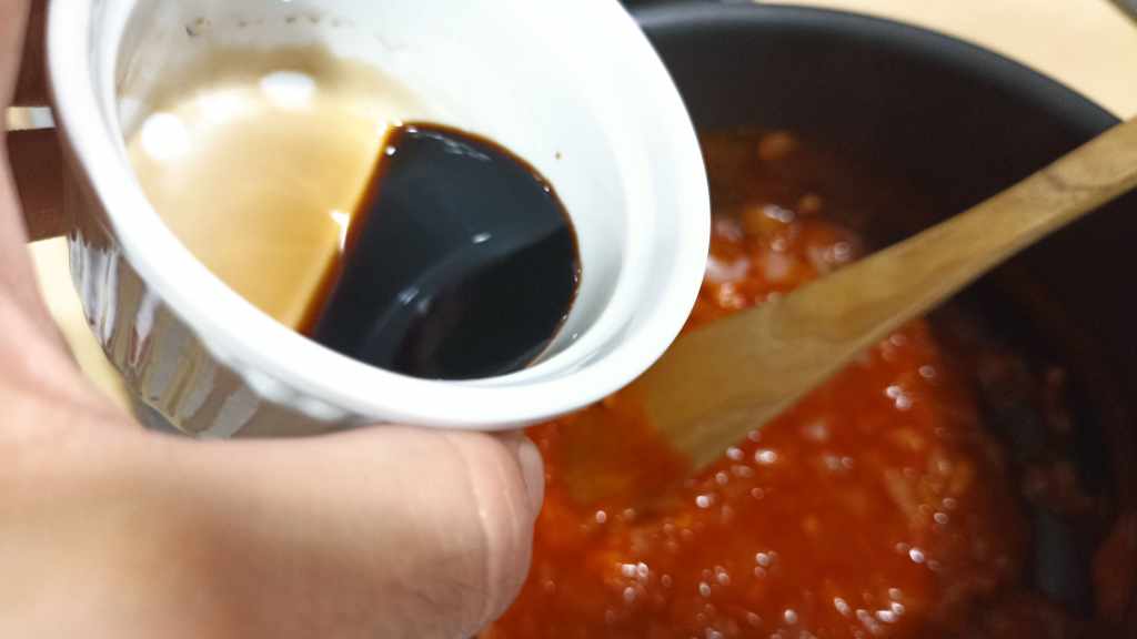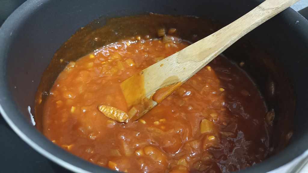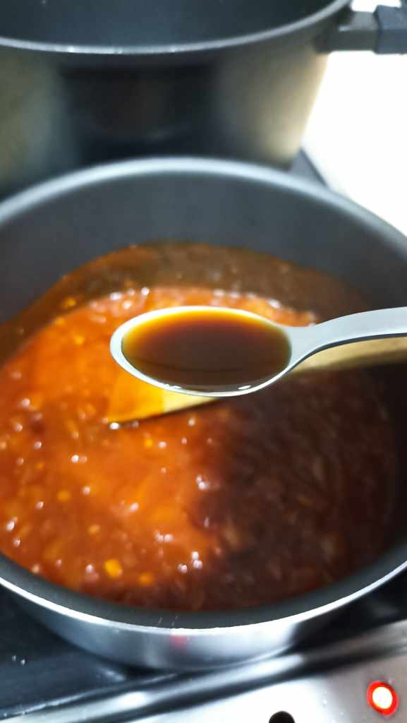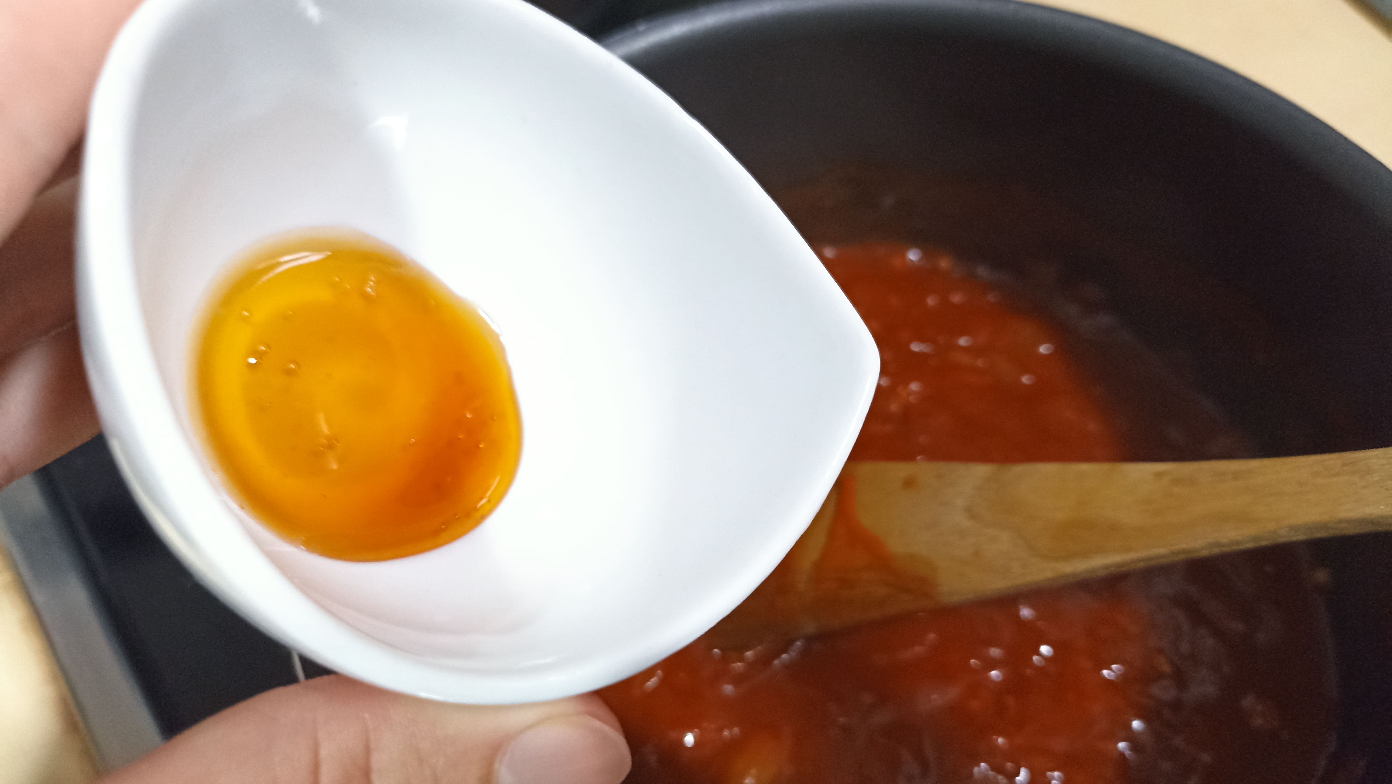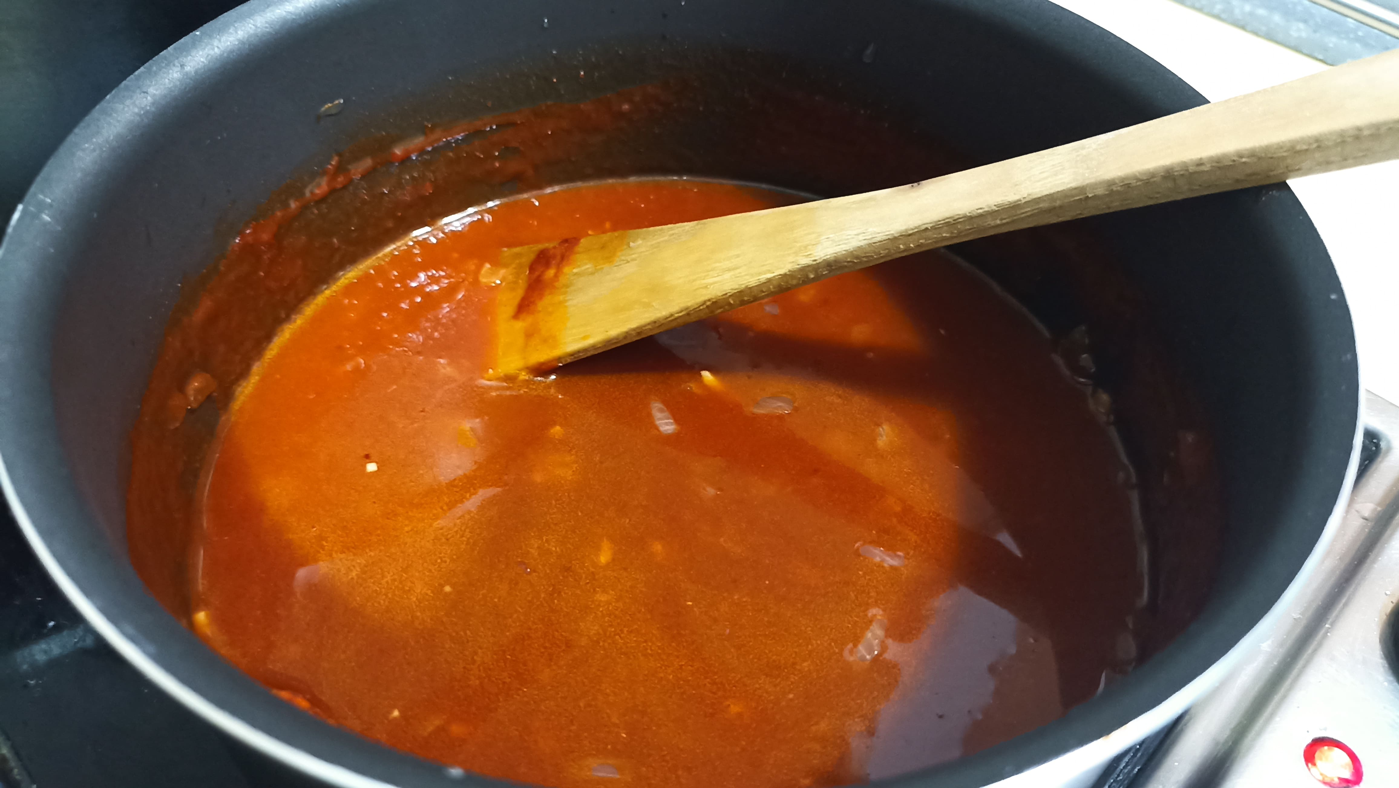 Ya solo nos queda ir añadiendo los demás ingredientes en este orden, primero la miel que nos ayudará a reducir la acidez del tomate y el vinagre, la cayena, el tabasco y la salsa perrins. Dejamos que todo se integre un poco y finalmente añadimos el agua, dejando cocer durante unos 5 minutos a fuego medio.