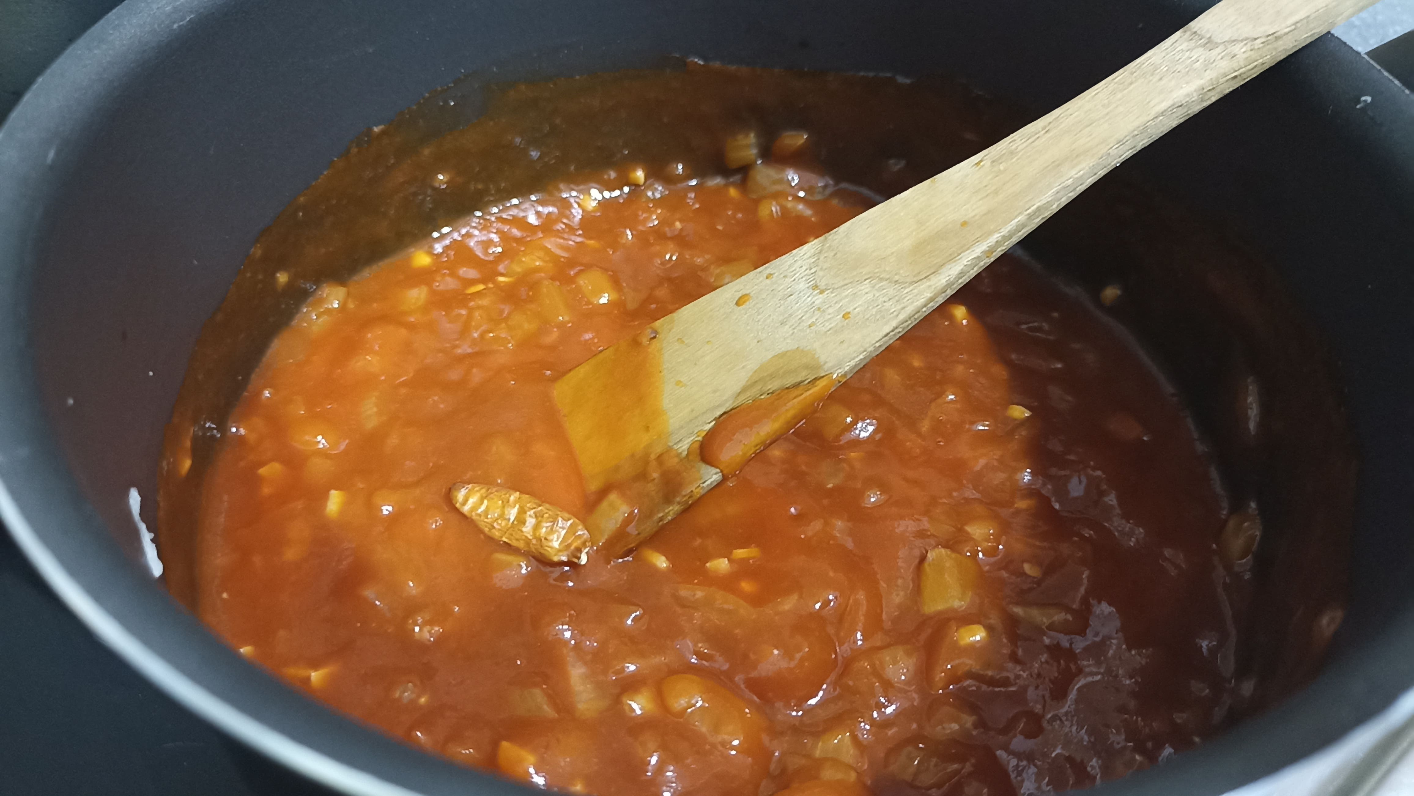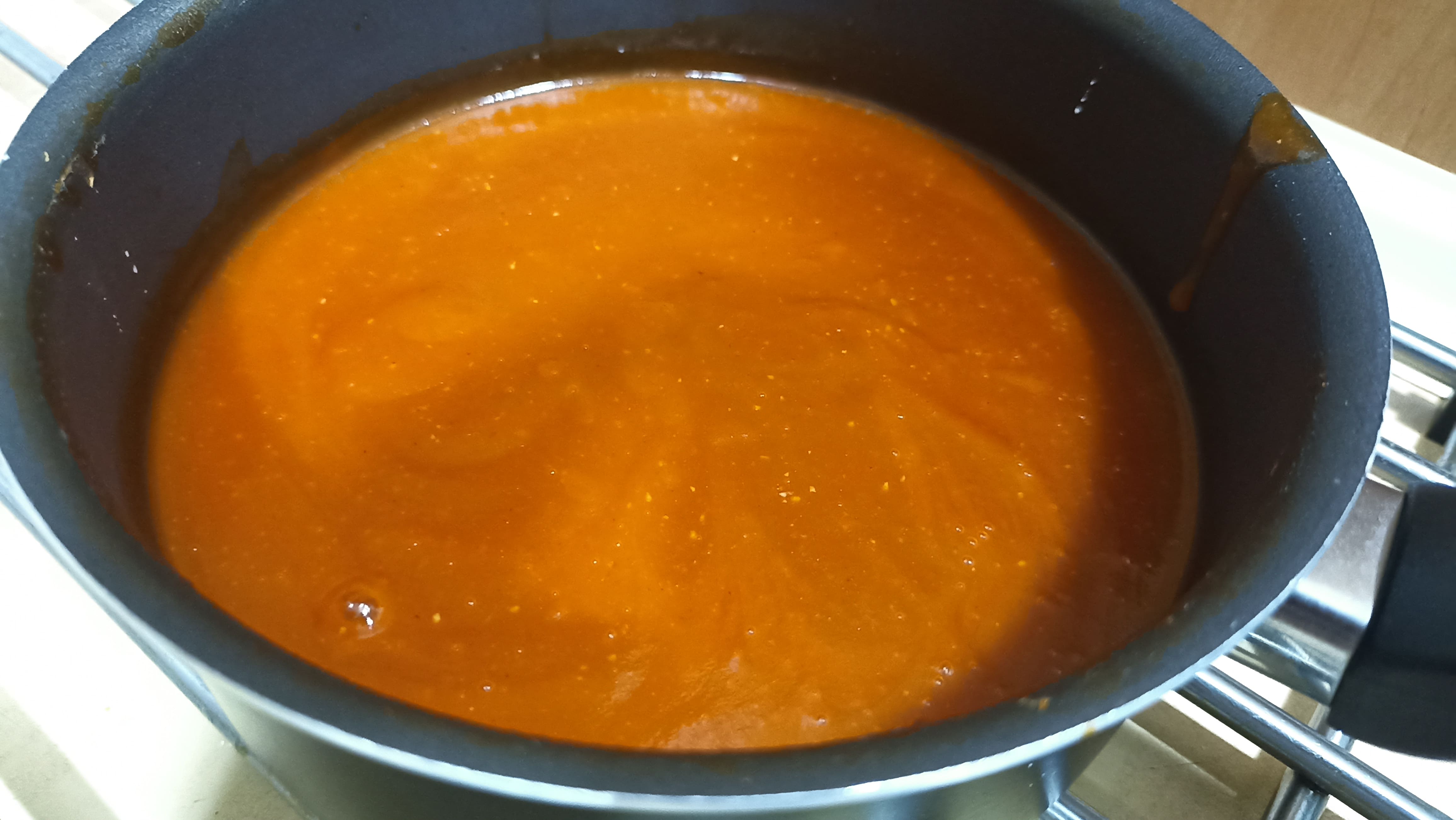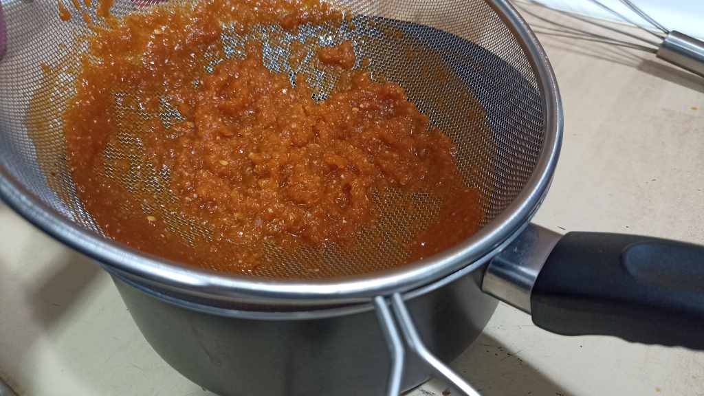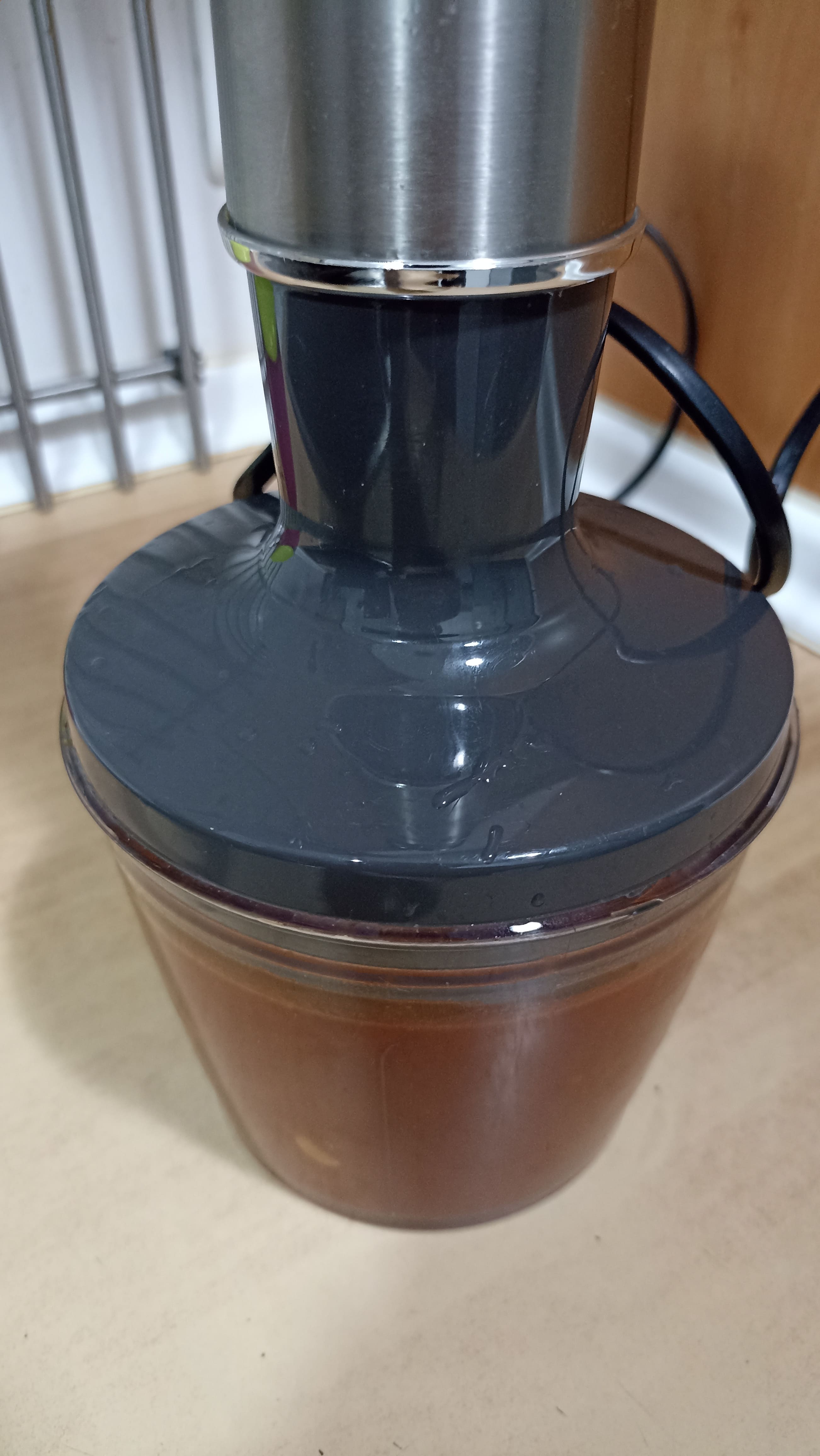 Pasado este tiempo vamos a triturar la salsa con la ayuda de una batidora. Cuando la obtengamos la vamos a colar para retirar impurezas y la salsa quede limpia. Volvemos a llevar al fuego una vez colada y añadiremos la harina de maíz mezclada en un poco de agua fría. Removemos y dejamos que vaya espesando. Retiramos del fuego y dejamos que se vaya enfriando un poco.