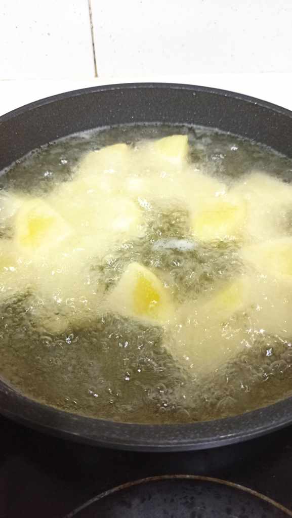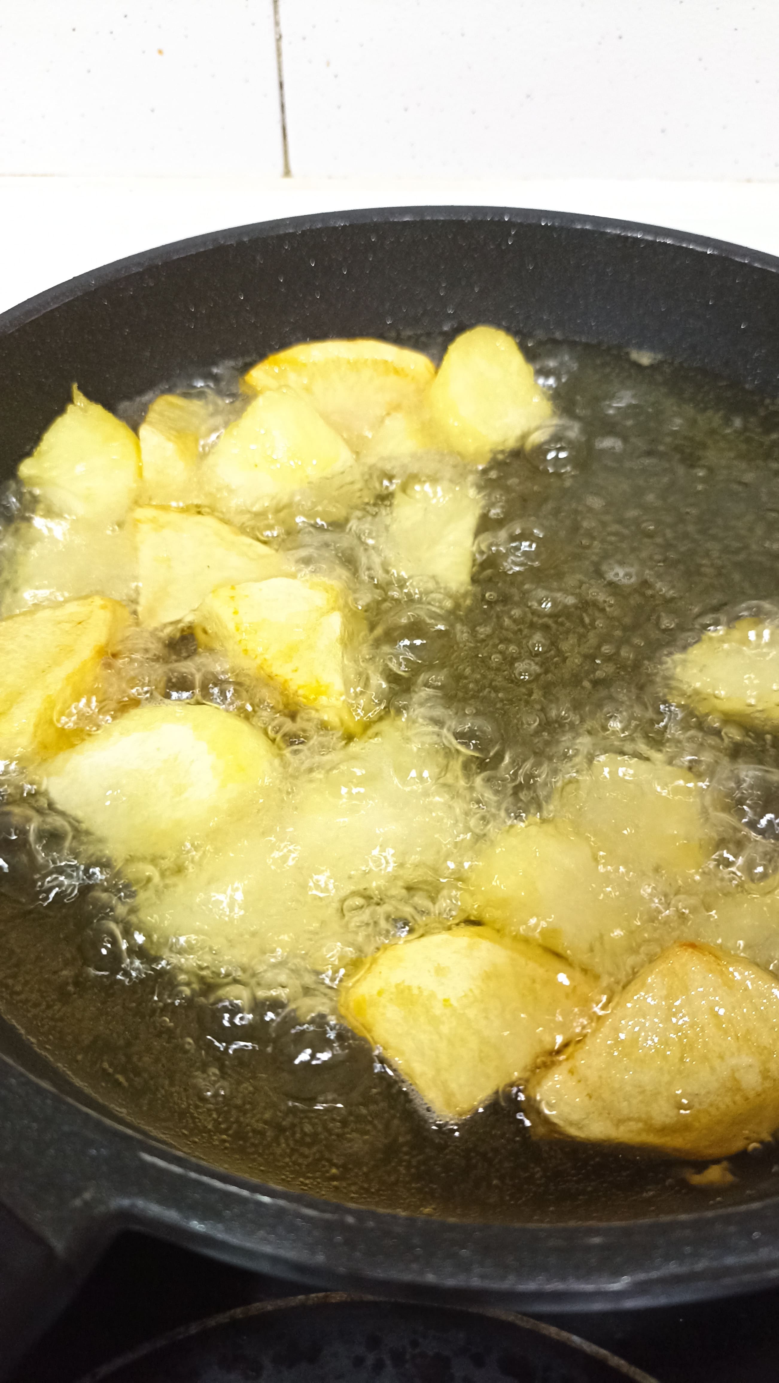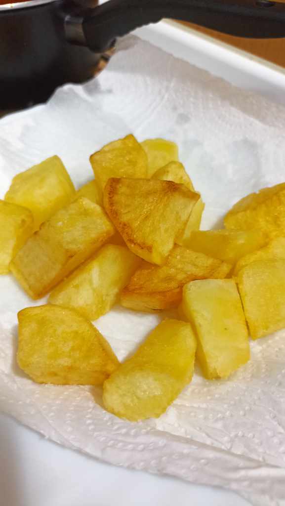 Mientras tanto, vamos a freír las patatas que ya habrán bajado su temperatura después de cocerse. Para ello pondremos una sartén o un cazo con abundante aceite (o lo justo para que cubra las patatas, que el precio de este preciado líquido está igual de caro que un juego de Pokémon Rojo/Azul completo a día de hoy) a fuego fuerte, añadiendo de dos tandas las patatas y dejando que se doren durante unos 2 minutos. Ahora bajaremos el fuego y vamos a dejar que se frían durante 14 minutos, de manera que nos queden crujientes por fuera y blanditas por dentro.