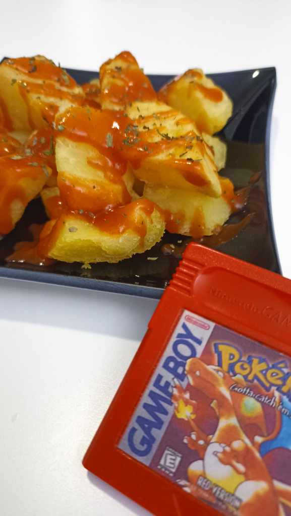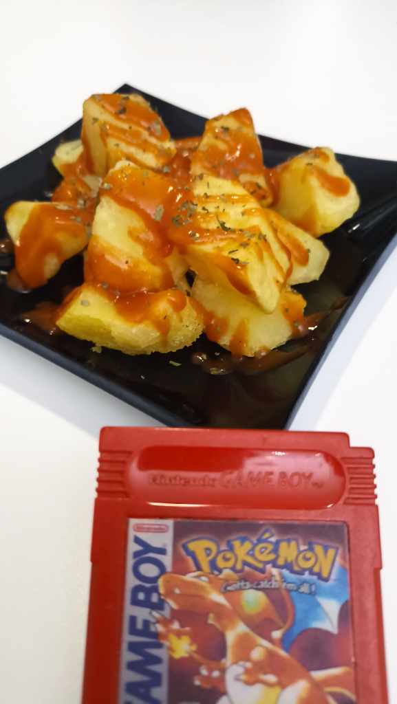 Sacamos del aceite y añadimos la otra tanda. Dejamos escurrir sobre papel absorbente, añadimos sal a nuestro gusto y emplatamos las patatas. Ahora, solo falta cubrirlas con la salsa bien fría o caliente, eso es decisión de cada uno, pero como queremos que sea tan fogosa como Charizard, cuanto más caliente ,¡mejor!.