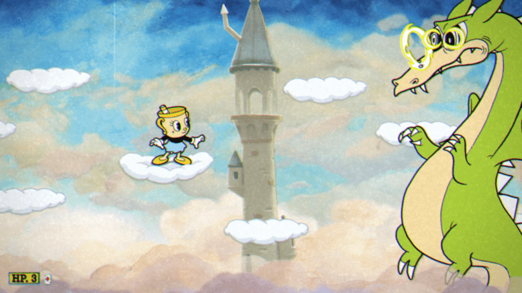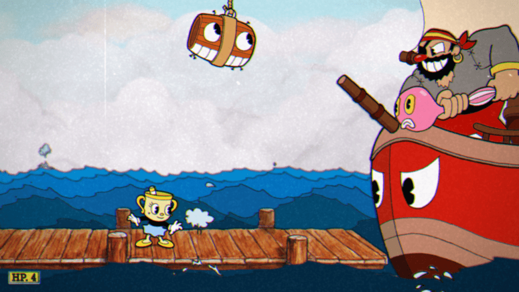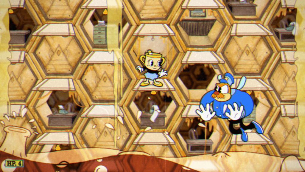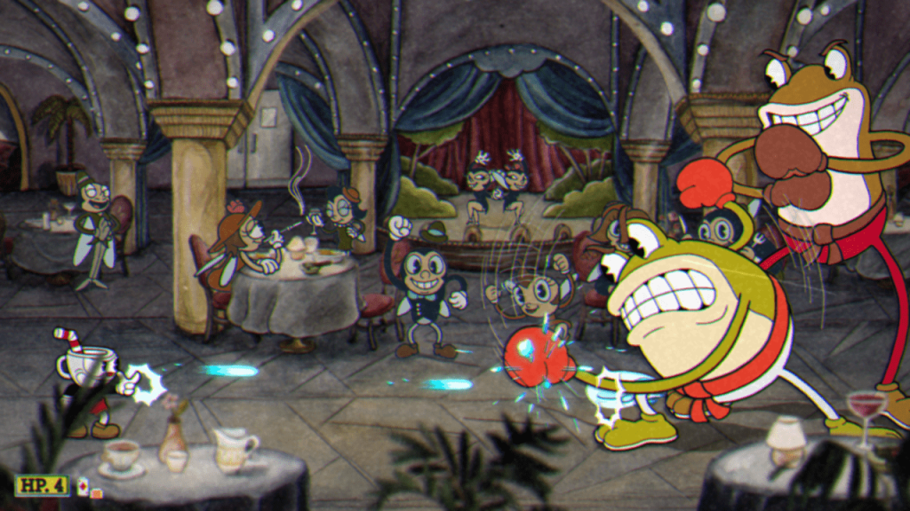 Aparcando ya la frenética jugabilidad y esfuerzo que supone el juego, vamos a adentrarnos en uno de los apartados que más destacan del título y que es el visual. Nos encontraremos de lleno con niveles con un estilo artístico intachable, pintados a mano de manera digital y presentando una paleta de colores bastante recargada que hace que los escenarios destaquen nada más empezar el nivel que seleccionemos. A la par, cabe recalcar todas y cada una de las animaciones que presentan los personajes del juego y las acciones que realizan en cada momento, derrochando bastante personalidad, desde el principio del combate tomando una pose o haciendo una mueca hasta en cada uno de sus diferentes ataques, que ocuparan parte de la pantalla en su totalidad. Cada una de ellas se crearon con las mismas técnicas de animación de principios del siglo pasado, utilizando para ello y como herramienta principal el rotoscopio. Destaca también esa sensación de grano en pantalla, como si de una película vieja se tratase, provocando, de esta manera, creer estar visualizando un corto clásico de animación interactivo.