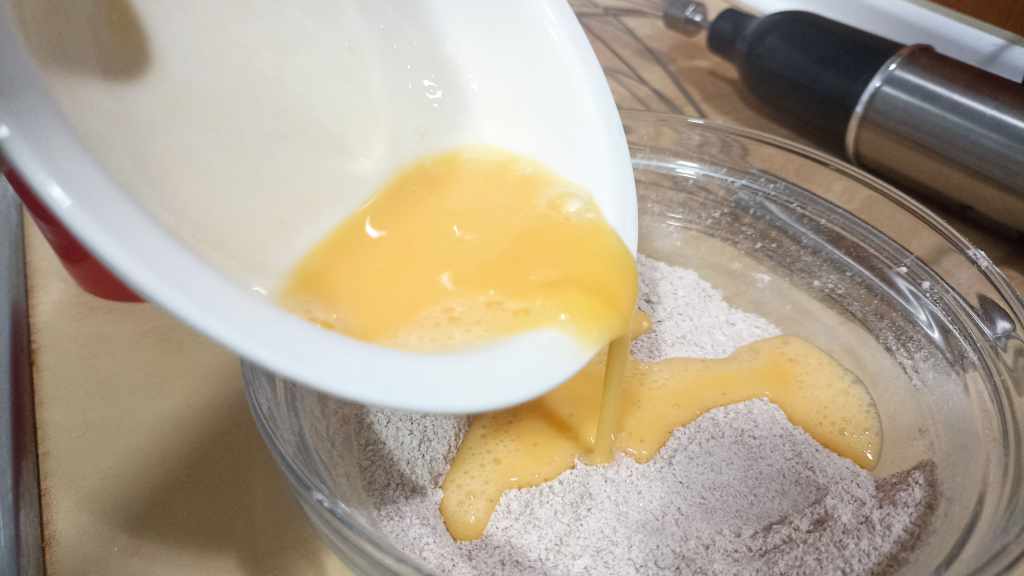 A continuación, añadiremos los ingredientes líquidos: el huevo batido, la leche y el aceite de girasol.