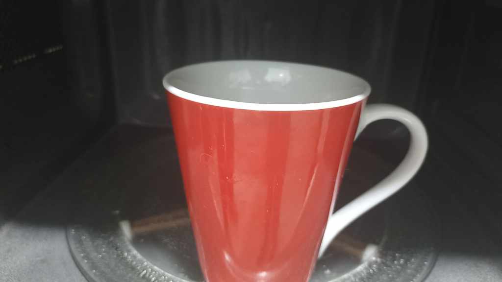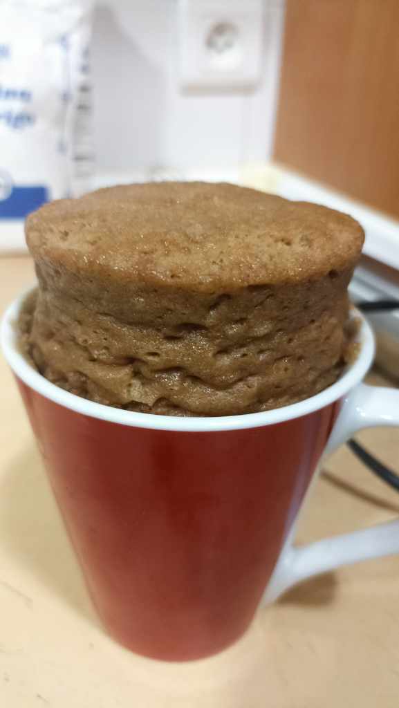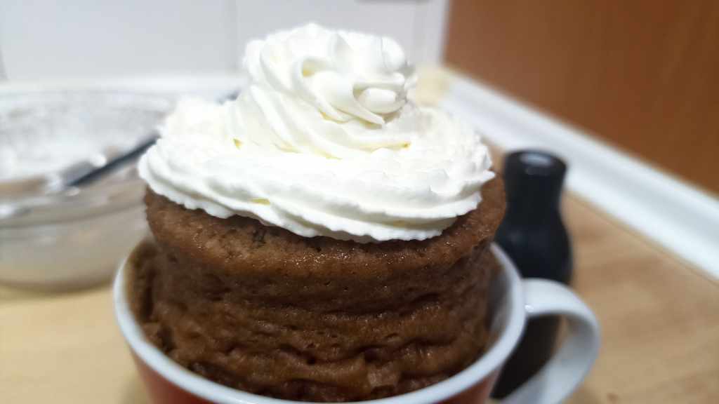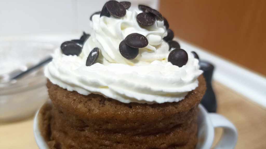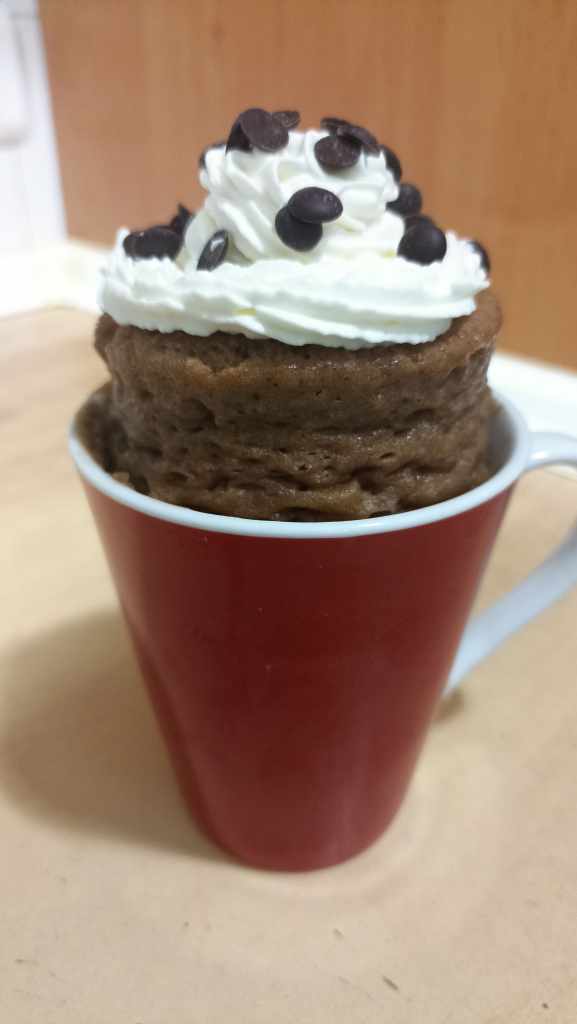 Una vez lista la mezcla de los ingredientes del bizcocho, la verteremos en una taza apta para microondas, con la ayuda de una lengua pastelera. Tenemos que tener en cuenta que no deberemos llenarla demasiado pues puede desbordarse, por lo que la llenaremos hasta un poquito más de la mitad, dejando unos 3 cms de margen. Llevaremos la taza al microondas, colocándola a un borde del plato de este, nunca en el centro a máxima potencia durante 3 minutos, cosa que puede variar dependiendo del microondas, por lo que deberéis vigilar cuál es su potencia (lo recomendado son 800 W) y como va subiendo el bizcocho. Dejaremos enfriar unos 5 minutos para que se asiente y poder la nata encima con la ayuda de una manga pastelera, decoraremos con las perlas de chocolate y una galleta partida a la mitad.