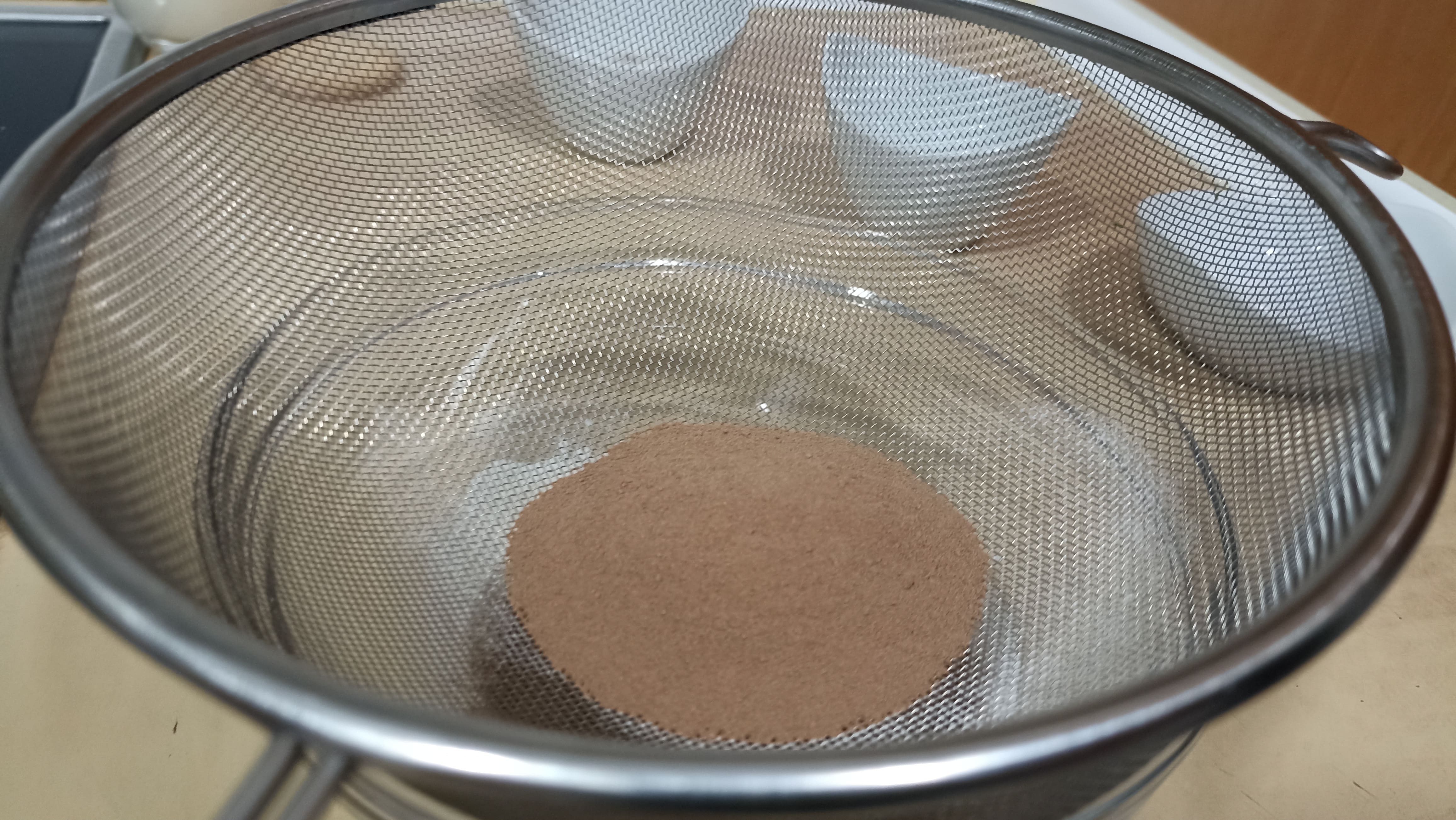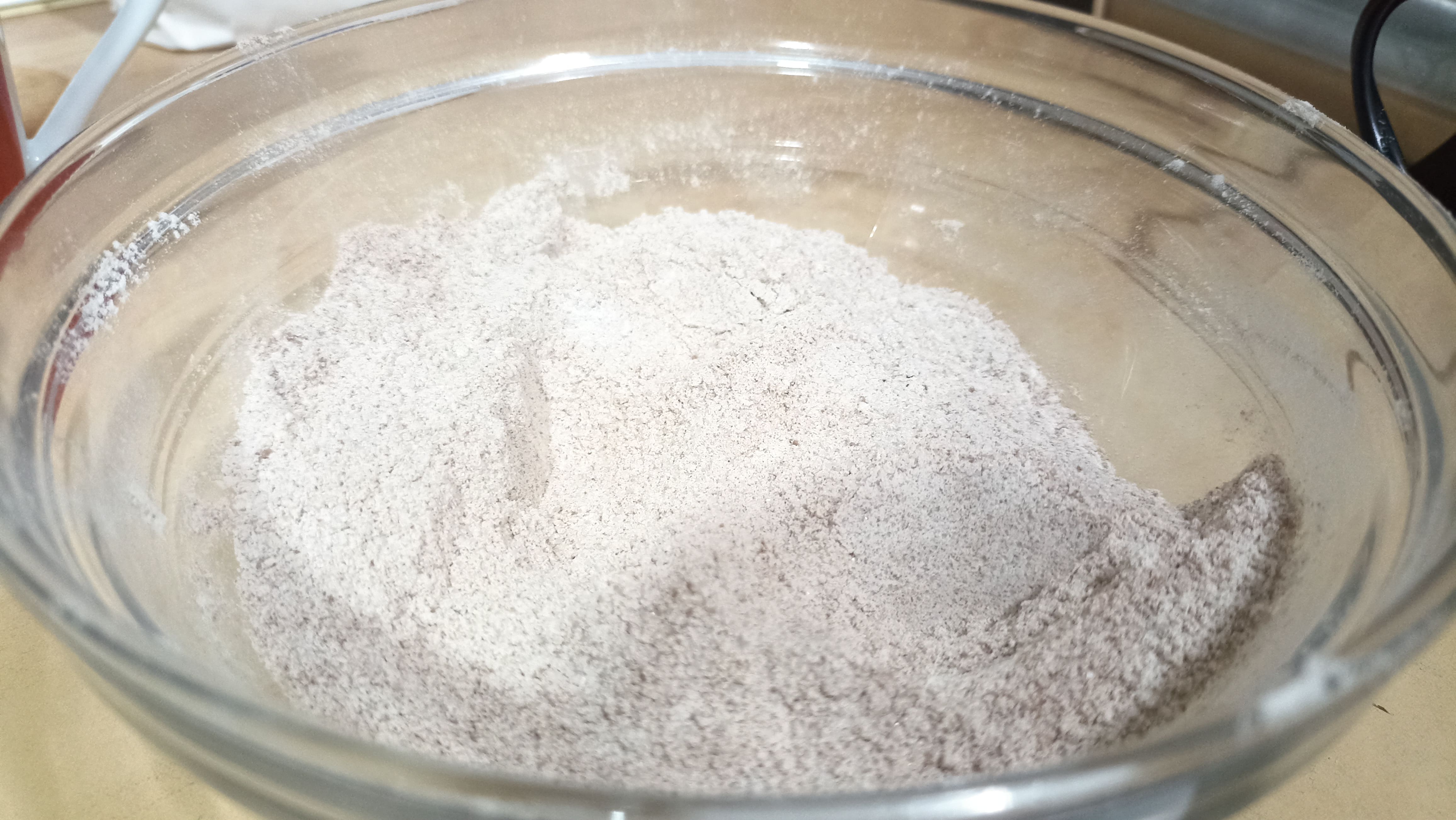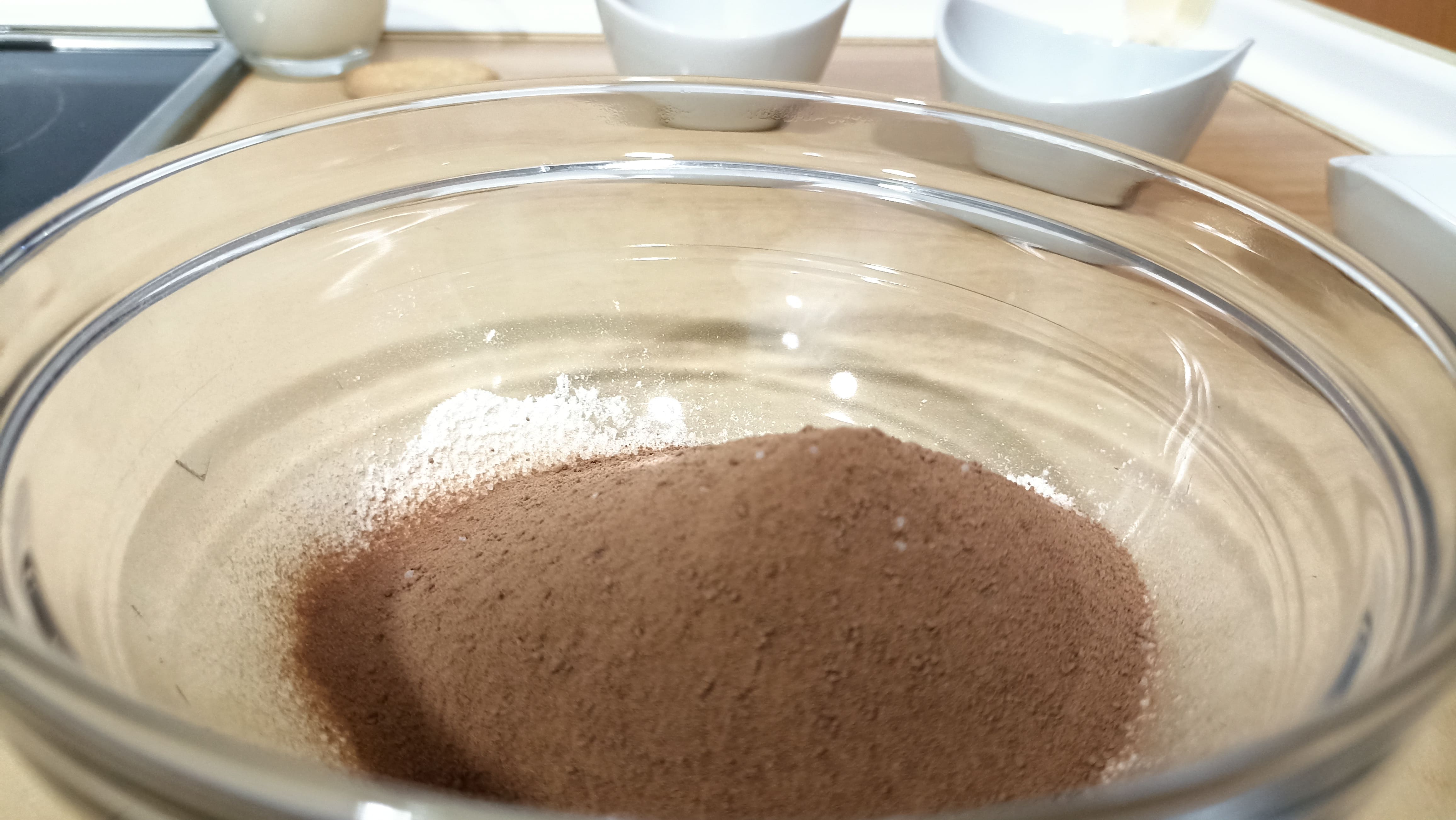 Primero, antes de mezclar en un bol los ingredientes secos vamos a tamizarlos, es decir, pasamos por un colador la harina, el azúcar, el cacao y la levadura para evitar grumos y los mezclaremos.