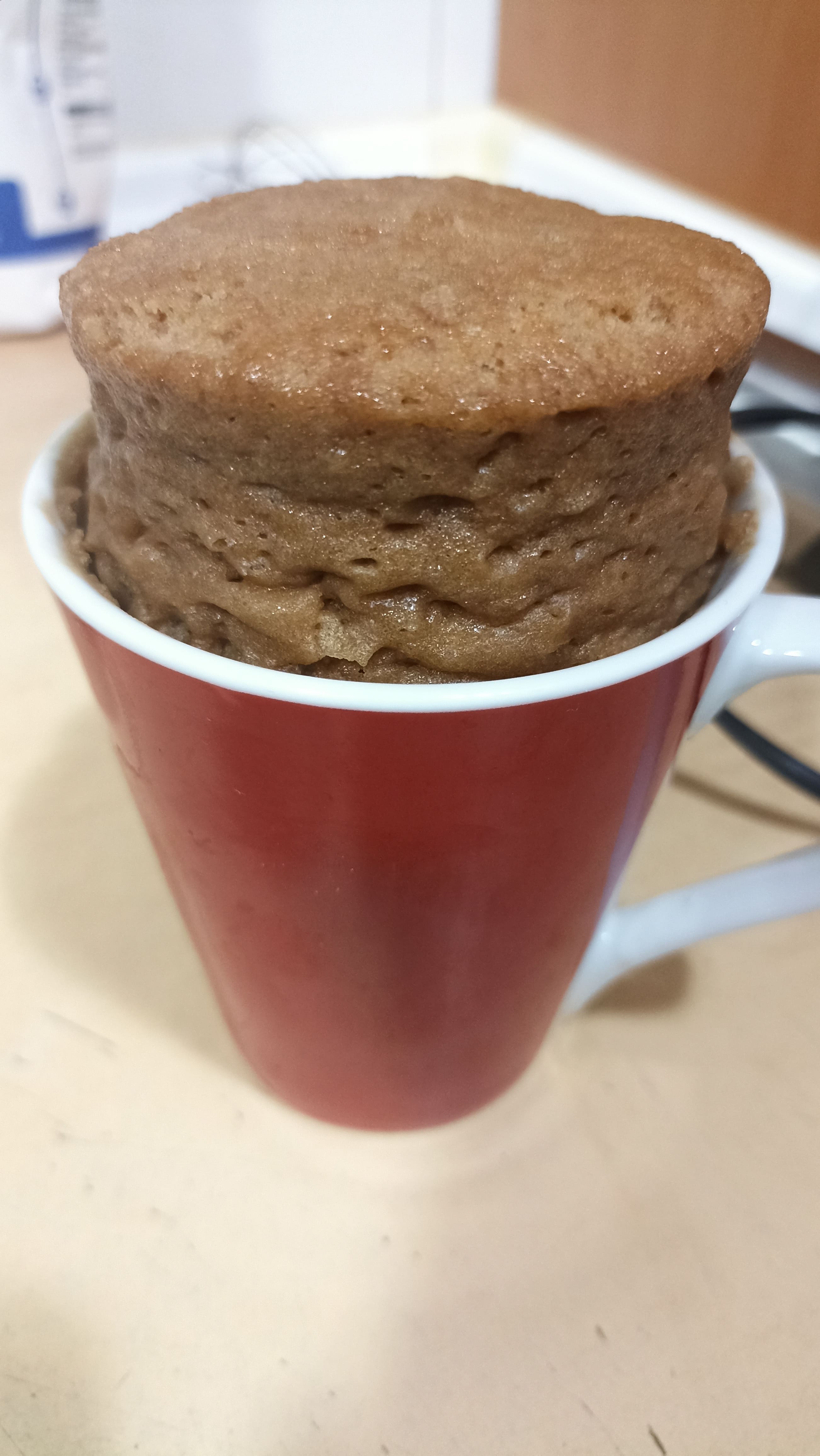 Una vez lista la mezcla de los ingredientes del bizcocho, la verteremos en una taza apta para microondas, con la ayuda de una lengua pastelera. Tenemos que tener en cuenta que no deberemos llenarla demasiado pues puede desbordarse, por lo que la llenaremos hasta un poquito más de la mitad, dejando unos 3 cms de margen. Llevaremos la taza al microondas, colocándola a un borde del plato de este, nunca en el centro a máxima potencia durante 3 minutos, cosa que puede variar dependiendo del microondas, por lo que deberéis vigilar cuál es su potencia (lo recomendado son 800 W) y como va subiendo el bizcocho. Dejaremos enfriar unos 5 minutos para que se asiente y poder la nata encima con la ayuda de una manga pastelera, decoraremos con las perlas de chocolate y una galleta partida a la mitad.