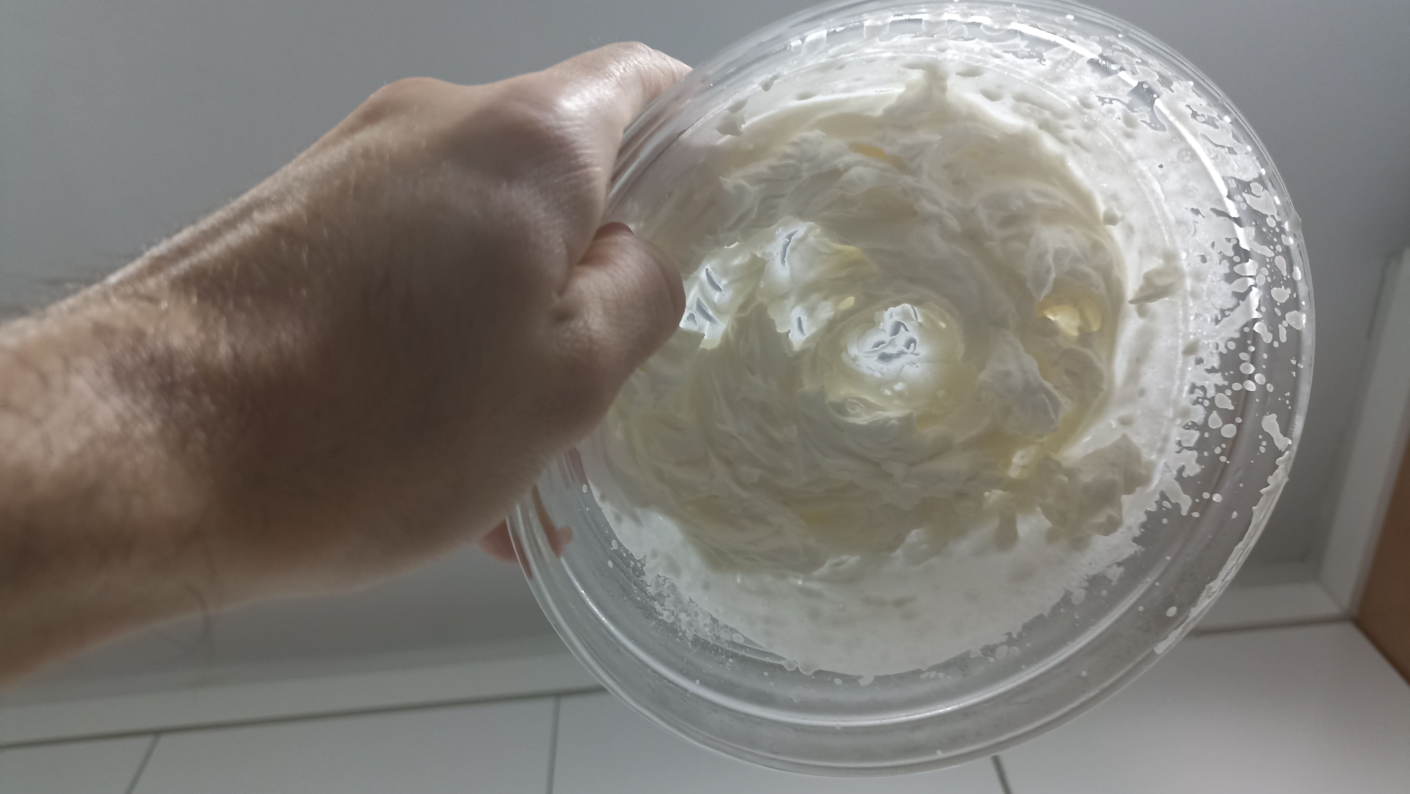 Vertemos la nata e iremos batiendo con la ayuda de una varilla bien manual o eléctrica, lo que tengáis por casa. Comenzaremos a batir la nata y cuando empiecen a salir burbujas, añadiremos el azúcar glass poco a poco y sin dejar de batir hasta que esta esté consistente. Para saber cuando está lista, solo tenemos que darle la vuelta al bol y si no se cae la tendremos en el punto óptimo, pero cuidado y aseguraos que tiene algo de consistencia si no queréis naparos y endulzaros la cara.