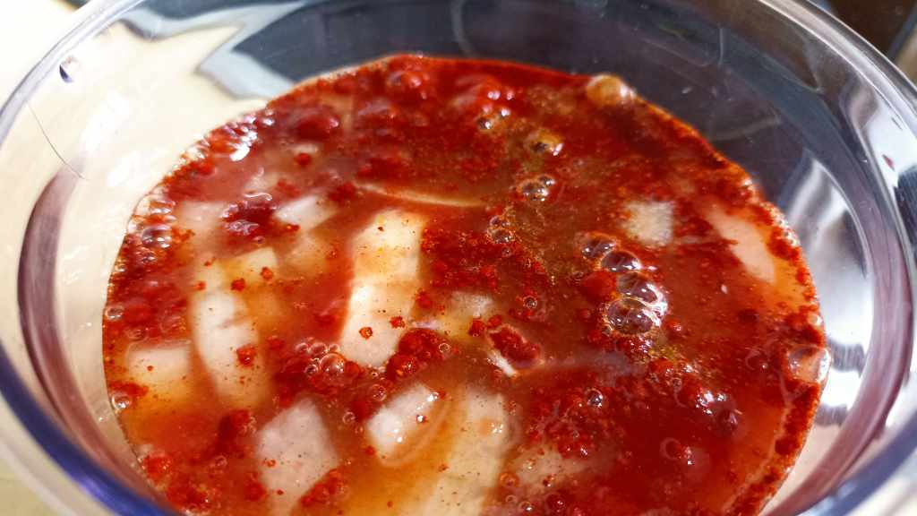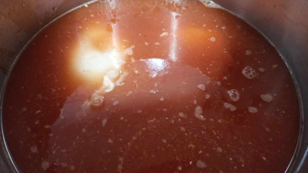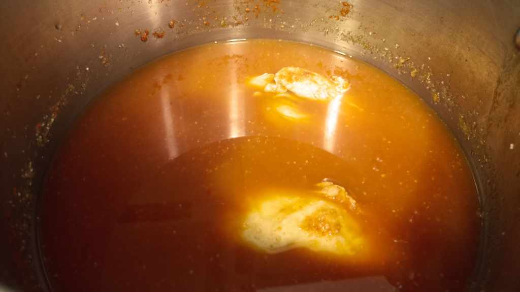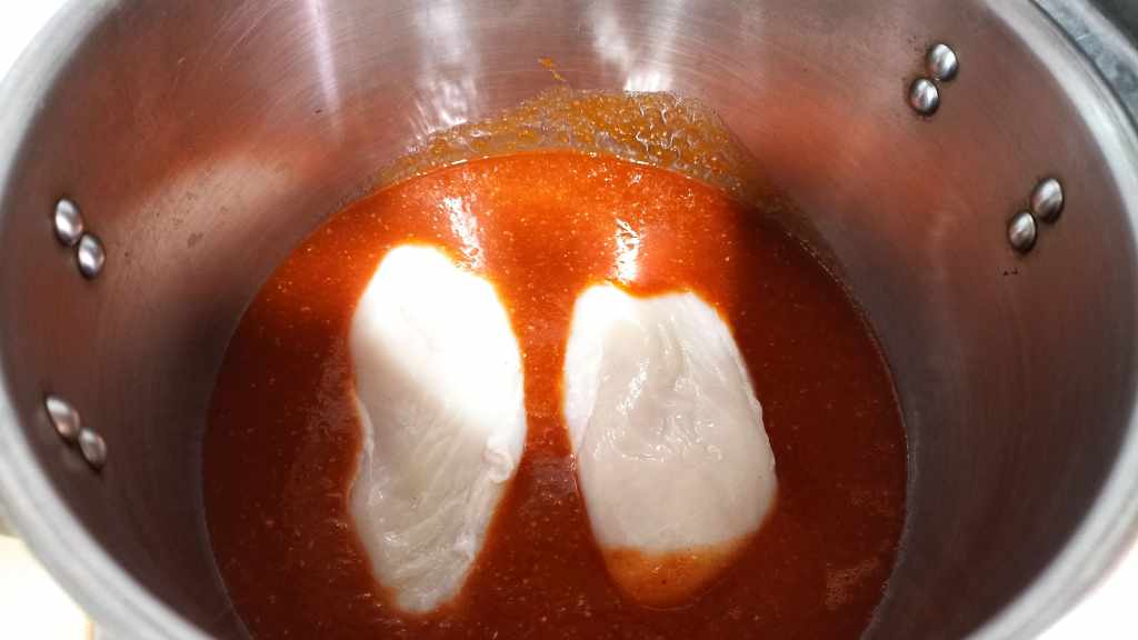 Para ello, vamos a colocar la salsa en la olla, añadiremos las pechugas y las removeremos. Ahora solo nos queda cubrir con agua y añadir algo de sal. Tapamos la olla y dejamos cocer.