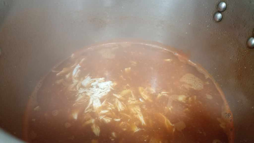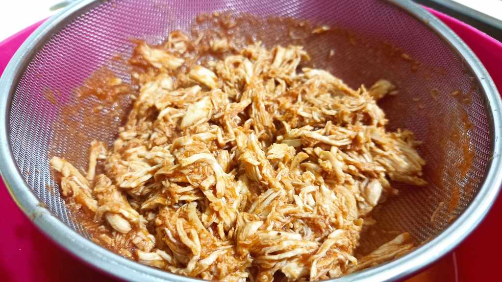 Ahora solo nos queda deshilachar las pechugas de pollo y cuando las tengamos preparadas, añadirlas a la salsa que hemos vuelto a colocar en el fuego, dejando cocinar dos minutos y removiendo bien para que se integre el sabor.