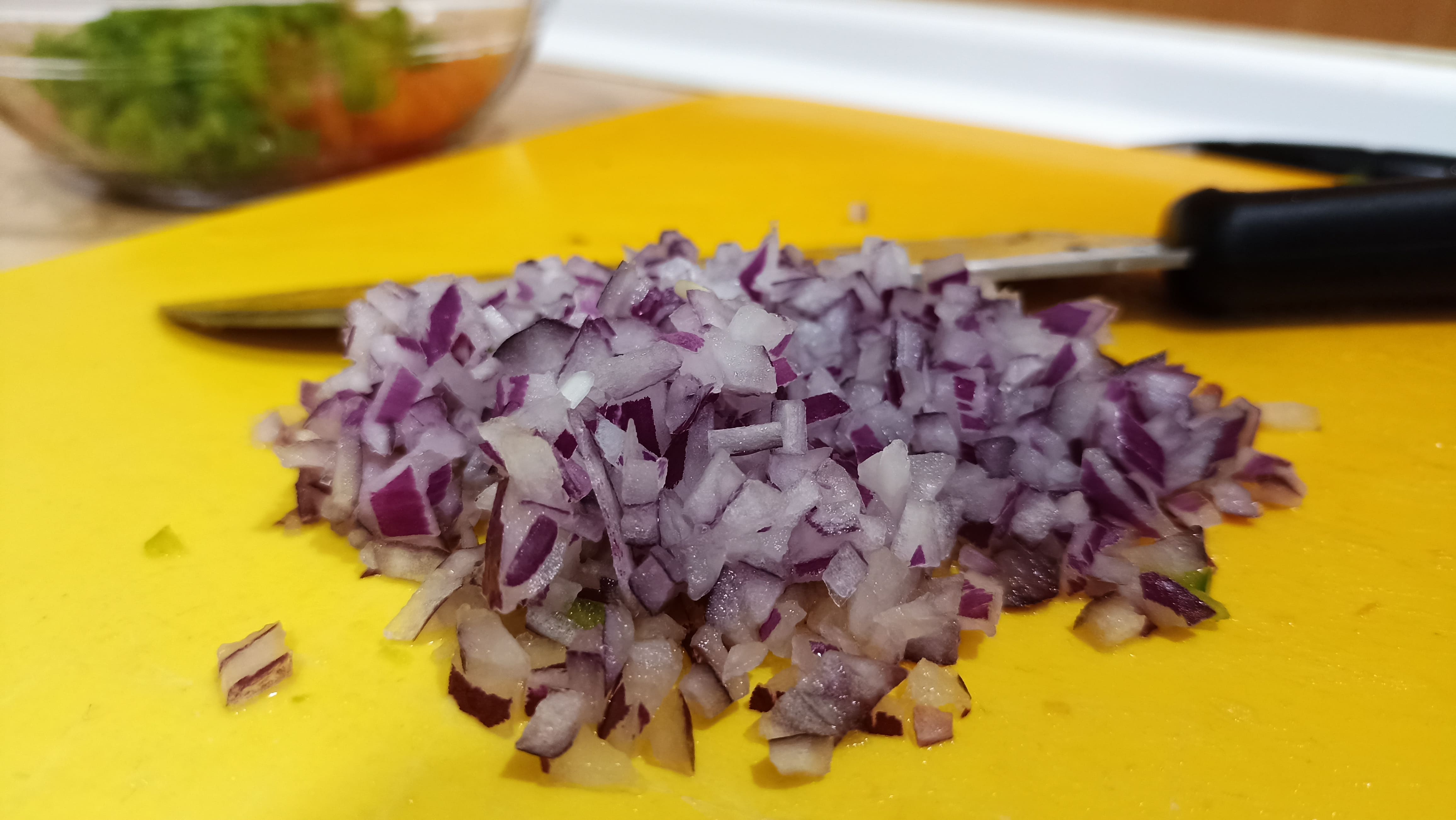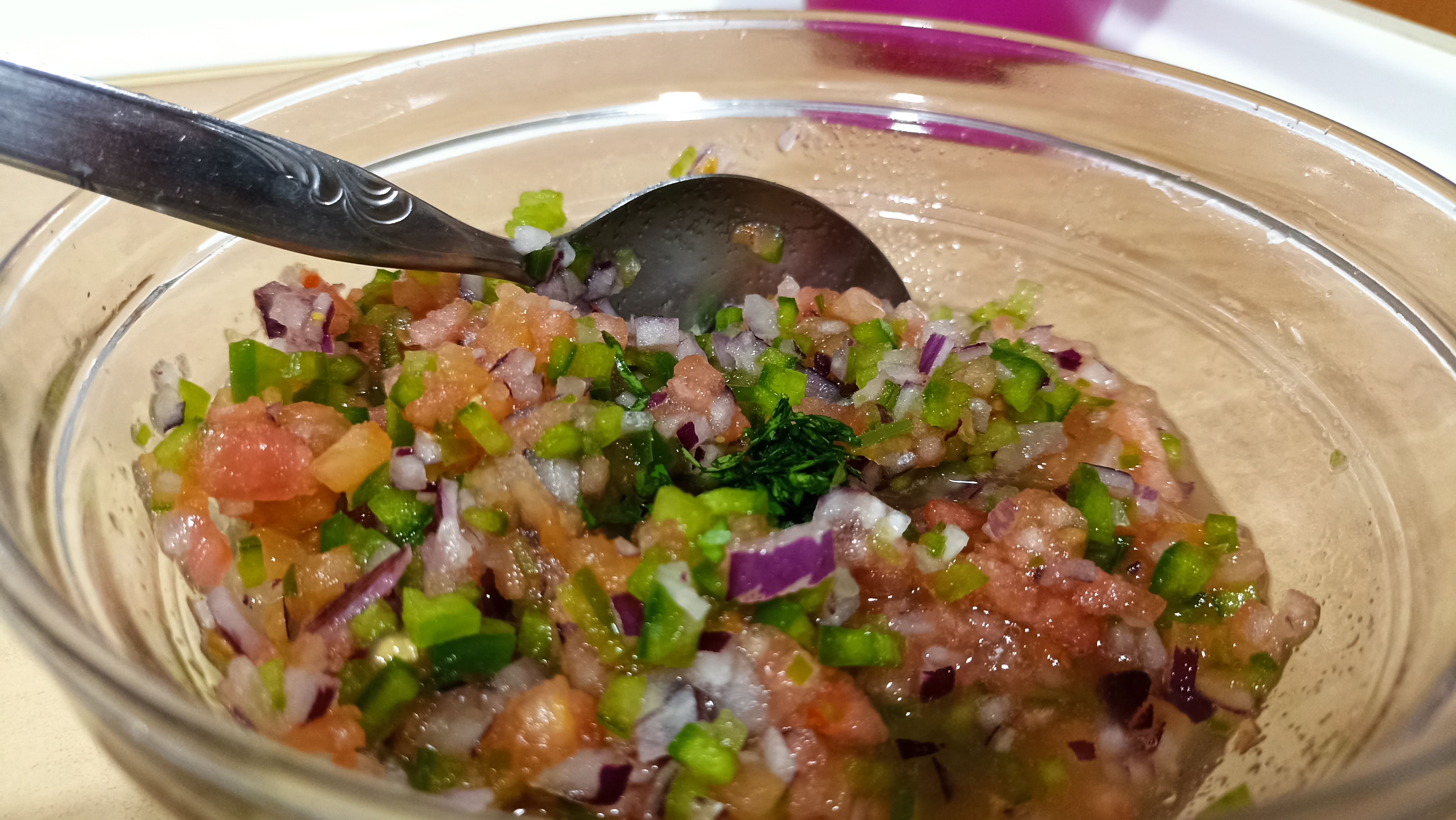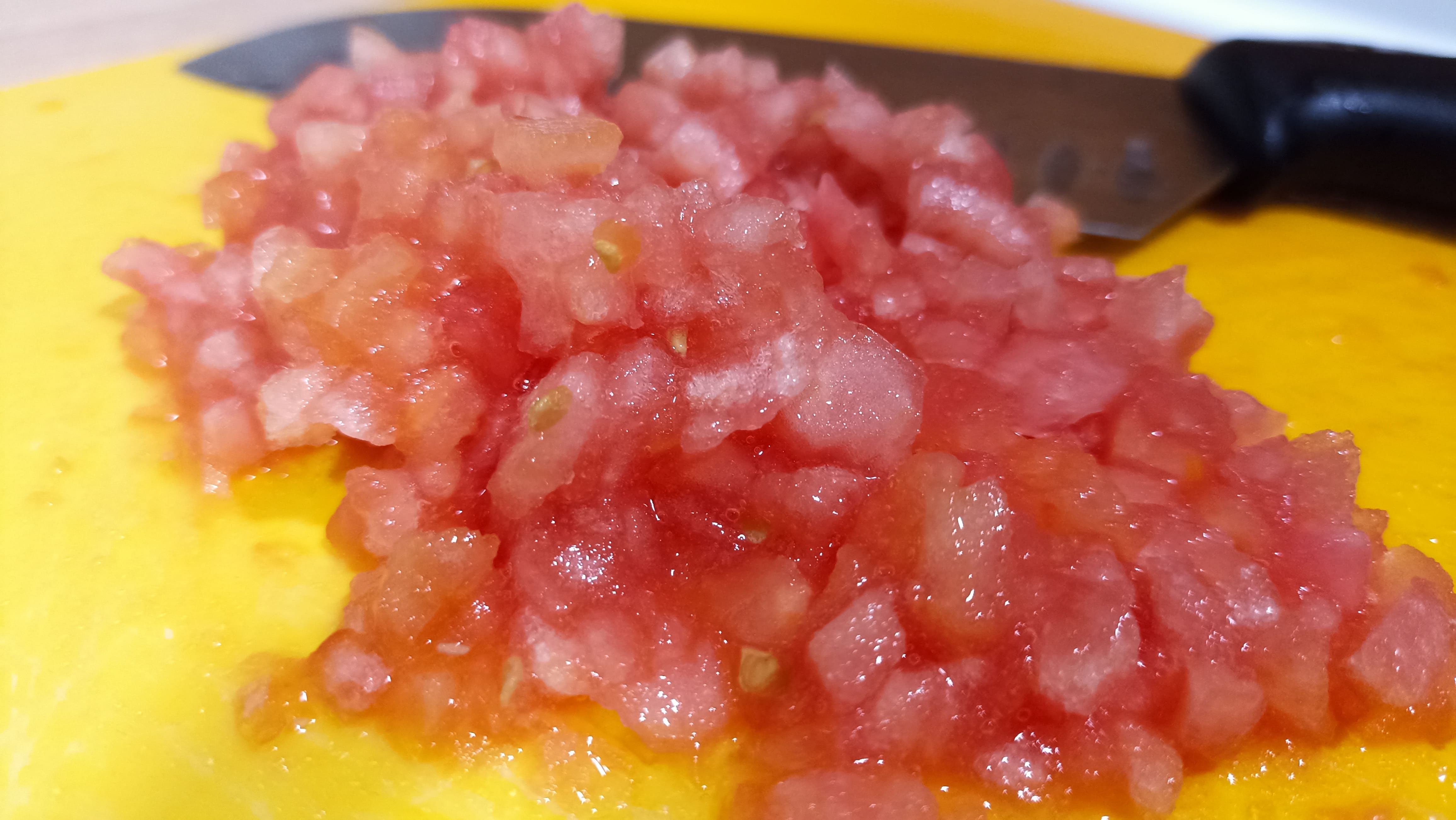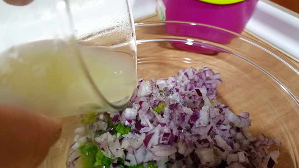 Ahora, nos toca ir preparando el pico de gallo, por lo que solo vamos a tener que cortar en brunoise (ya sabéis, trozos pequeños) el pimiento, la cebolla y los tomates previamente pelados y despepitados. Mezclamos todos los ingredientes y añadiremos el zumo de lima, removiendo bien. Para rematar, añadiremos cilantro picado y sal a nuestro gusto, dejando reposar la mezcla durante un rato en la nevera.