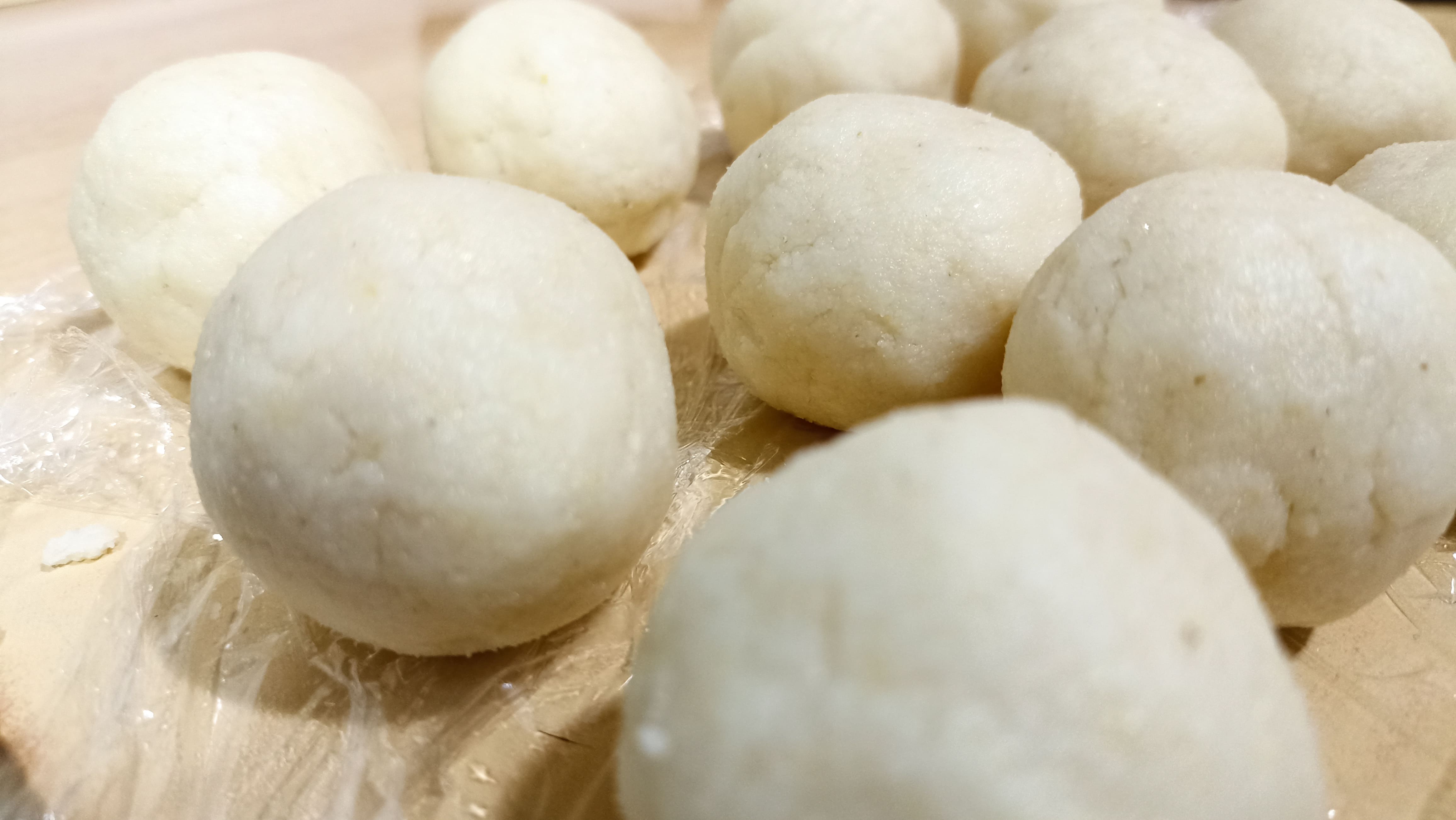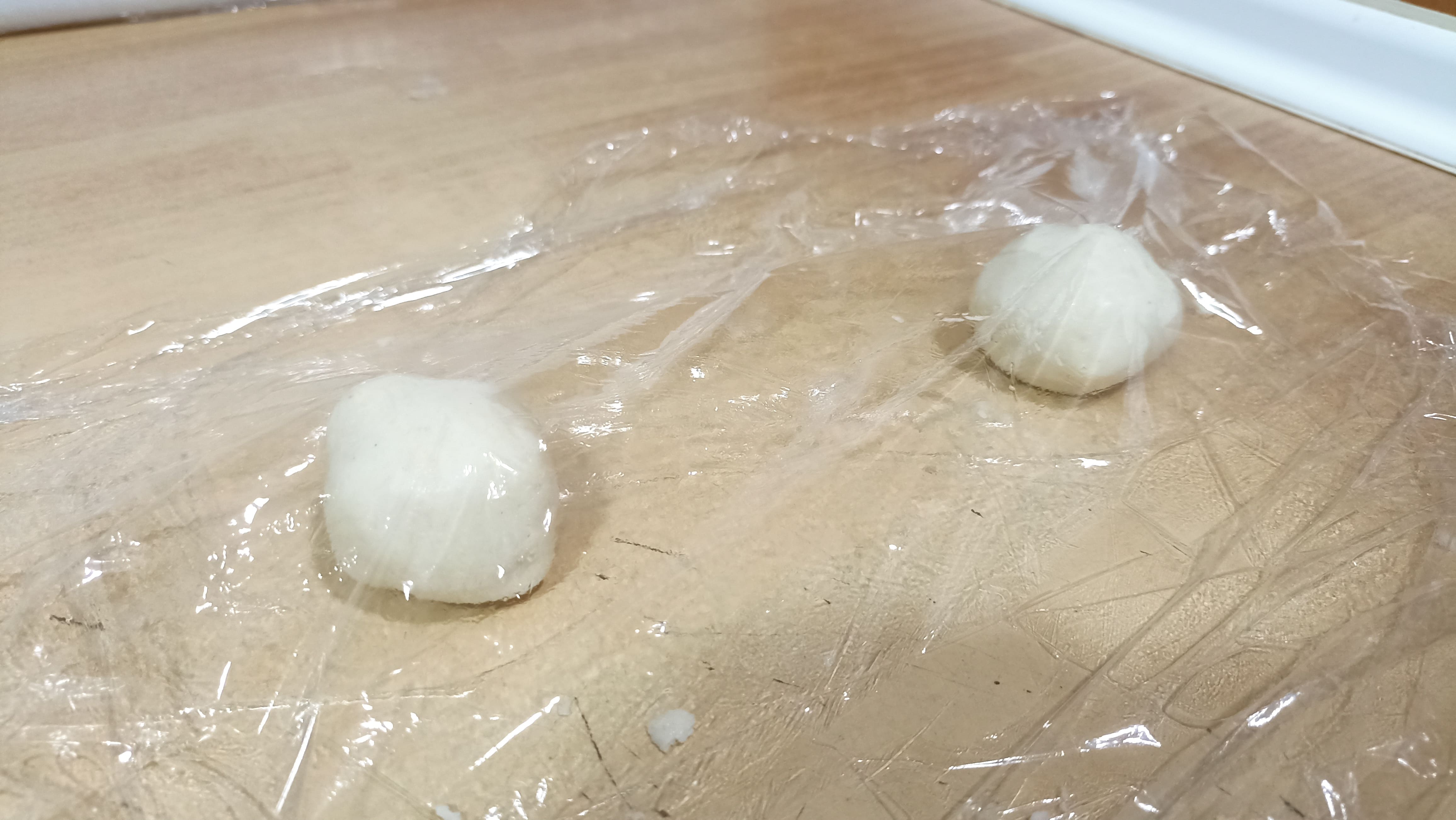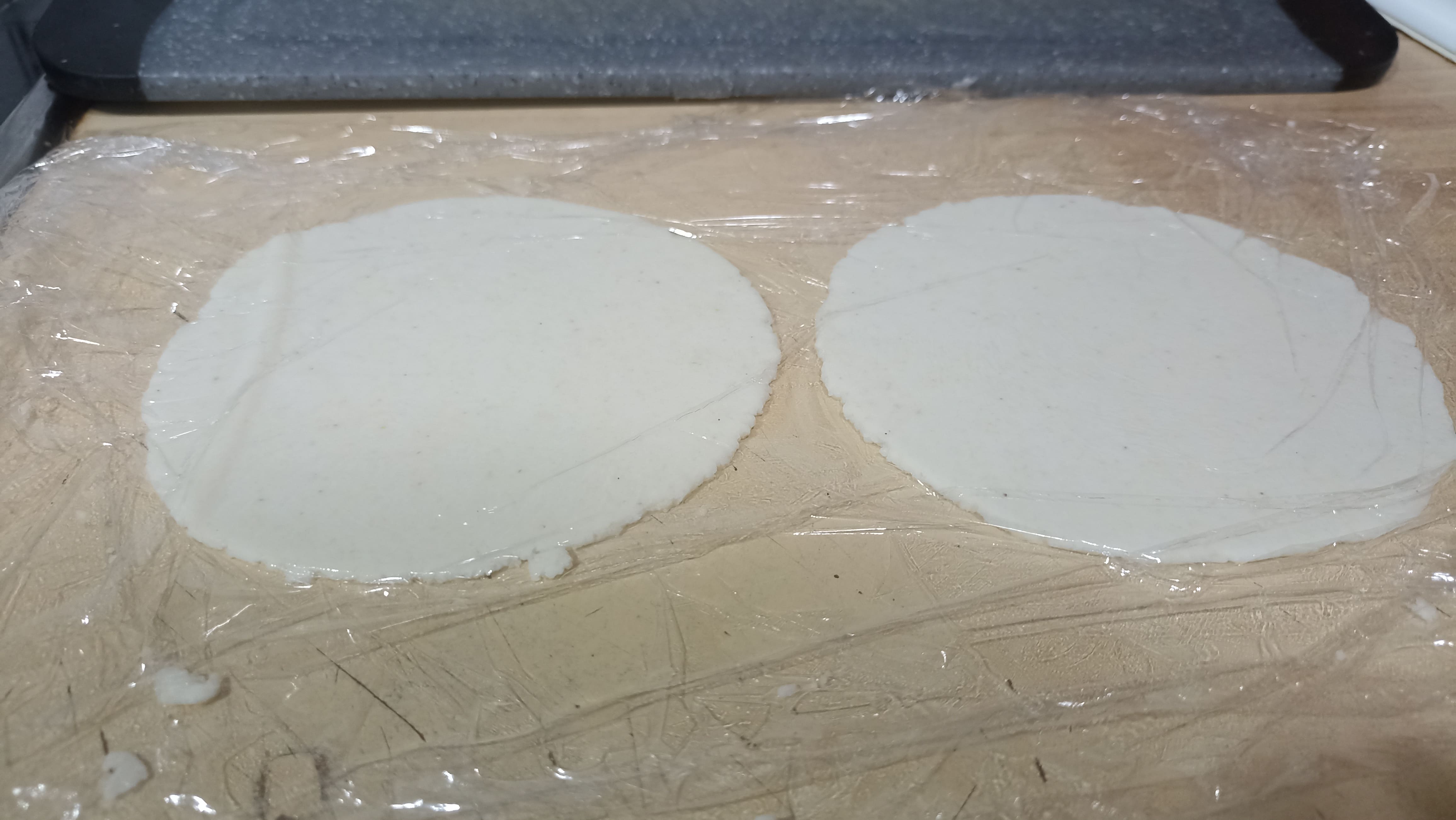 Dividimos la masa en bolitas del tamaño de una pelota de ping pong (más o menos) para después, aplastarlas con algo plano y que tenga peso, con cuidado, entre dos trozos de papel film, quedando lo más finas posible, de apenas varios milímetros de grosor. También podemos optar por utilizar un rodillo, pero el proceso va a quedar algo más irregular o recurrir a utilizar un aro para que las tortillas queden perfectas.