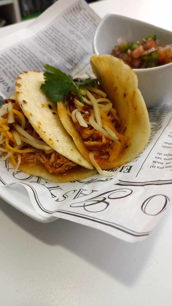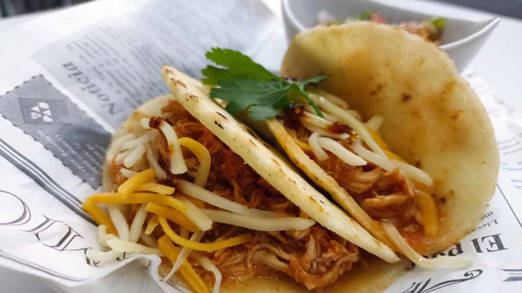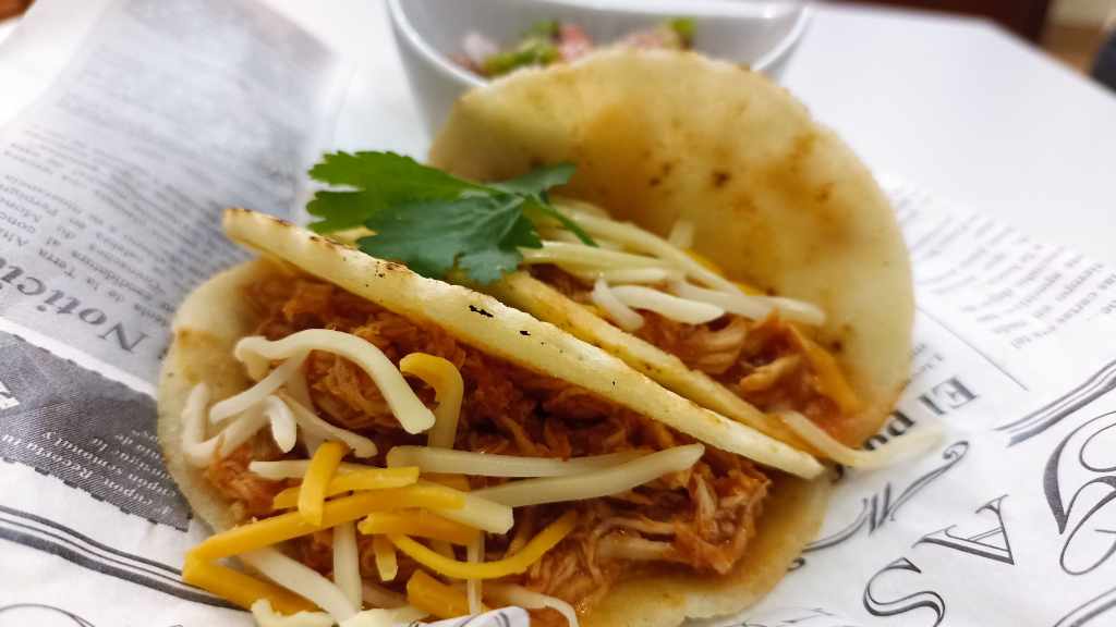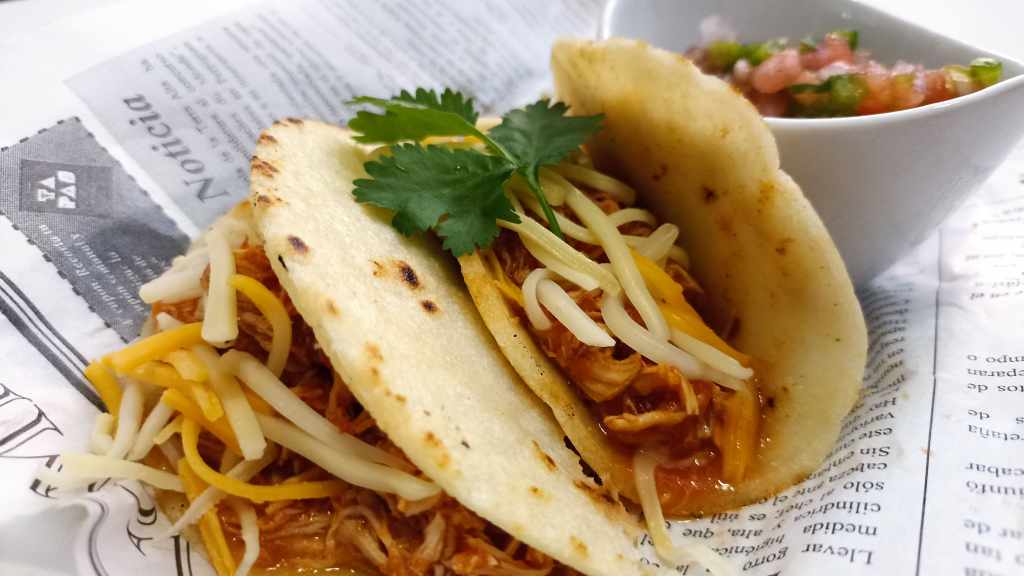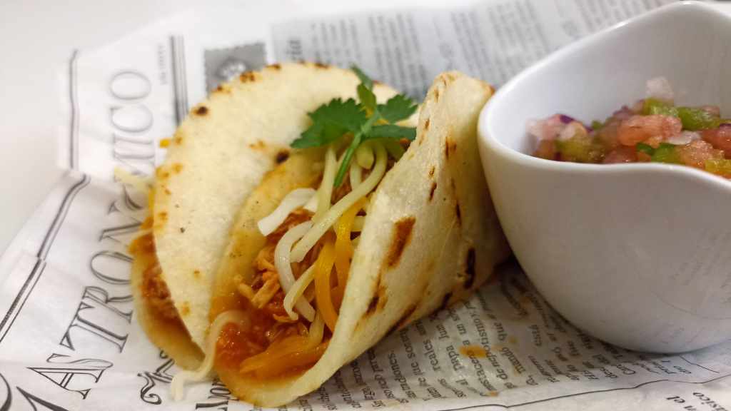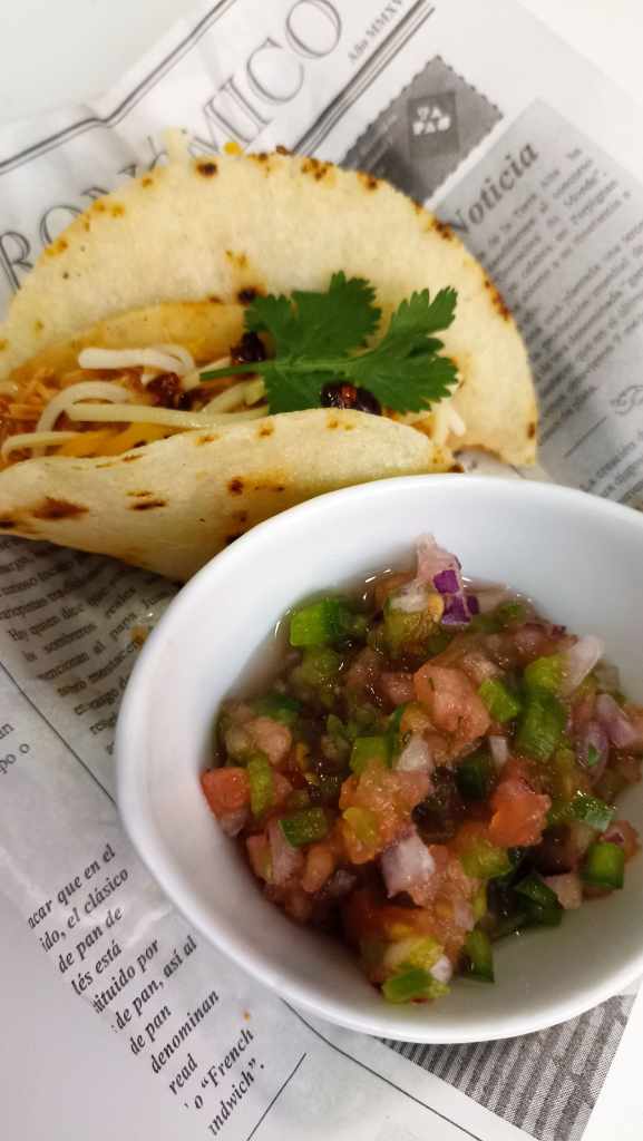 Finalmente, solo nos queda preparar el plato, colocando de base una tortilla, colocando el relleno en el medio de esta, añadiendo el pico de gallo, un poco de cilantro y queso al gusto.