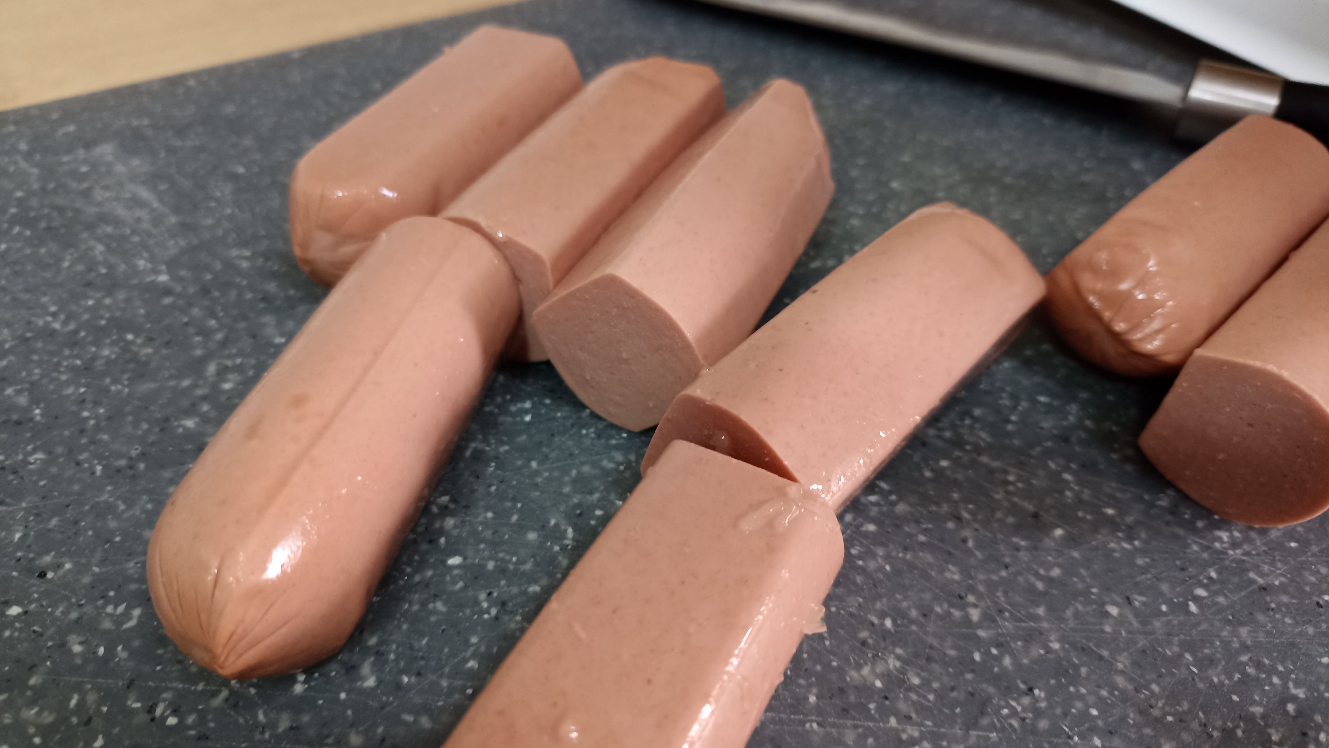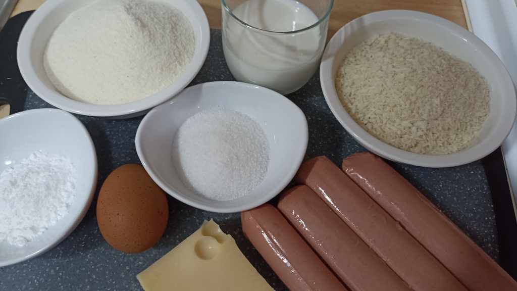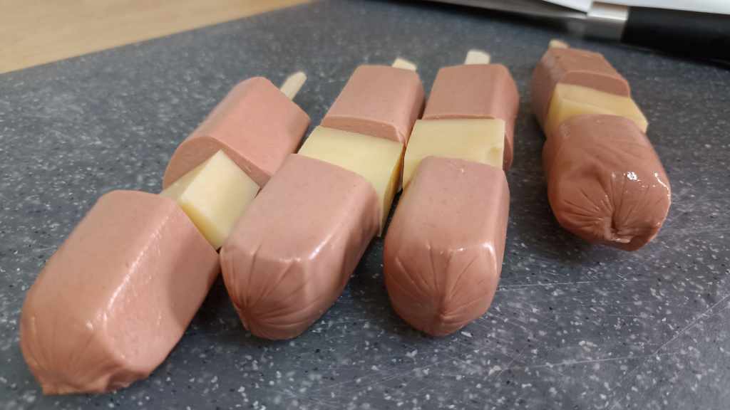 Mientras tanto, vamos a cortar las salchichas en trozos, al igual que el queso. Ahora vamos a insertarlos en brochetas, colocando un trozo de salchicha de primeras y a continuación un trozo del queso.