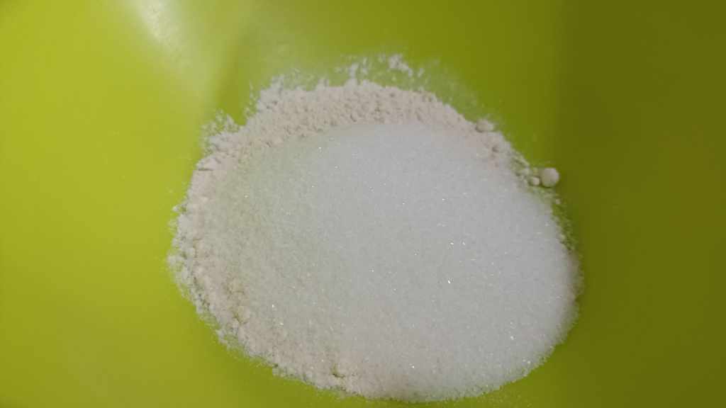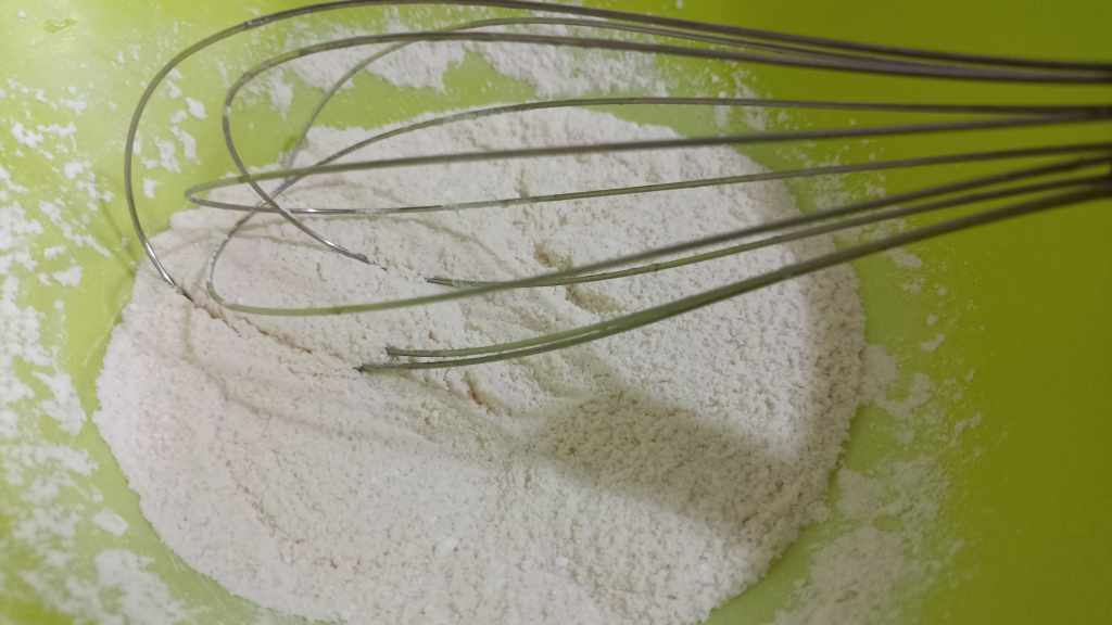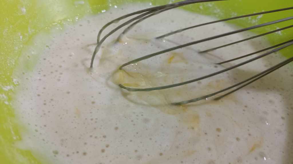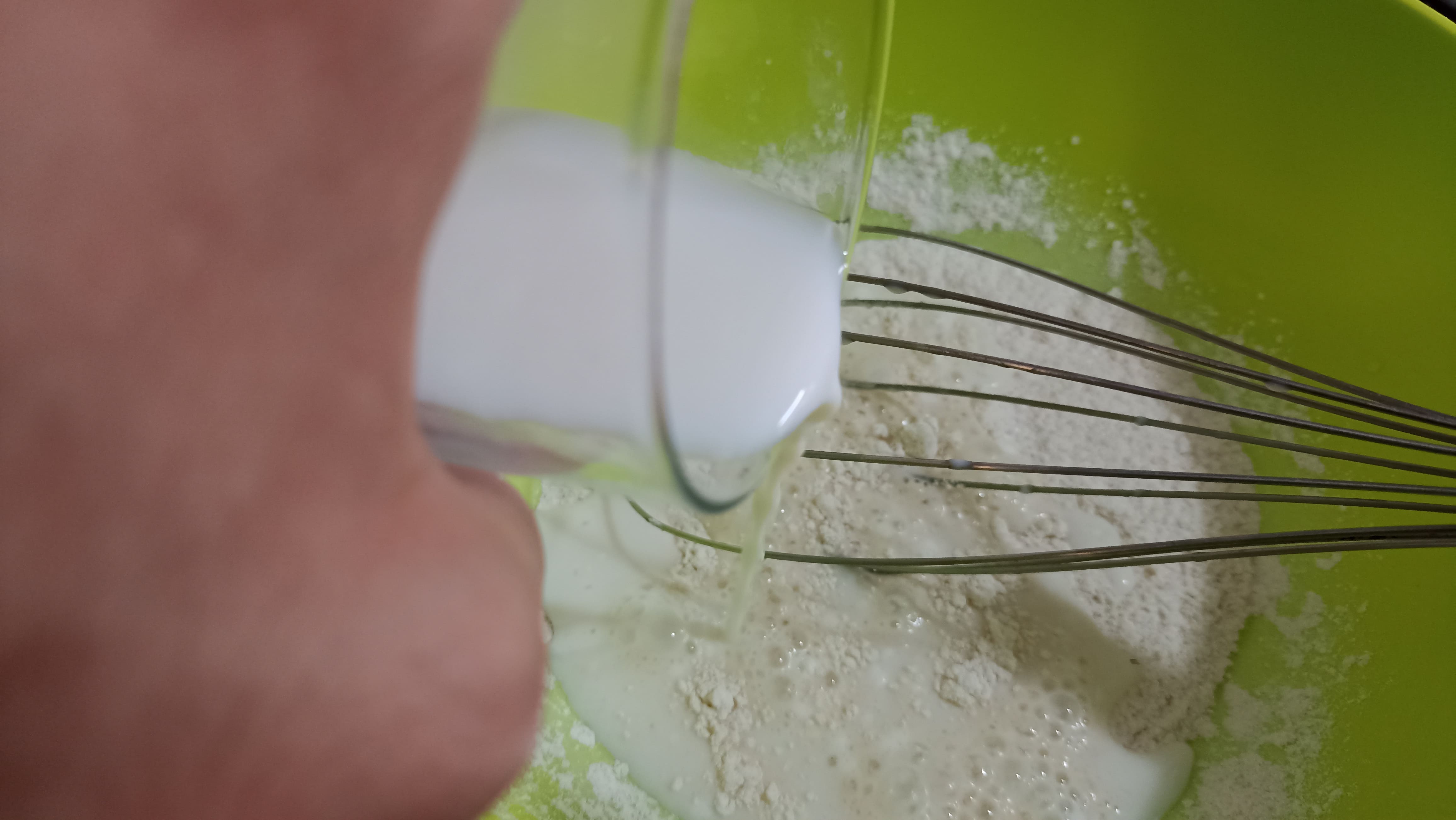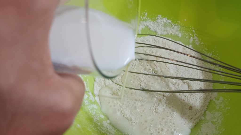 Primero vamos a mezclar todos los ingredientes sólidos, es decir, la harina de trigo, la levadura en polvo, el azúcar y la sal. Removemos bien para que se mezclen todos los ingredientes y a continuación y poco a poco vamos a añadir la leche mezclada con el agua, removiendo bien con la ayuda de una varilla hasta obtener una masa consistente y pegajosa. Esta será perfecta cuando caiga lentamente desde la varilla al alzarla un poco, es decir, que se estire sola. Una vez formada la masa, la dejaremos en la nevera durante una hora aproximadamente para que enfríe.