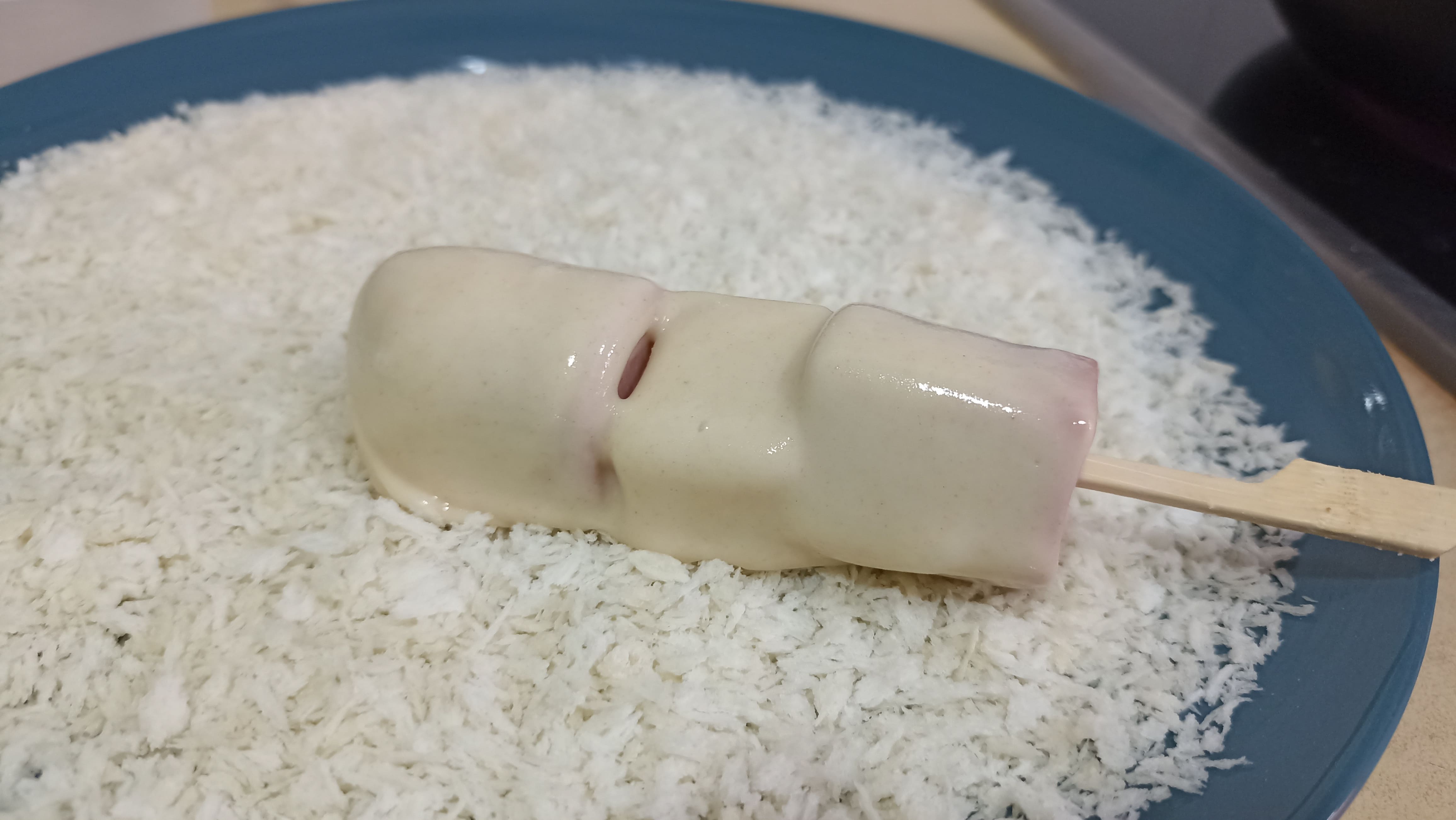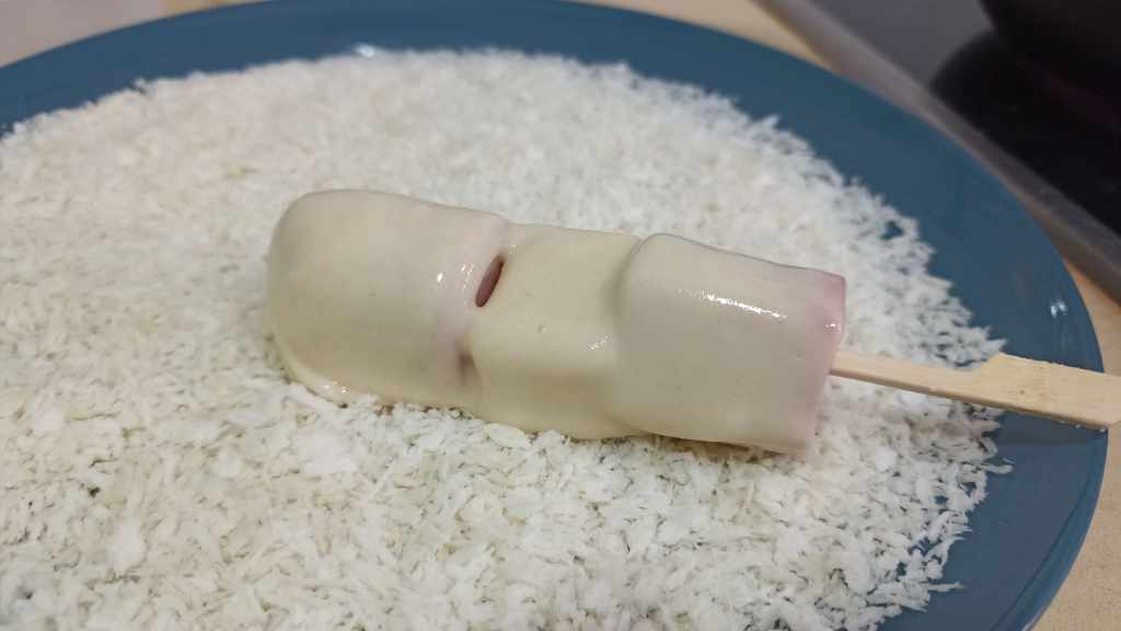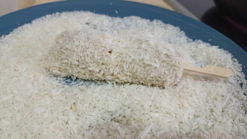 Sacamos la masa de la nevera y cubrimos las brochetas con ellas. Para ello y para empezar a hacerlo golpearemos la brocheta contra la masa extendida en un plato para que esta se pegue en el queso y a continuación iremos enrollando para que esta se integre y cubra toda la pieza.