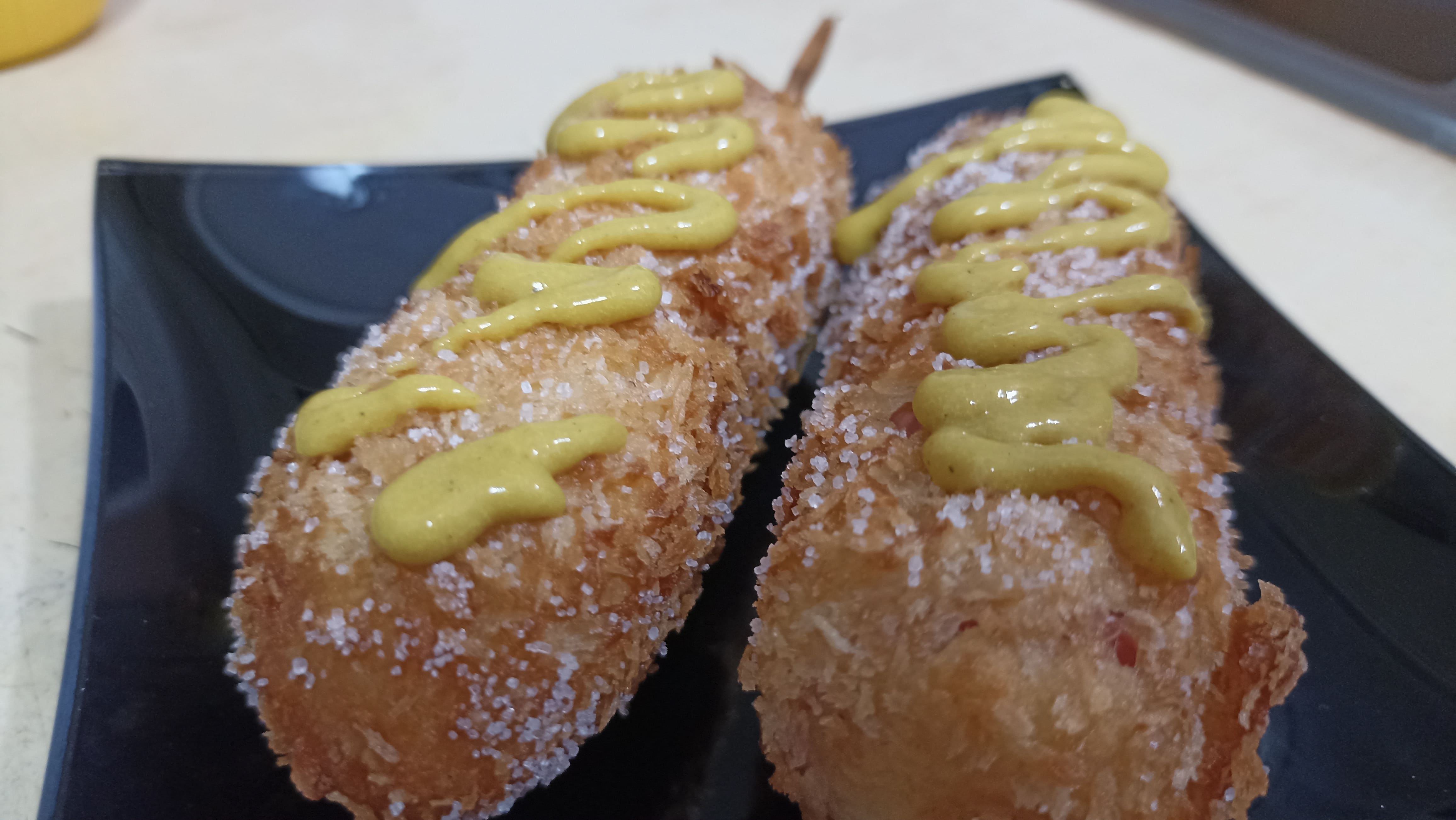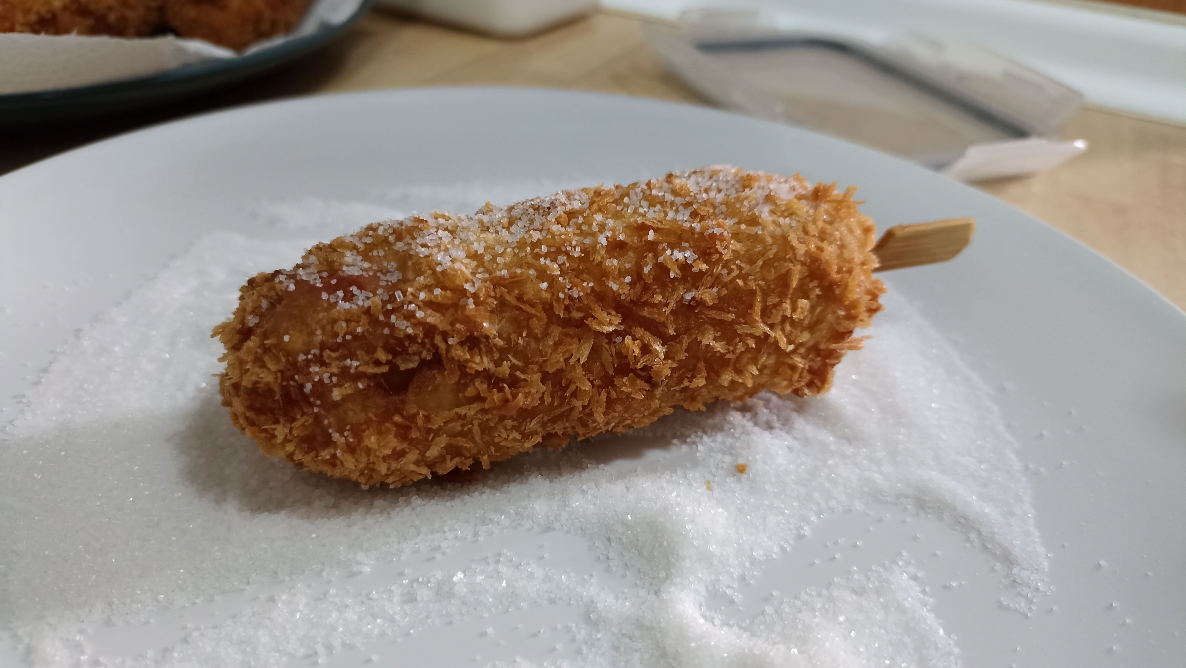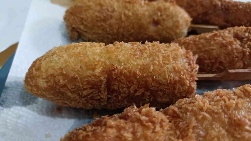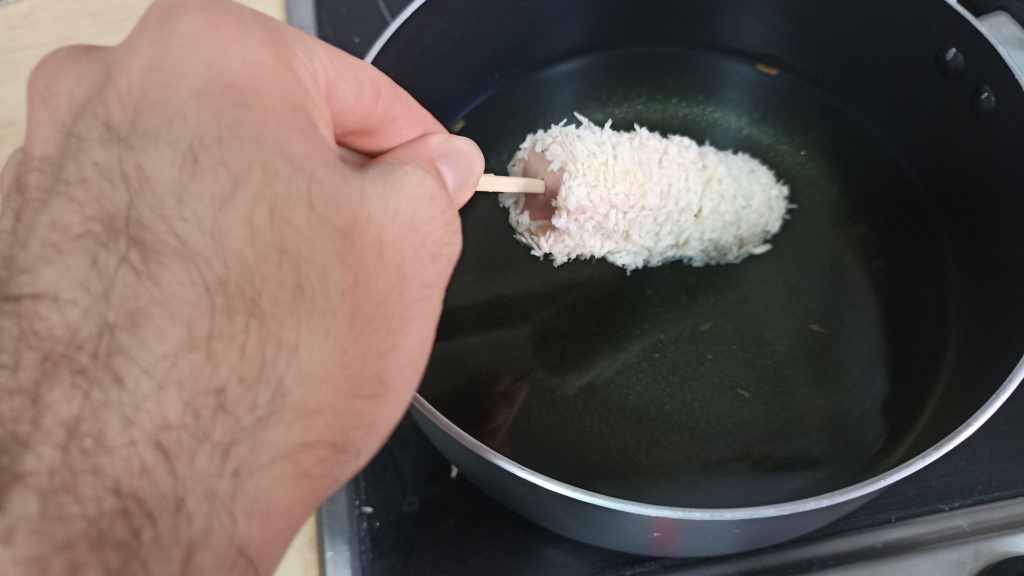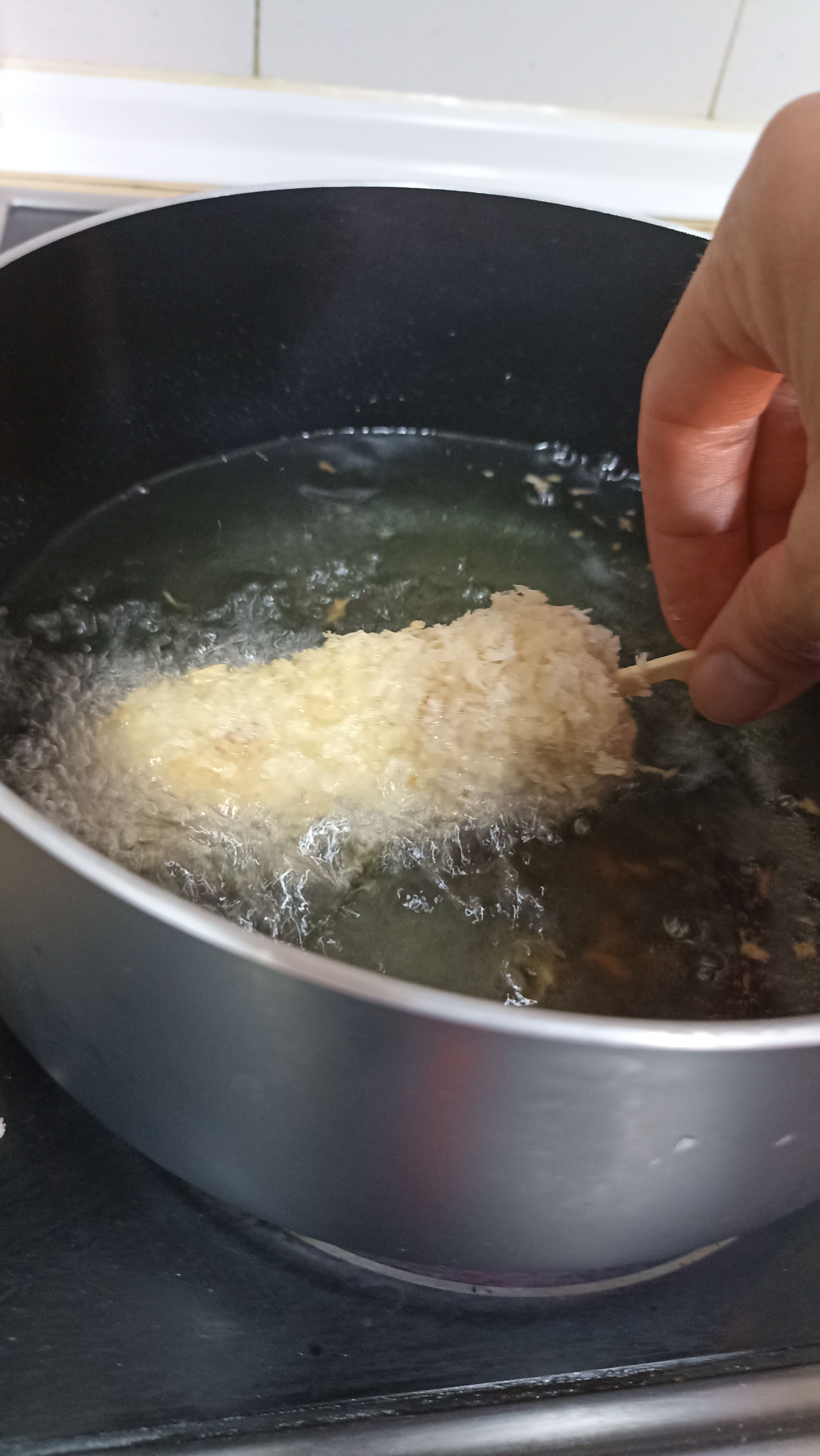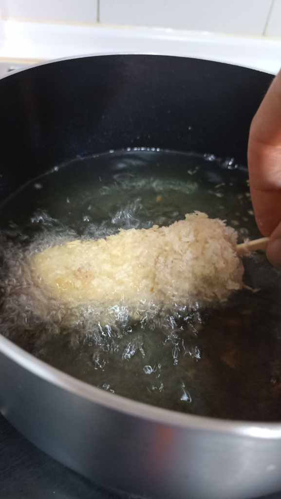 Una vez cubierta la brocheta la volveremos a pasar por el panko y las freiremos en una cazuela con bastante aceite caliente a la que bajaremos la temperatura al introducir la primera pieza. Para ello y con mucho cuidado de no quemarnos vamos a sujetar la brocheta y la vamos a ir volteando para que se fría y dore por ambos lados. Con un par de minutos por cada lado será suficiente para que la masa se cocine del todo.