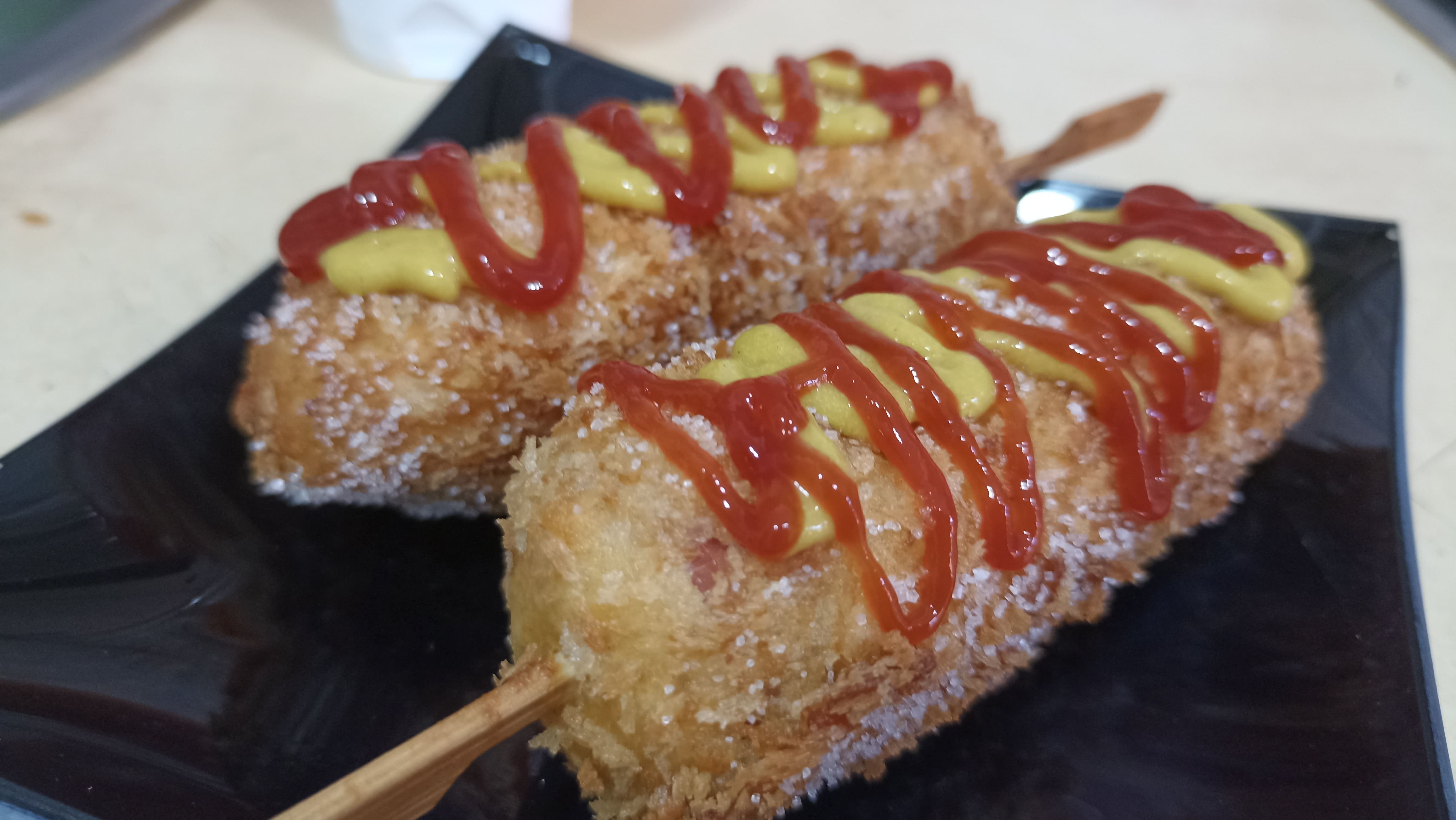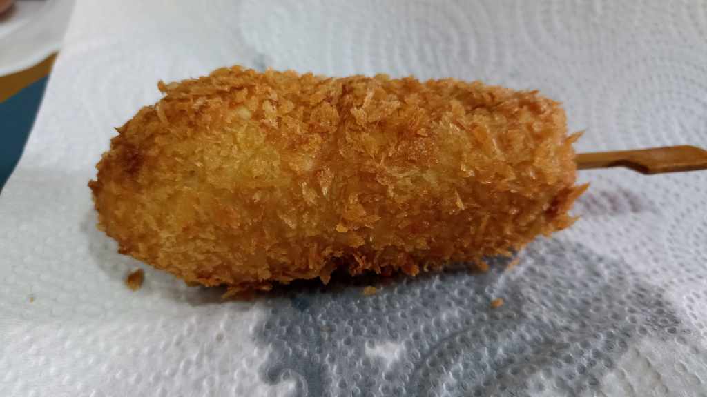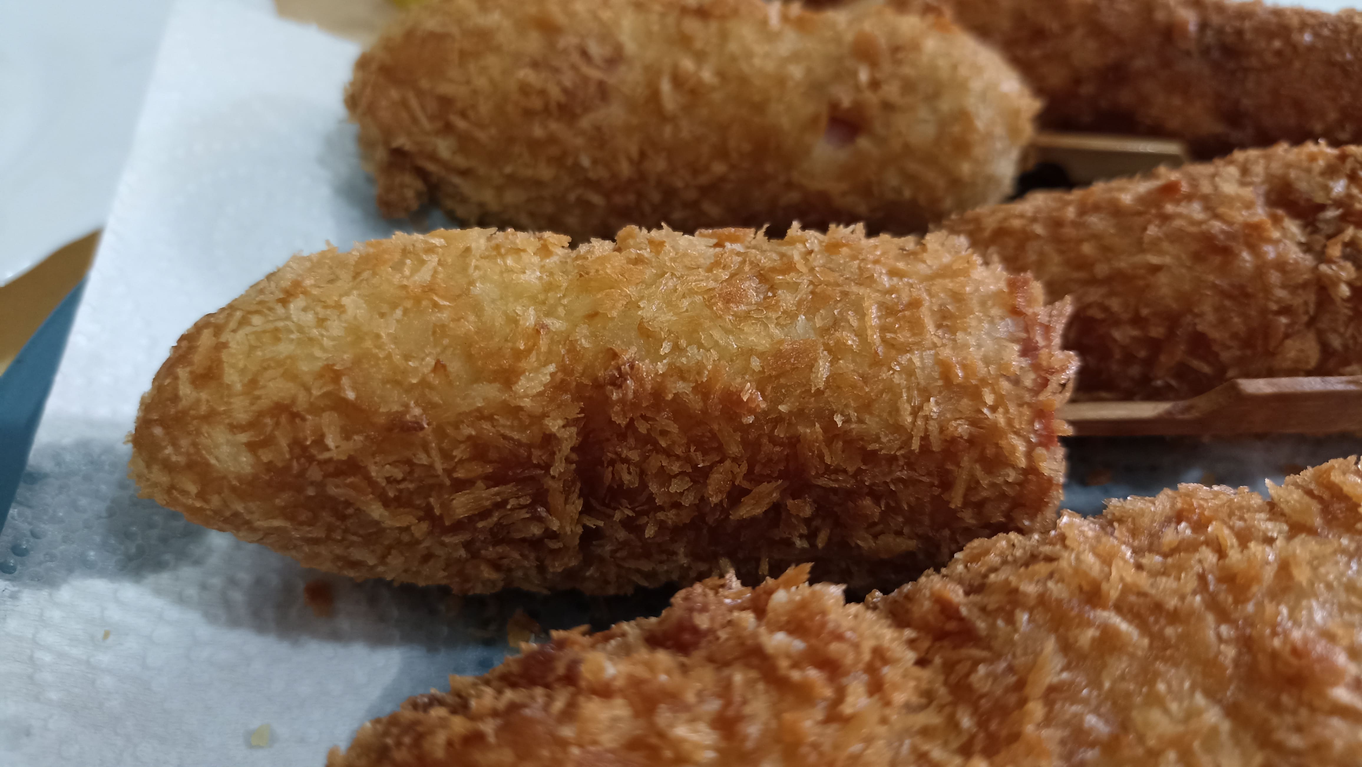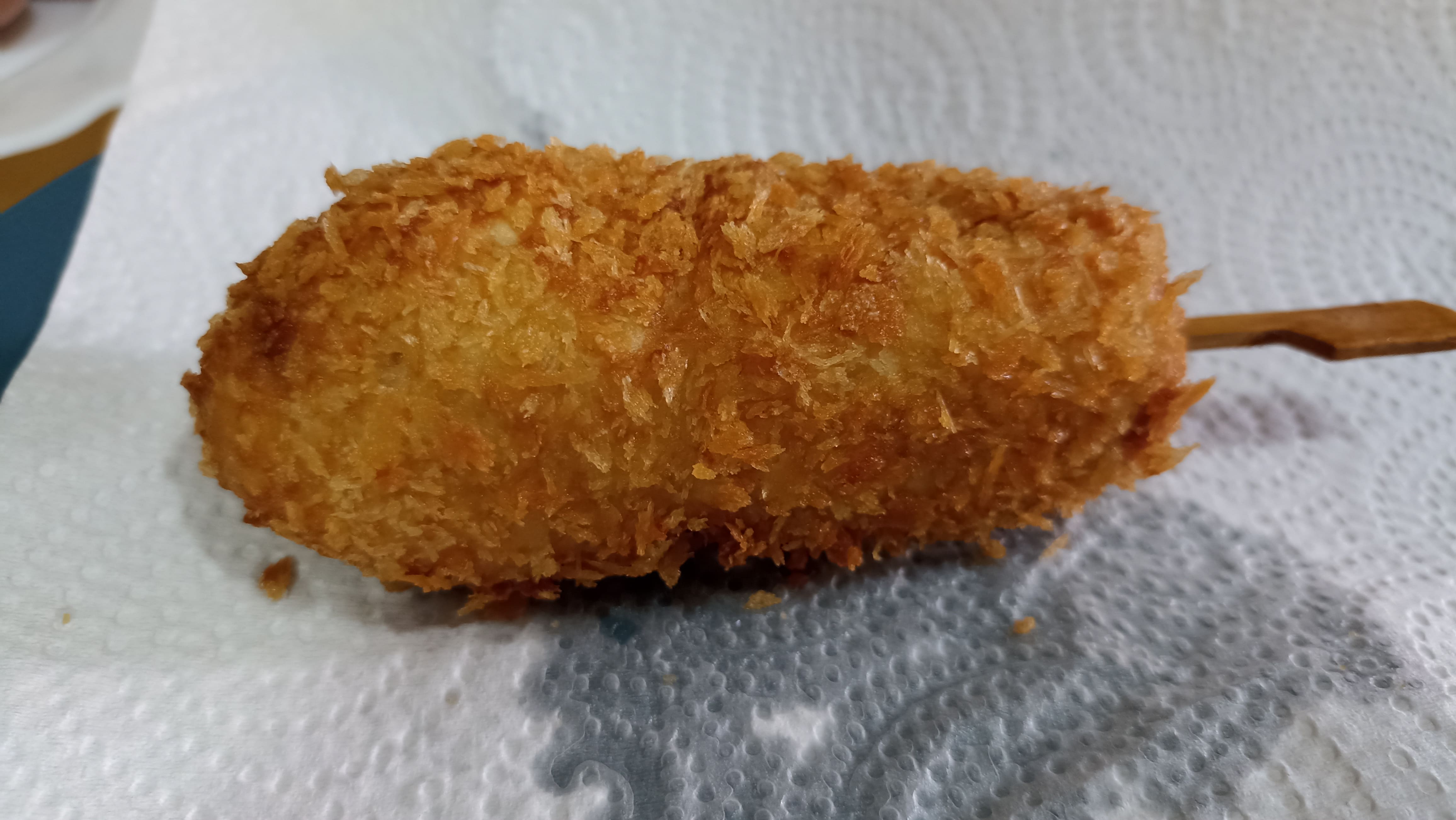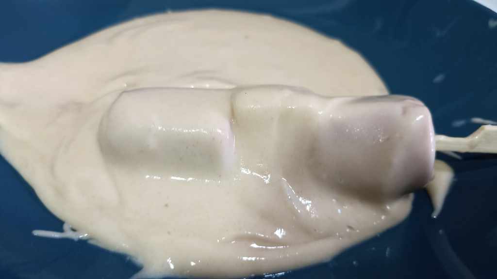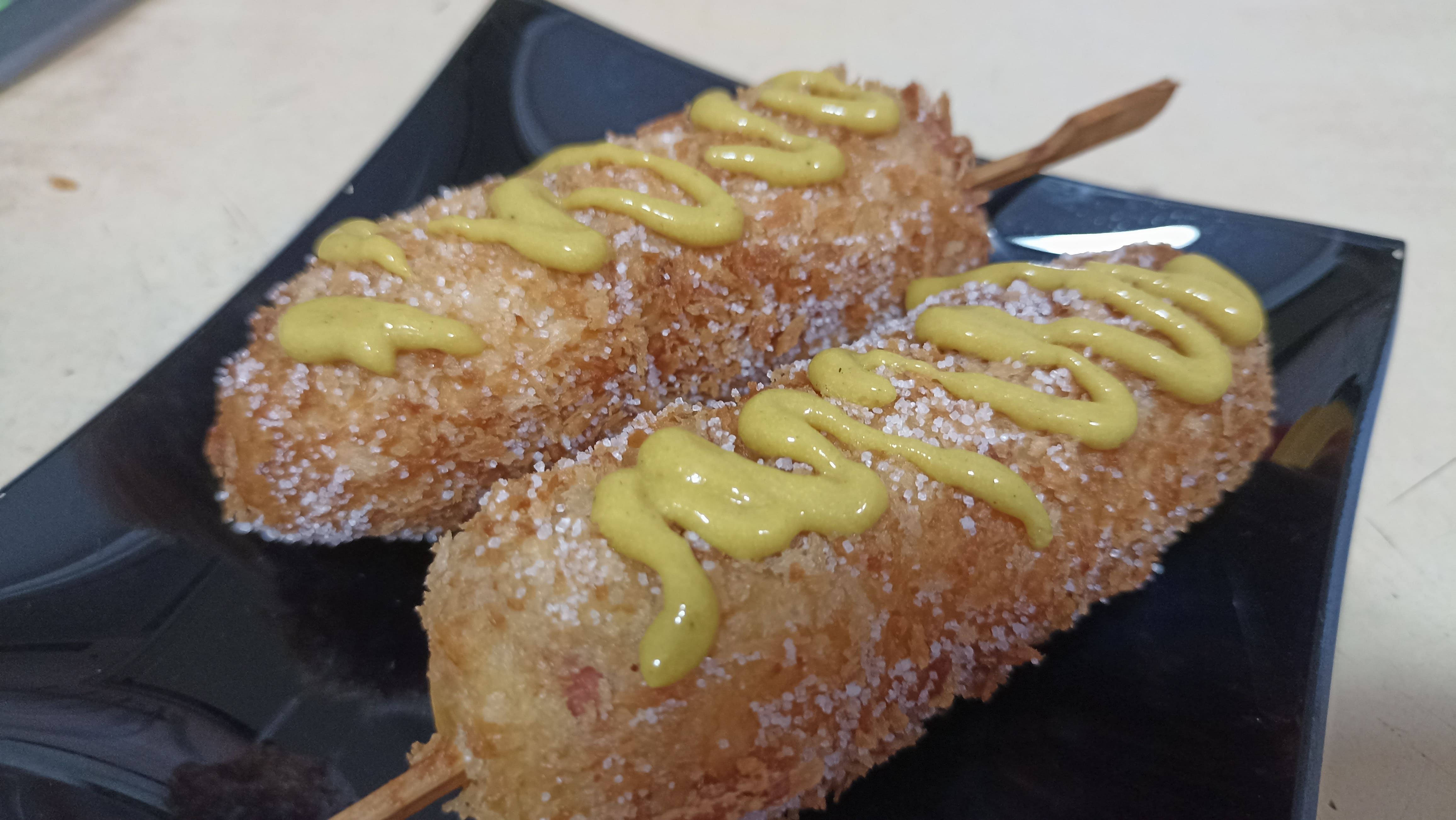 Una vez cubierta la brocheta la volveremos a pasar por el panko y las freiremos en una cazuela con bastante aceite caliente a la que bajaremos la temperatura al introducir la primera pieza. Para ello y con mucho cuidado de no quemarnos vamos a sujetar la brocheta y la vamos a ir volteando para que se fría y dore por ambos lados. Con un par de minutos por cada lado será suficiente para que la masa se cocine del todo.