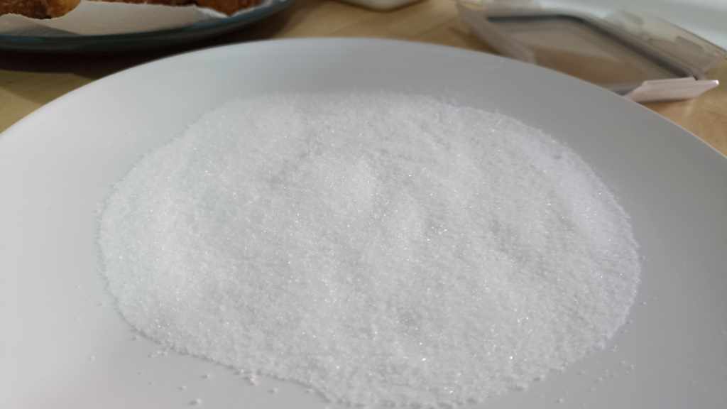 Sacamos del aceite y ponemos la brocheta en un plato con papel absorbente para retirar el exceso de grasa. A continuación, la pasaremos ahora por azúcar para recubrirla.