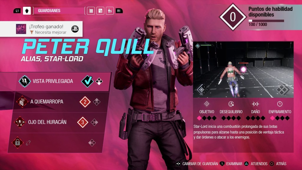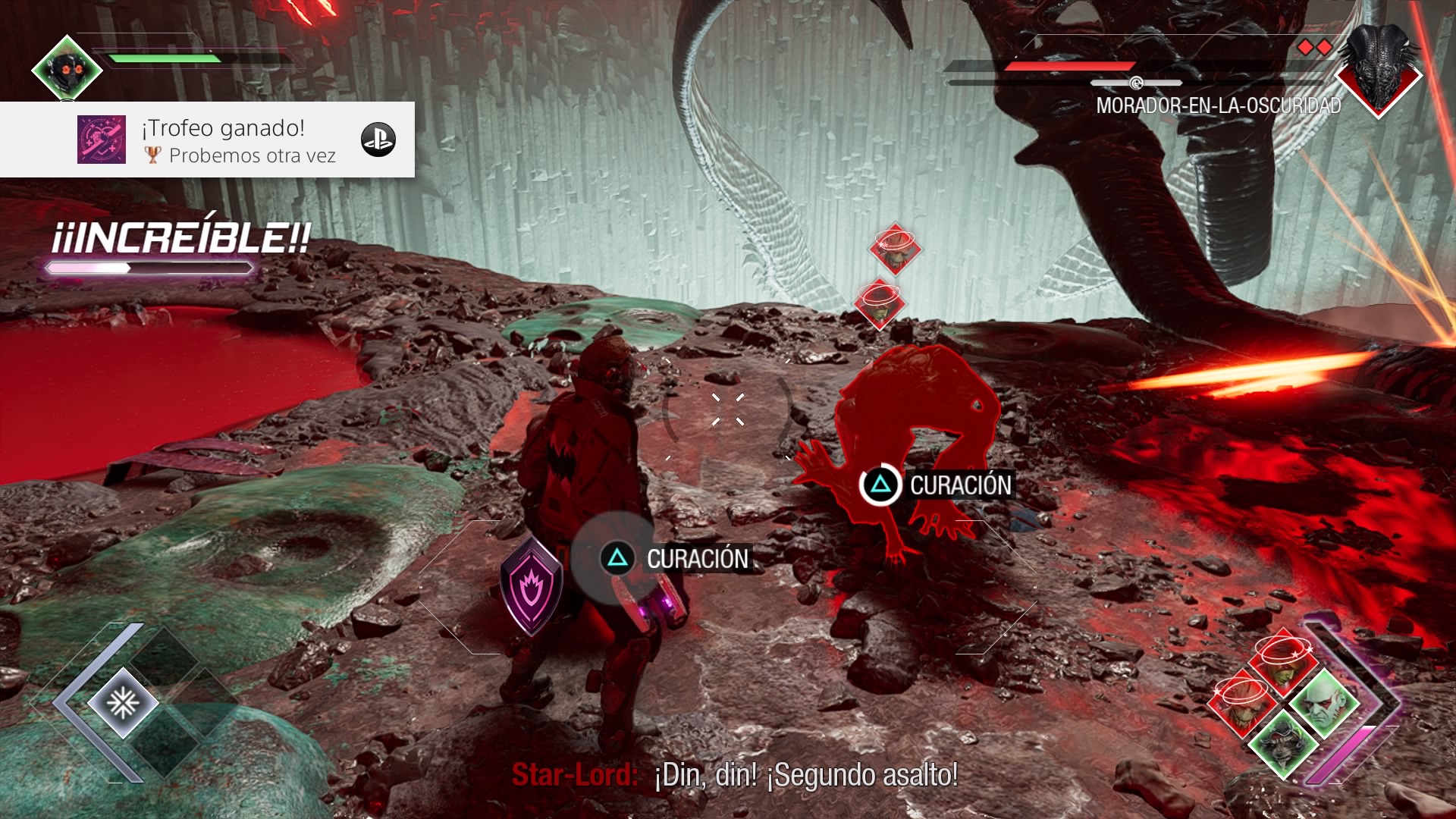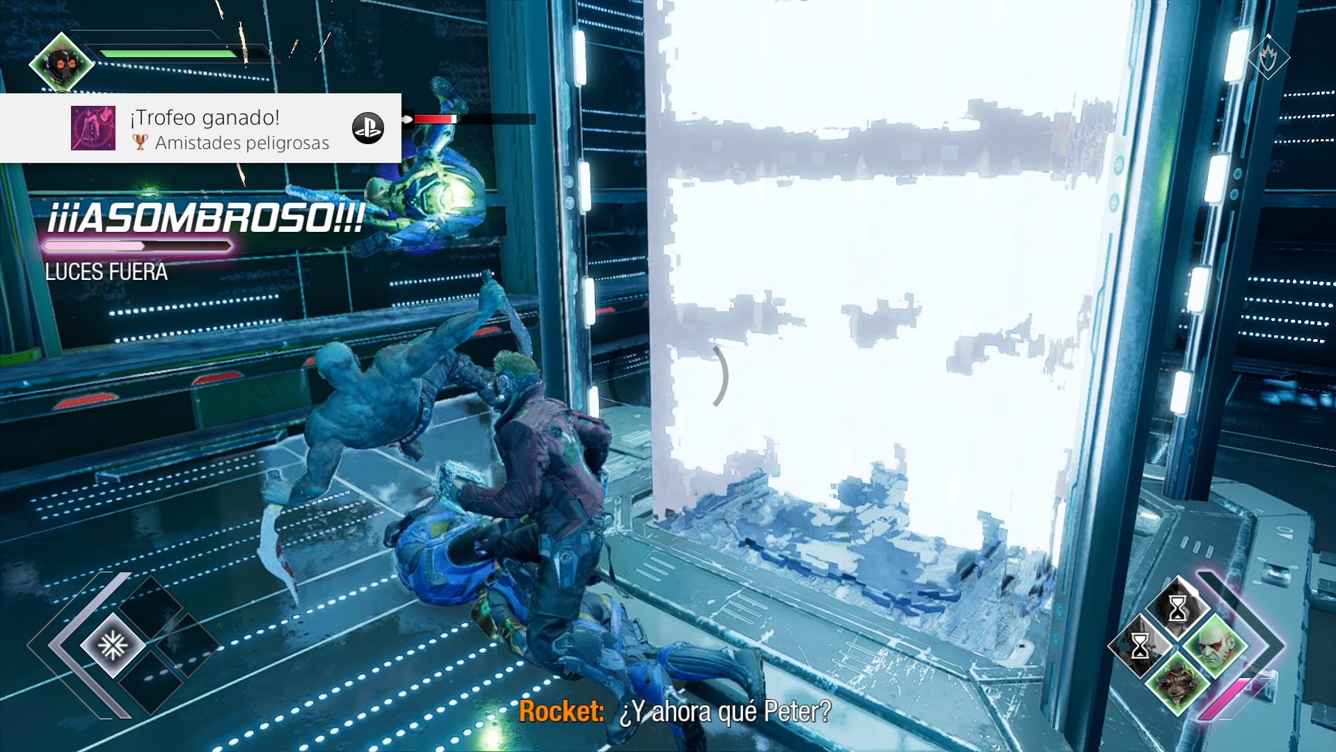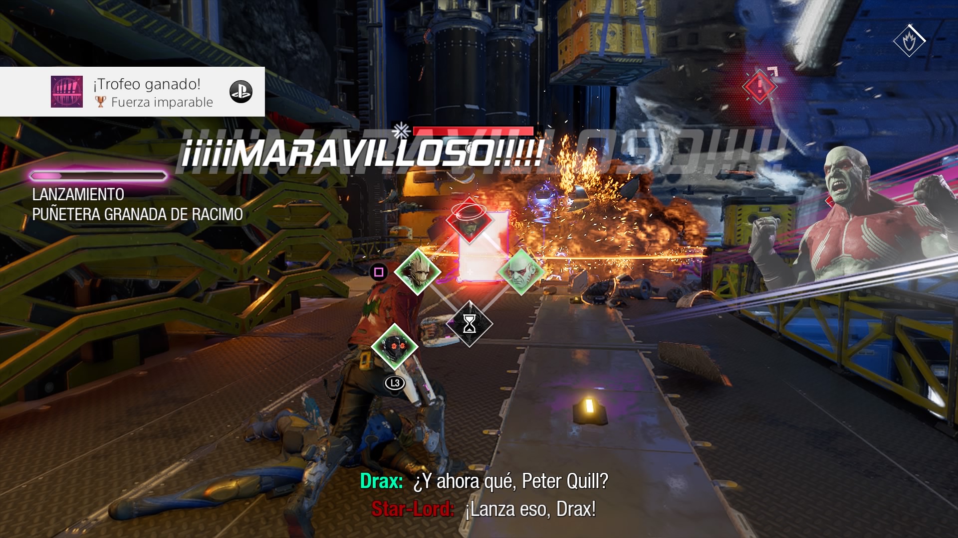 El otro aspecto a destacar sin duda alguna es a nivel sonoro. Nos encontraremos con efectos de sonido muy bien implementados y con un doblaje más que correcto que casa bastante bien con la sincronización de habla de los personajes, tanto en castellano como en inglés. Pero donde más destaca esta parte del título es en esa selección de temazos de los años 80 que conforman la tracklist del walkman de Peter Quill, tanto durante el desarrollo de la trama como durante los combates, sobre todo después de esa reunión de equipo de la que hemos hablado en párrafos anteriores, haciendo que el frenetismo del combate se vea aderezado con grandes temas como Take On Me de a-Ha o The Final Countdown de Europe  y podamos repartir mamporros y pegar tiros laser con bastante buen ritmo.
