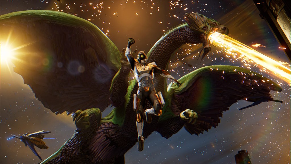 A partir de aquí vamos a poder controlar de primera mano a Peter Quill desde el principio del título, conociendo como empezó todo tras ser secuestrado en la Tierra y acabar liderando a este estrafalario grupo de seres intergalácticos contra una secta que intenta extender su maléfica religión por todos los rincones de la galaxia. Nos encontraremos tras visualizar las primeras cinemáticas de la historia con un juego de acción en tercera persona en el que manejaremos al protagonista. Así vamos a disponer de varios botones de acción que nos permitan pegar bastantes tiros por medio de los blasters duales a la par de poder recargarlos cuando la munición sea escasa, realizar ataques cuerpo a cuerpo, esquivar golpes enemigos gracias a las famosas botas propulsoras, aprovechar las habilidades para realizar ataques mucho más potentes o bien dar ordenes a nuestro equipo para salir airosos de los muchos combates en los que nos vamos a ver inmersos. Sí, solo vamos a poder manejar al líder de los Guardianes de forma principal, pero vamos a poder organizar a nuestro equipo de manera que el trabajo en grupo sea eficaz para poder avanzar en la historia.