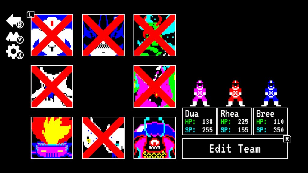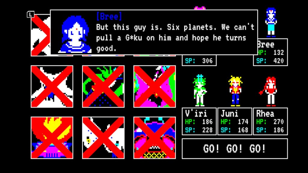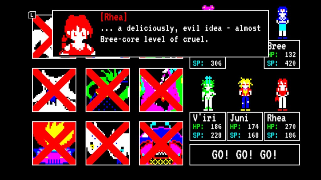 Vamos a poder acceder a cualquiera de los 8 enemigos disponibles en pantalla desde un principio, enfrentándonos cara a cara con un boss mediante un combate por turnos. Esto derivará en que en un inicio no sabremos las debilidades de ninguno de ellos por lo que vamos a estar destinados al fracaso y la derrota más de una vez. Y es aquí donde destaca el juego, pues al ponernos en la piel de la líder de este estrafalario grupo recibiremos tras cada dura derrota consejos de nuestras compañeras, que irán desde sabias estrategias a alocadas ideas que pueden funcionar o no, pero que al menos nos sacarán una carcajada en varios momentos.