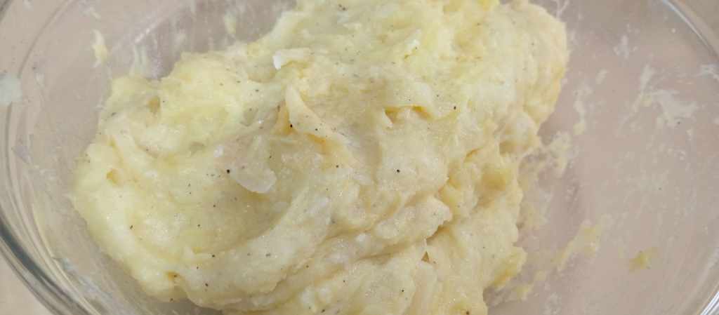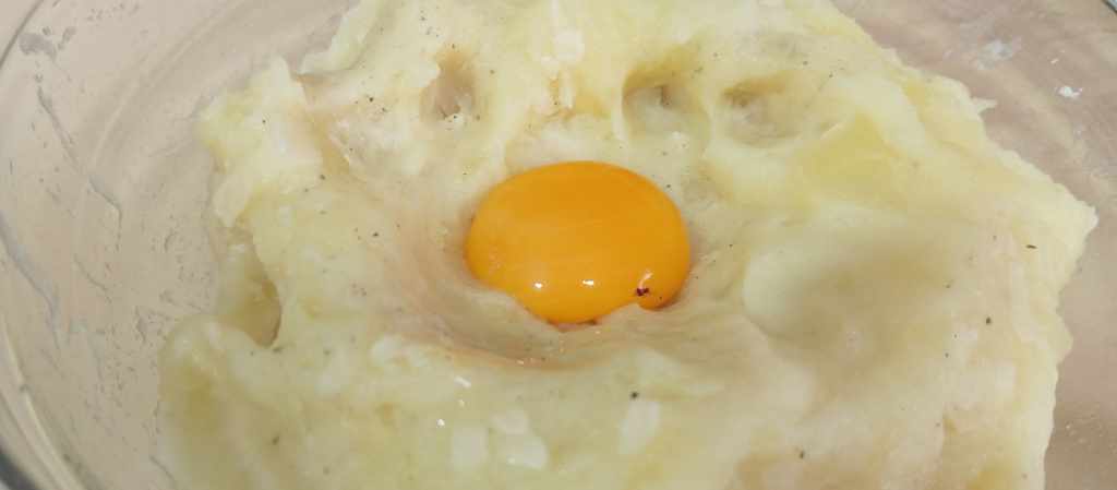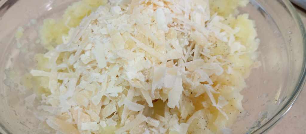 Cuando estén frías, vamos a machacarlas en un bol con la ayuda de una varilla o un machacador de patatas. A continuación, añadiremos la yema de huevo y el queso parmesano previamente rallado. Removemos bien e iremos incorporado poco a poco la harina tamizada para que se integre bien en la masa. El resultado tiene que ser una masa que no sea pegajosa, pudiendo añadir algo más de harina hasta obtener la textura deseada.