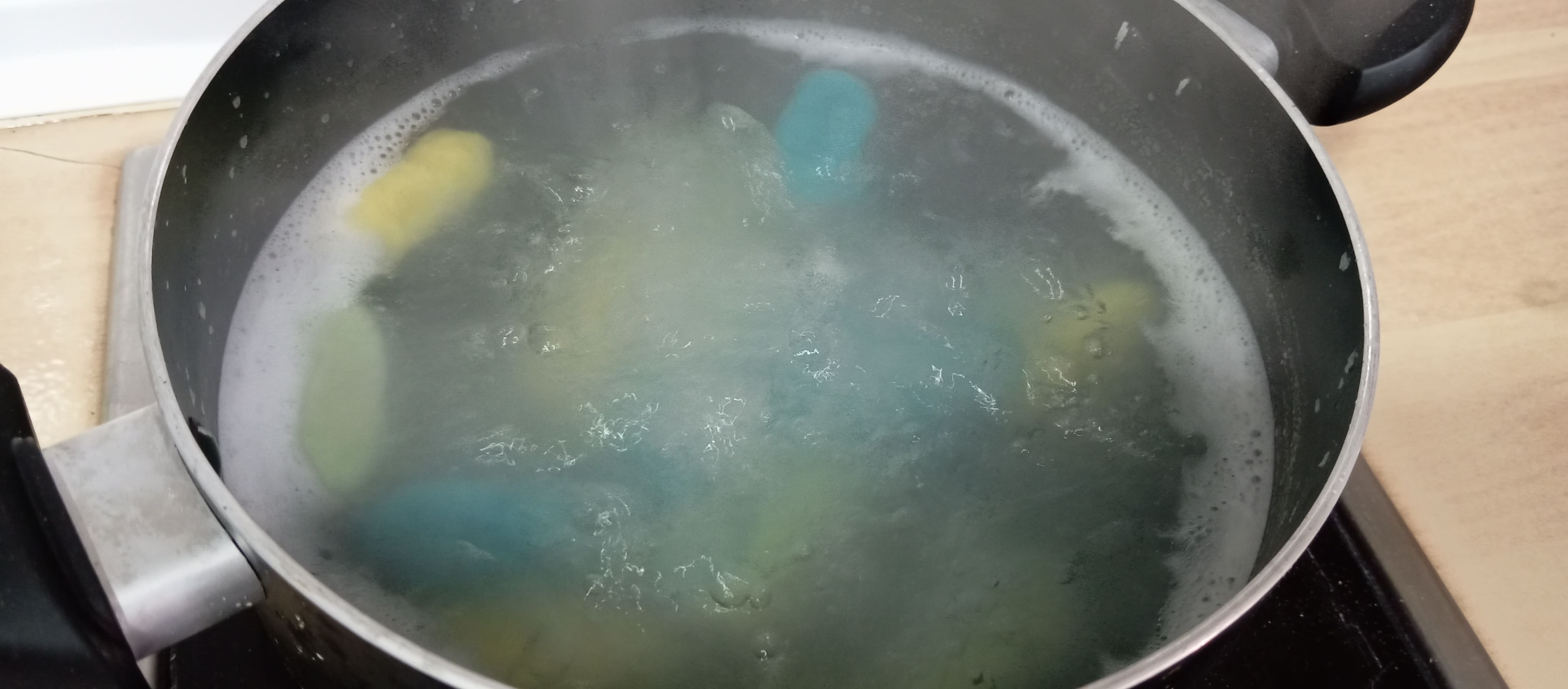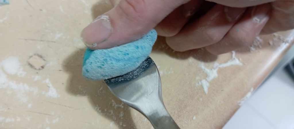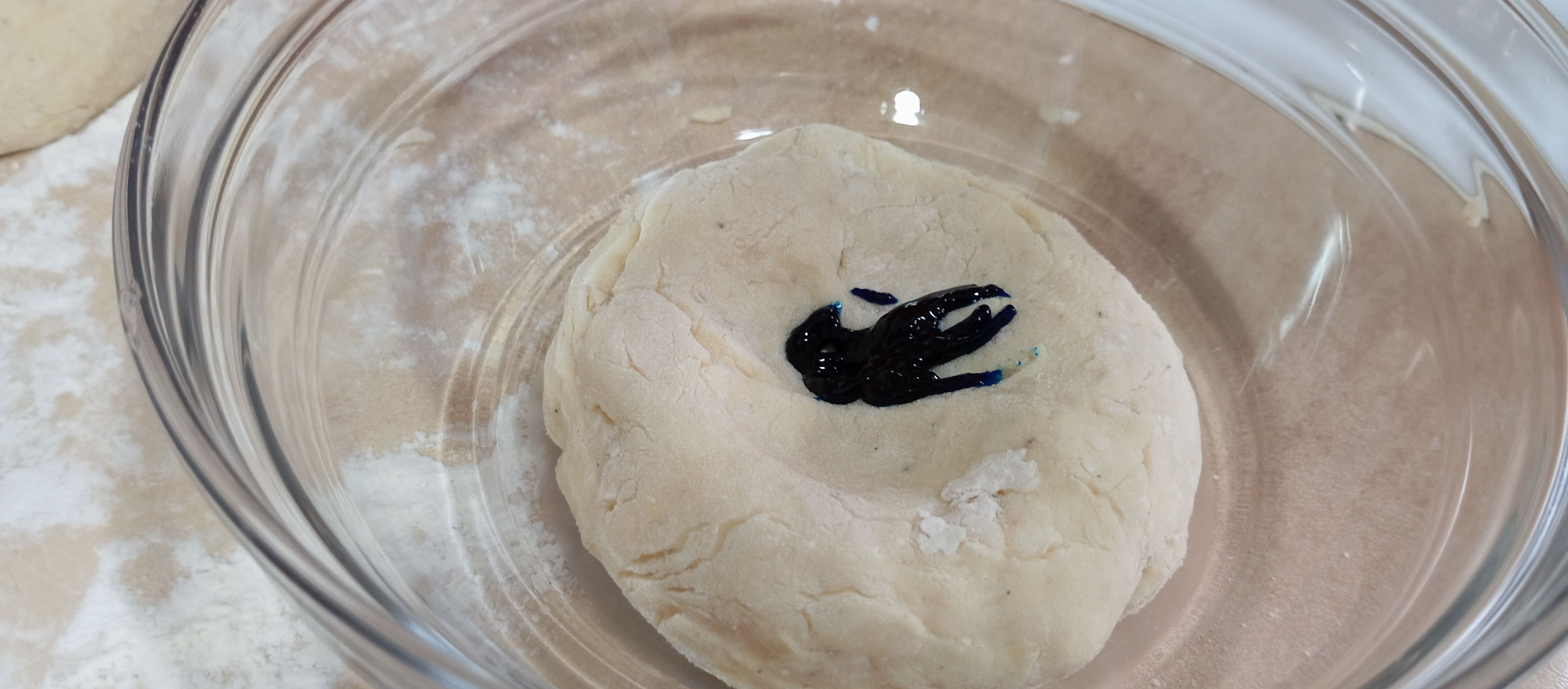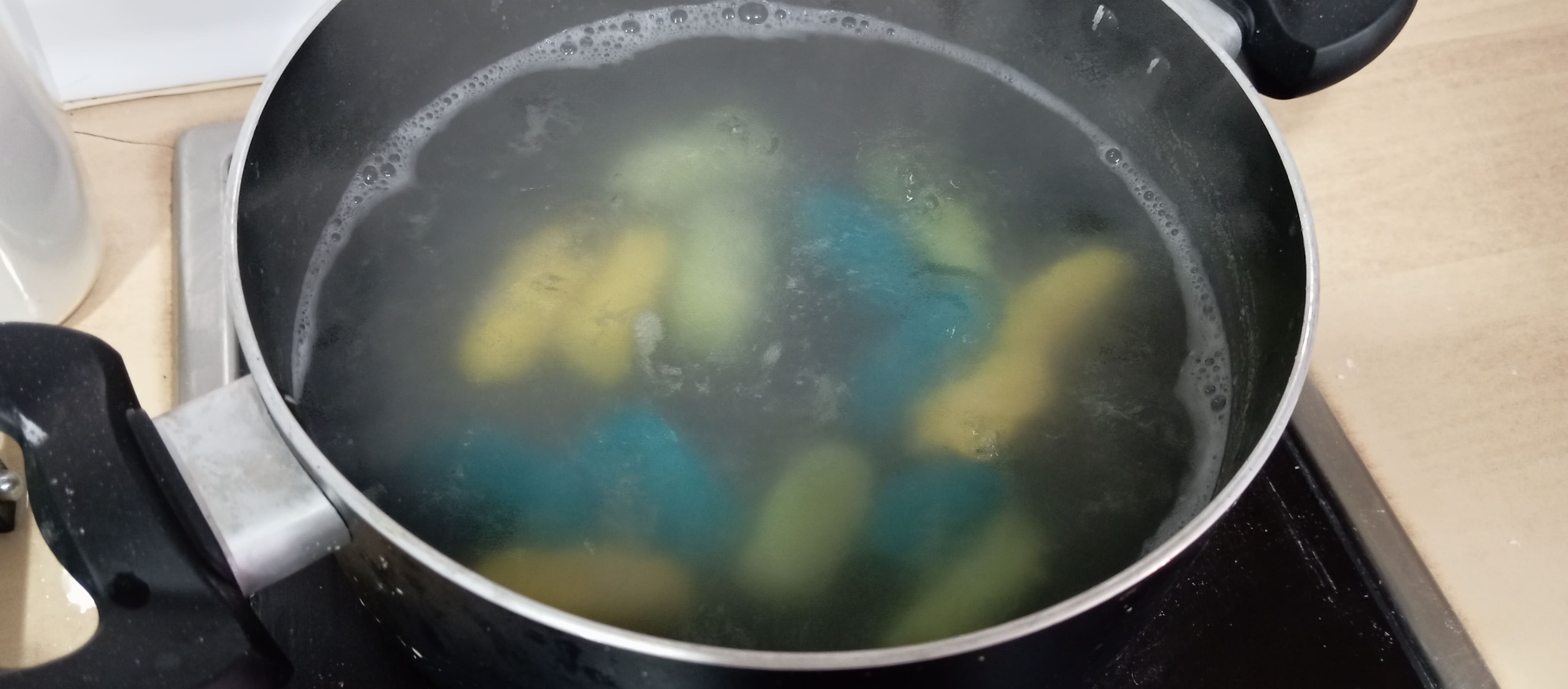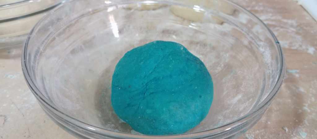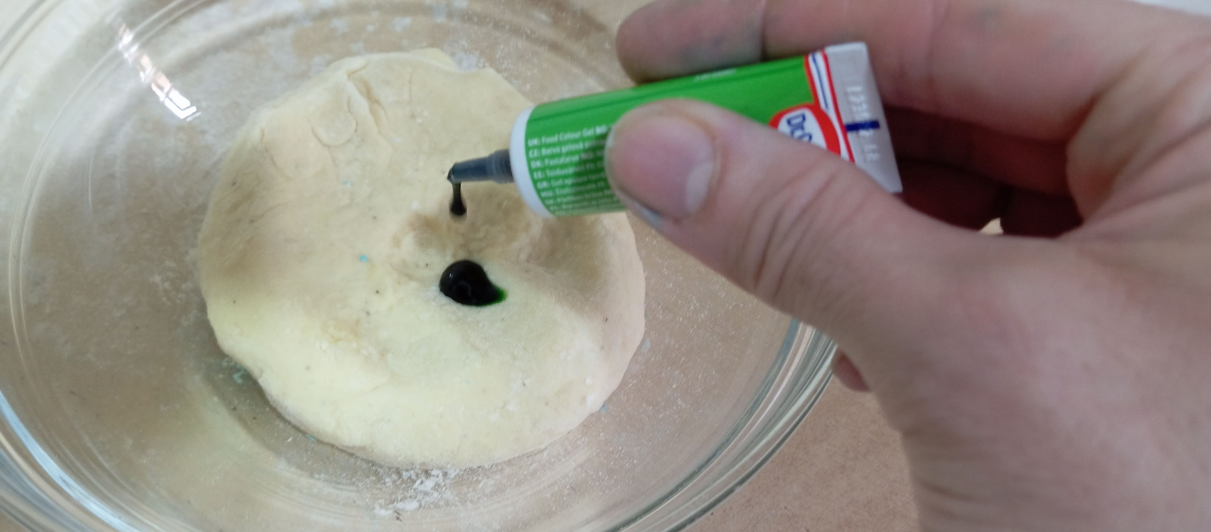 Dejamos reposar unos 5 minutos y vamos a dividirla en varias partes. A cada una de estas partes vamos a ir añadiéndole el colorante para obtener los colores que queremos, en este caso el azul (unas 25 gotas), el verde unas 15 gotas y el amarillo otras 15. Eso sí, deberemos de tener en cuenta la marca de colorante que utilicemos pues el tono de colores variará de una a otra y la cantidad a utilizar puede ser mayor o menor, por lo que lo mejor es ir probando a ojo. También vamos a tener en cuenta que al utilizar colorantes líquidos o de crema vamos a tener que ir echando algo más de harina a la masa.