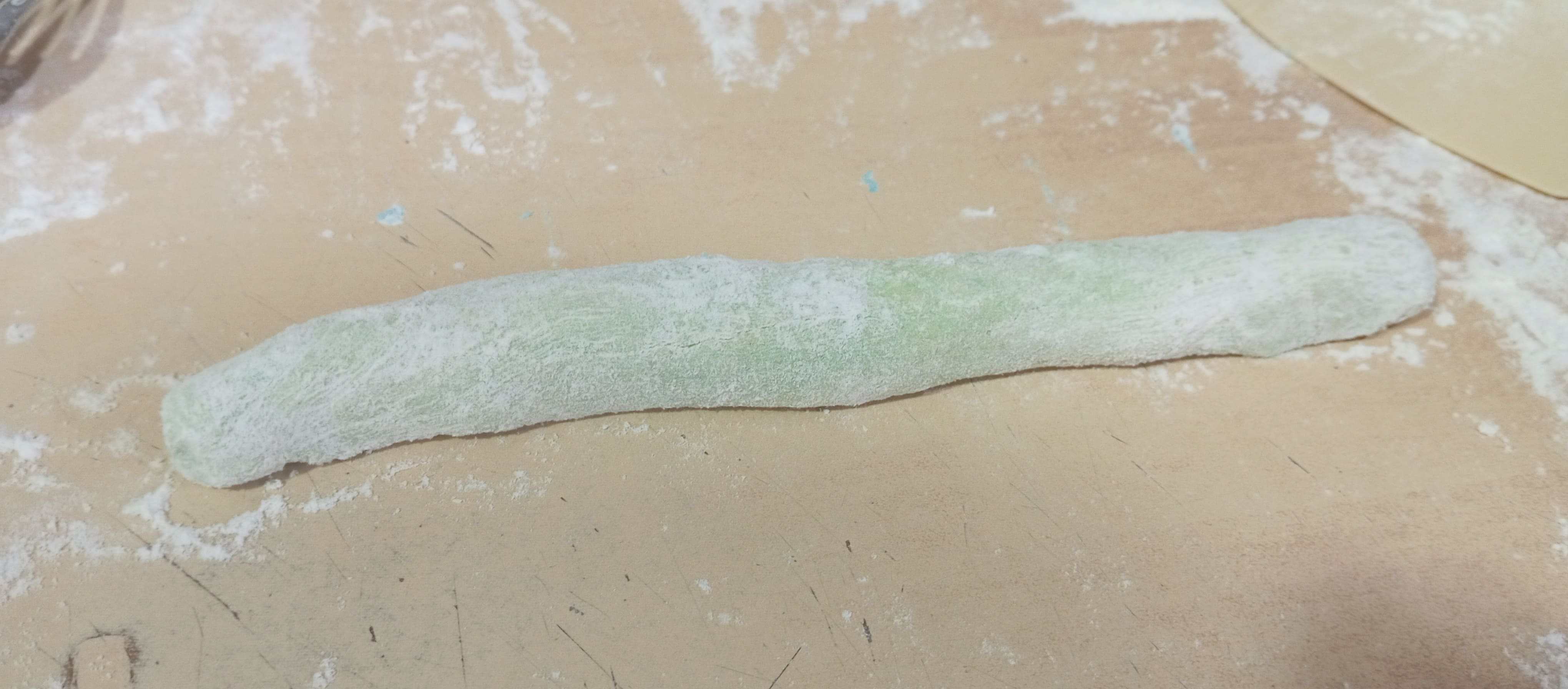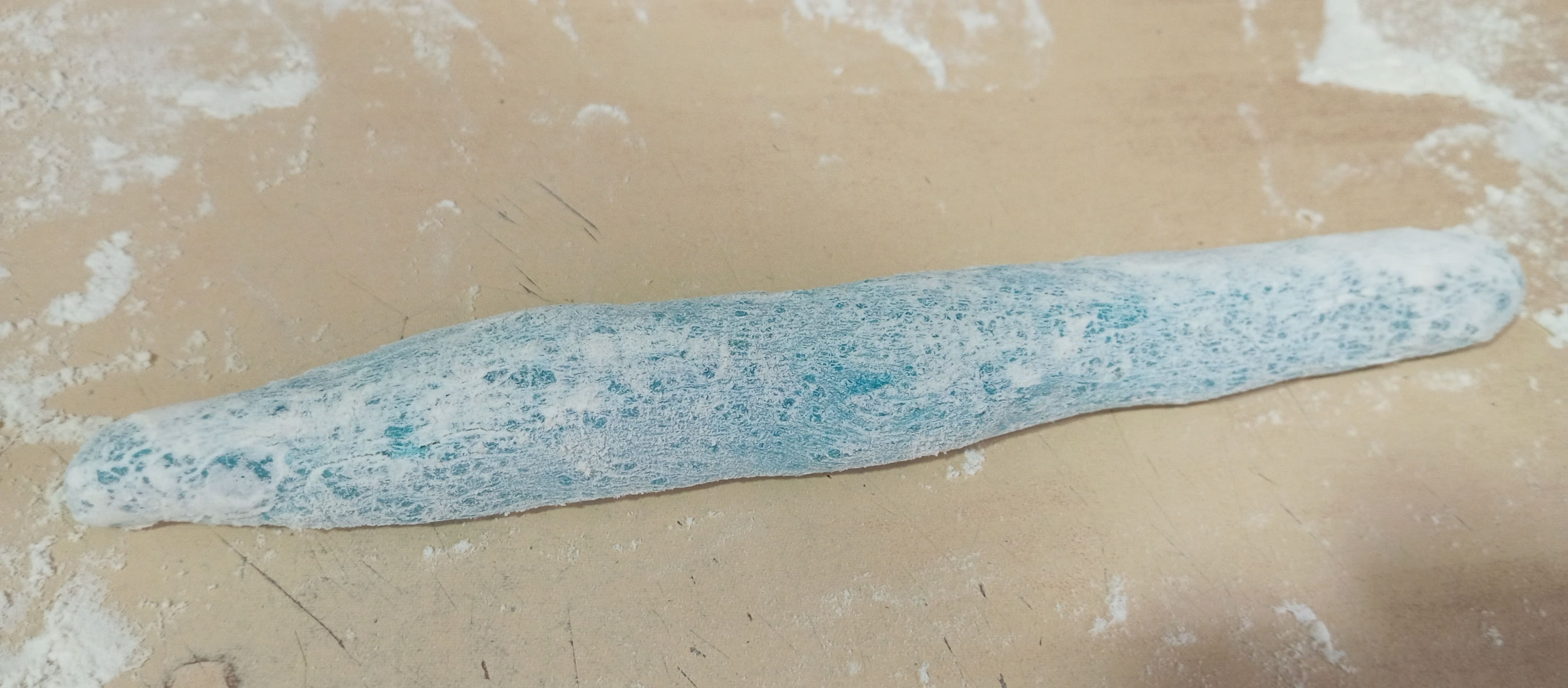 Es importante que durante el uso de este tipo de masas el uso de más harina de trigo en la superficie donde vamos a manejarlas para evitar que se peguen o se rompan. Ahora, vamos a cualquiera de las masas, haciendo un cilindro alargado como cuando jugábamos con plastilina en el cole.