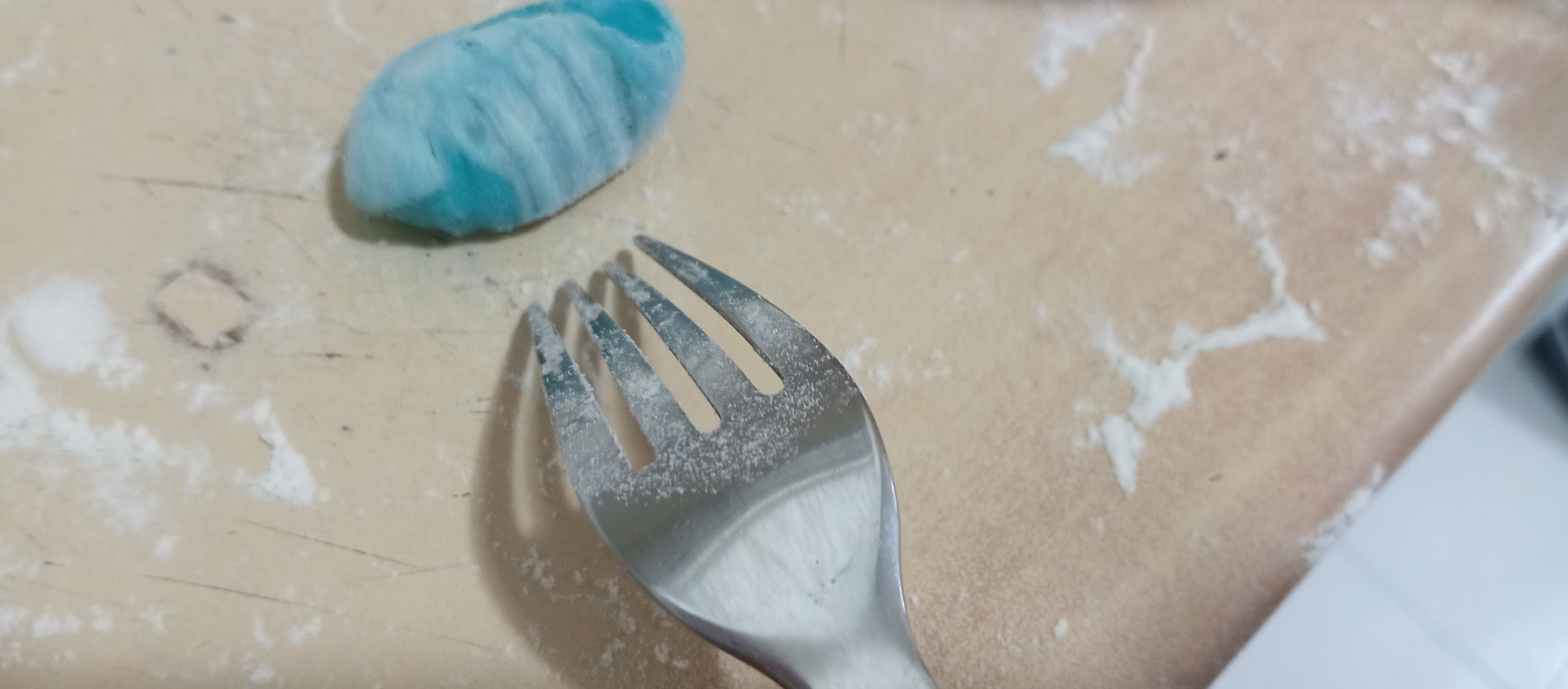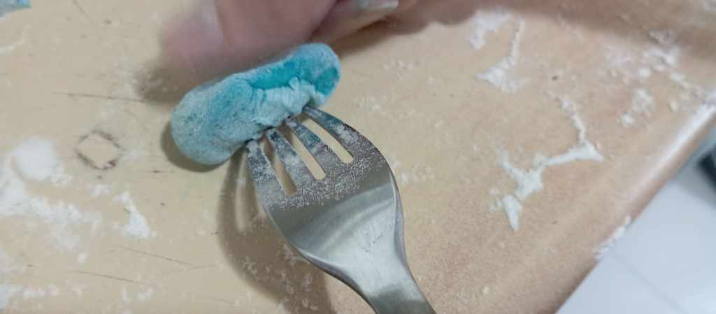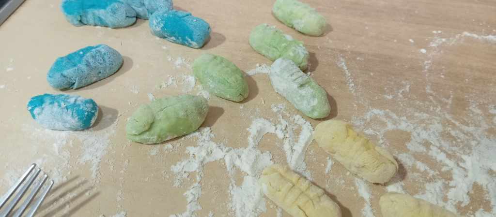 Mientras el agua llega a hervir, vamos a pasar las porciones de masa por la parte trasera de un tenedor para darle la forma a los ñoquis, previamente boleados con la mano y empujándolos por la línea del cubierto para que se marquen. También podéis darle la forma con la mano y presionar con las puntas del tenedor, eso ya a vuestro gusto o con la estrategia establecida por vuestro grupo.