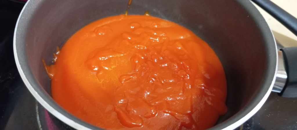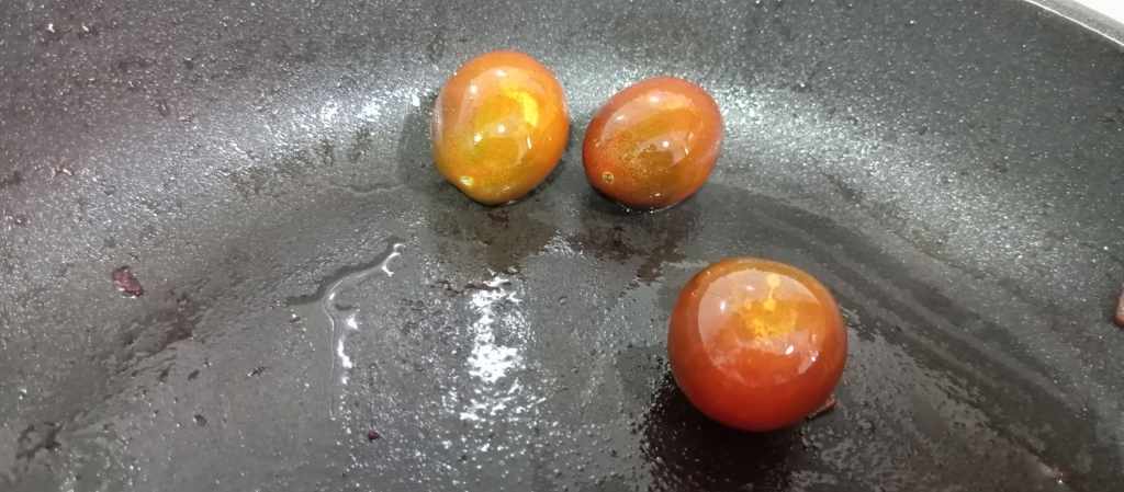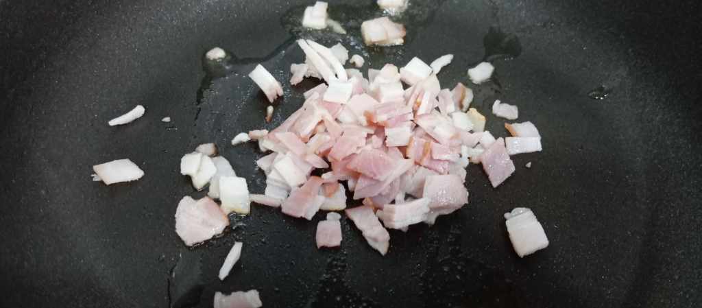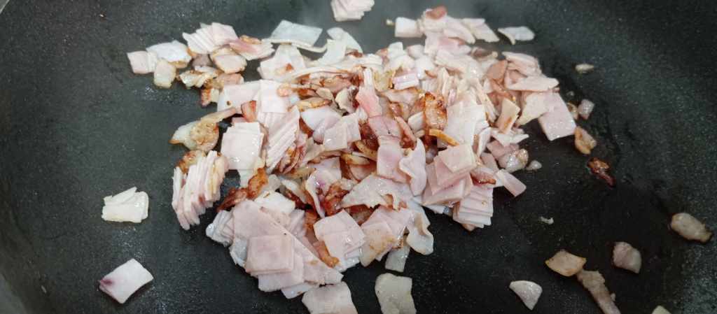 Cortamos ahora el bacon y el york en taquitos y los salteamos con un poquito de aceite. Una vez ligeramente dorados los retiramos del fuego y damos otro salteado a los tomates cherry. Por otro lado, vamos a calentar la salsa de tomate para tenerla lista para servir.