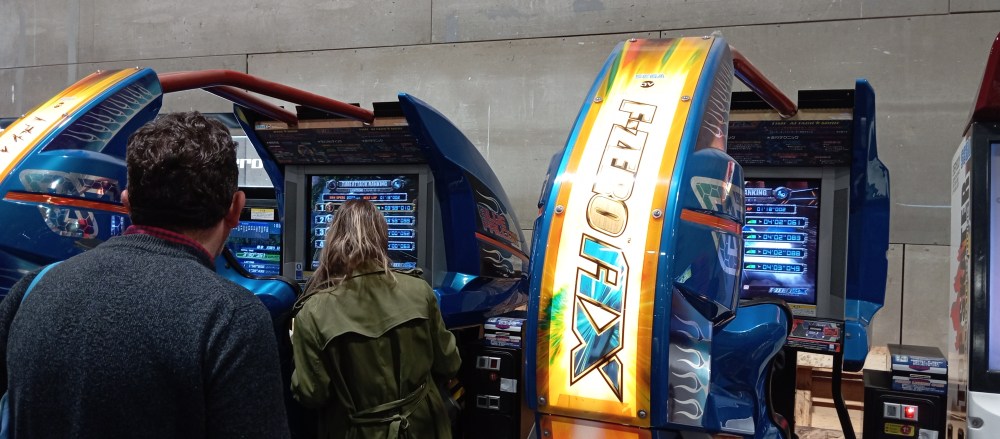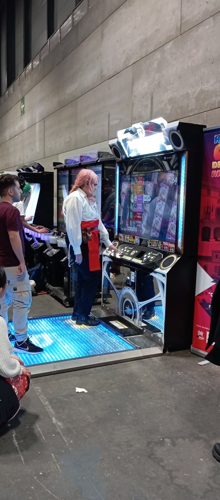 Olvidándonos ya de este pequeño bache que poco/ningún impacto generó en nuestras carteras al no comprar nada, seguimos disfrutando de la otra parte central del pabellón donde nuevamente pudimos disfrutar del arte de más artistas y dibujantes y encontrándonos a un lateral con bastantes máquinas recreativas que ya nos sonaban bastante familiares al pertenecer a la asociación MIKADO GAME CENTER, donde más que complacernos de primera mano con disfrutar de este tipo de máquinas nos quedamos anonadados por el gran nivel de algunas personas en juegos dedicados al baile y/o rítmicos, siendo algunos muy top a la hora de moverse.