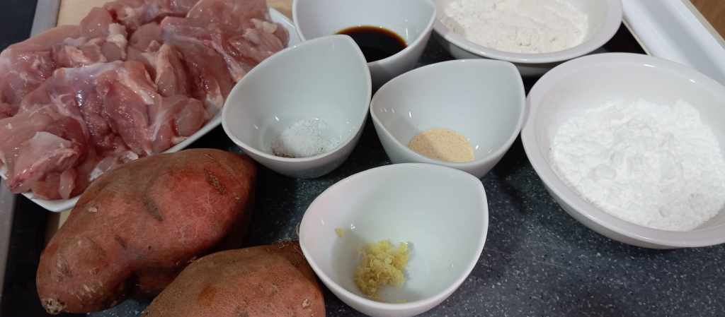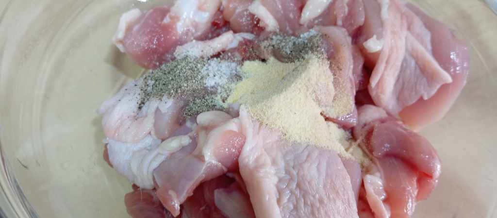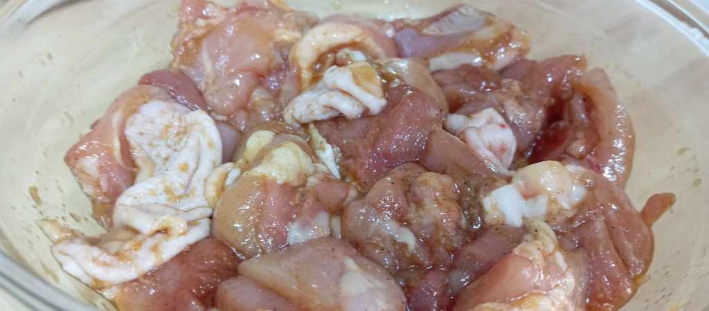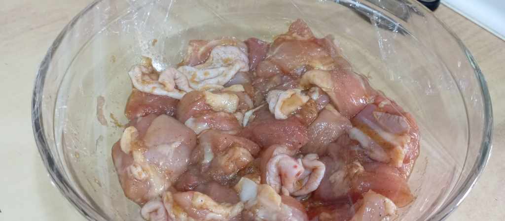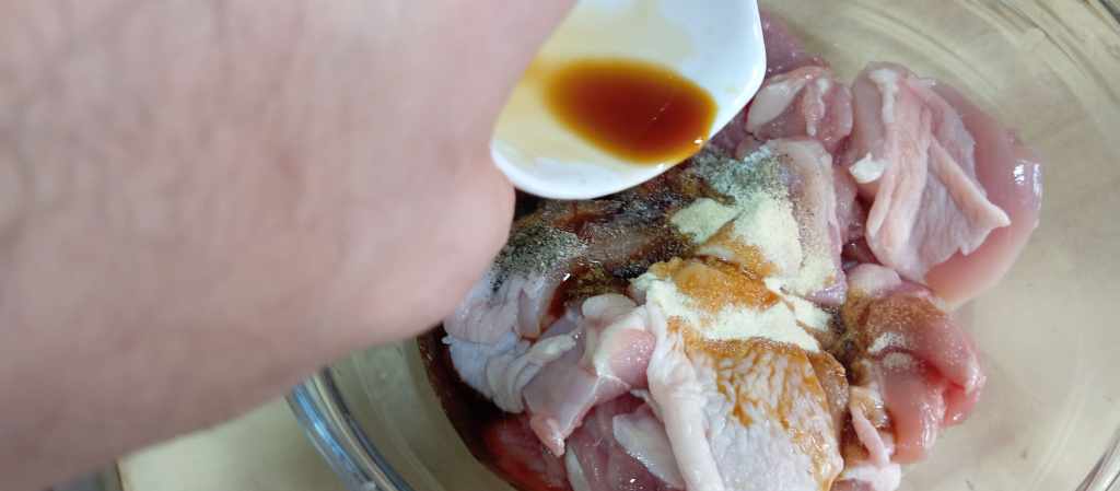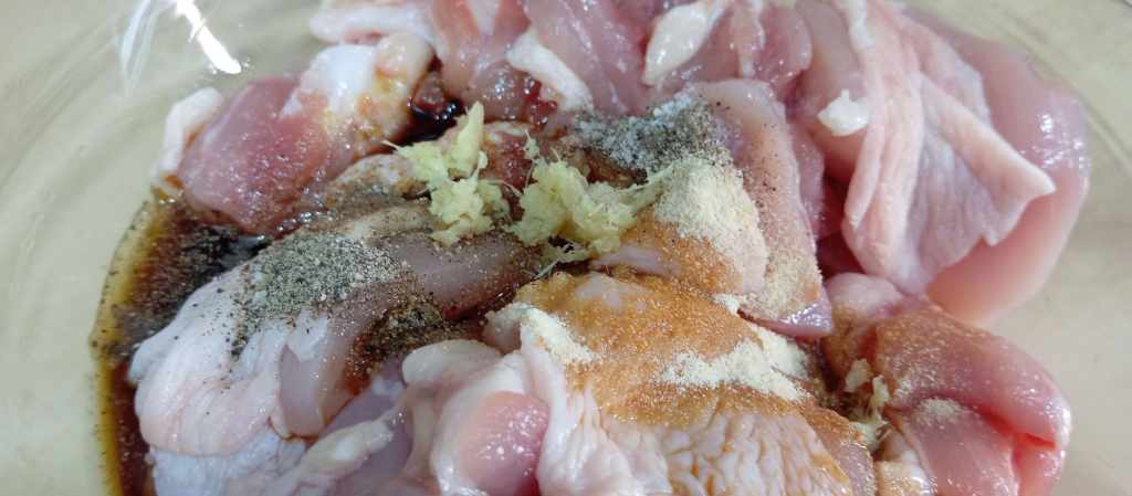 Primero, vamos a cortar el pollo en trozos de bocado. Ahora lo vamos a poner en un bol con el la sal y la pimienta al gusto, el jengibre fresco rallado, la soja y el ajo en polvo. Removemos bien para que se integren todos los ingredientes, filmamos y lo dejamos reposar en la nevera durante media hora.